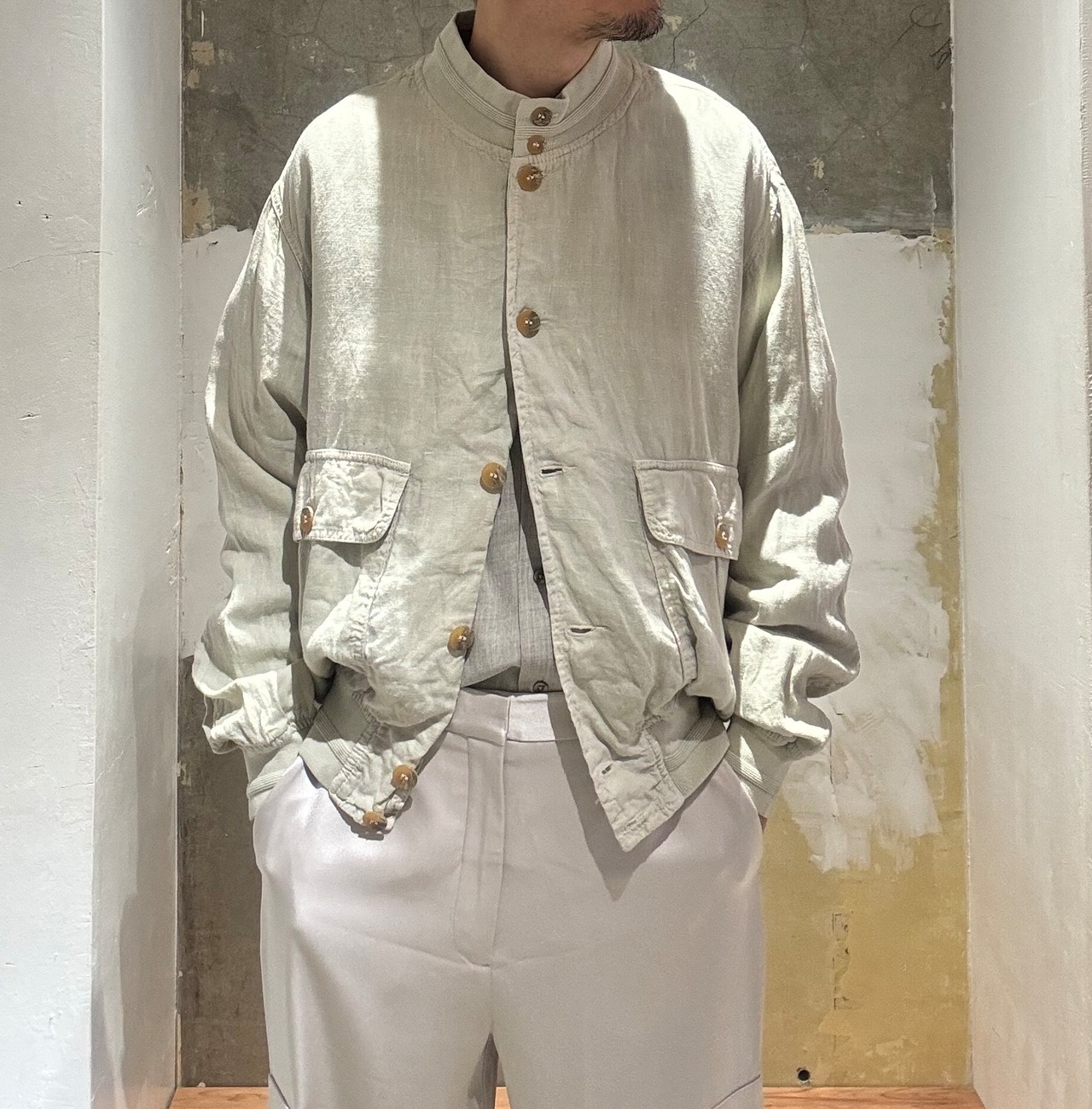 1920年代にアメリカ空軍で採用されたA-1フライトジャケットが元ネタになっているジャケットです。素材がリネンでアイボリーで作るあたりがアメリカにはない洗練された感じがあって良いですね。