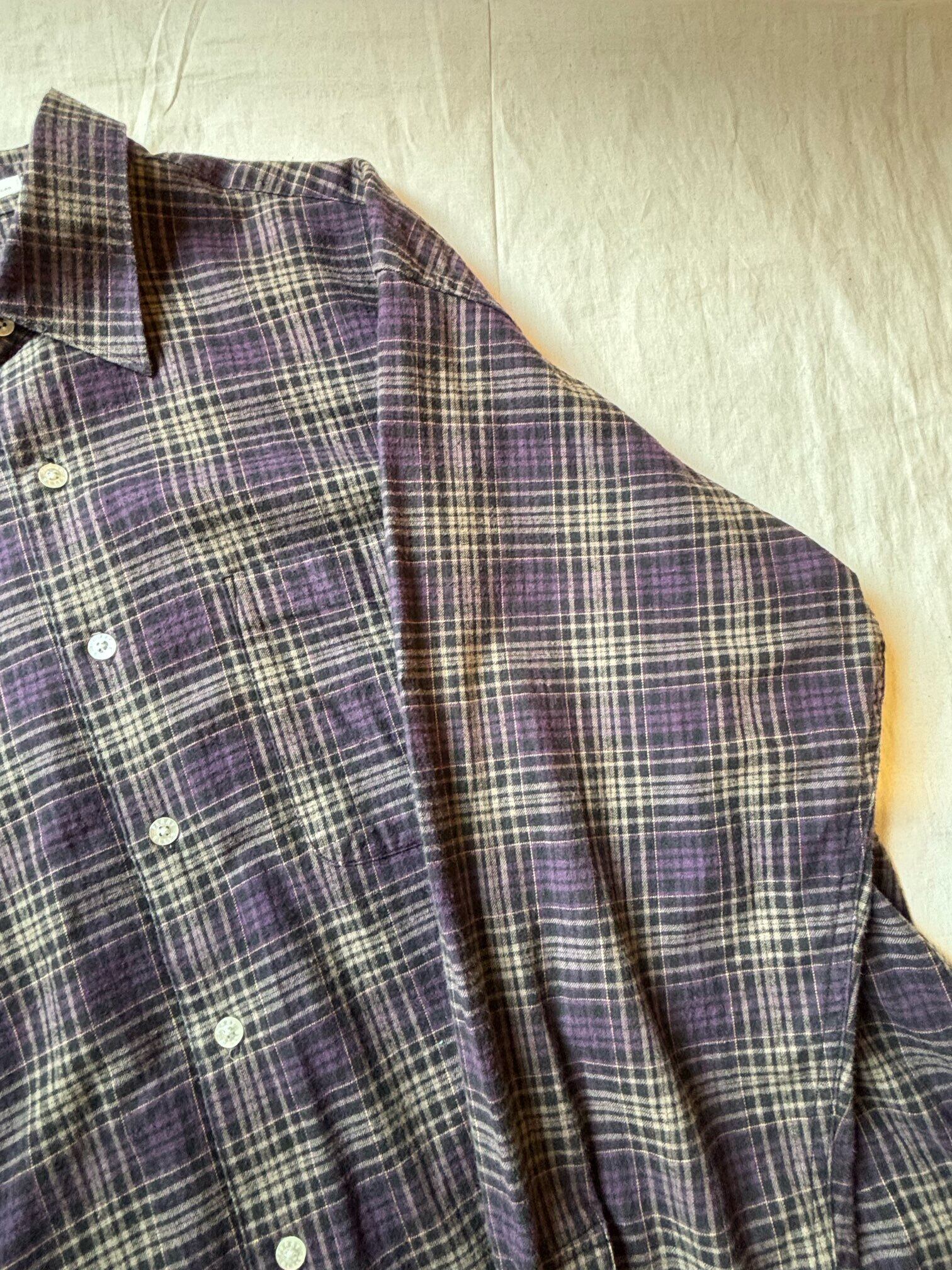 こちらのシャツはパープル×ブラウンの絶妙なチェックで、とても色柄がよく、大人っぽいチェックなので子供っぽくならずにとても良いチェックだと思います。