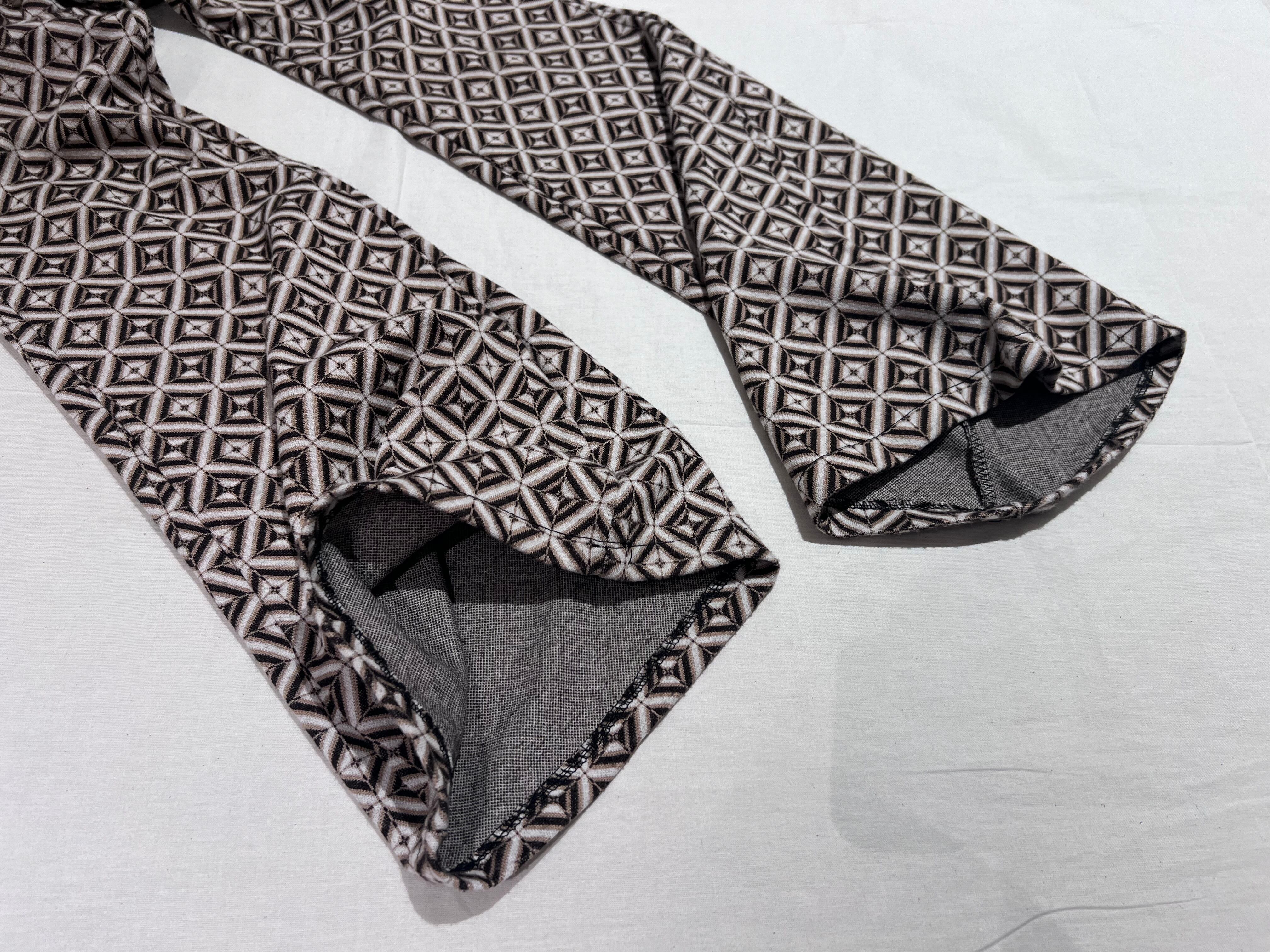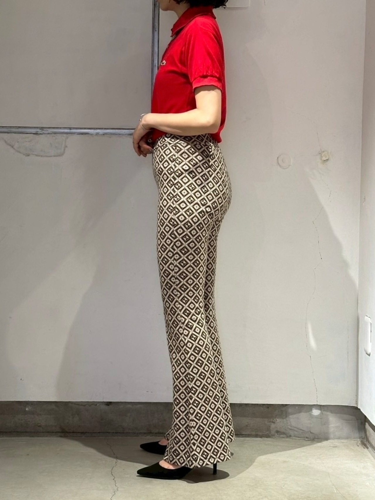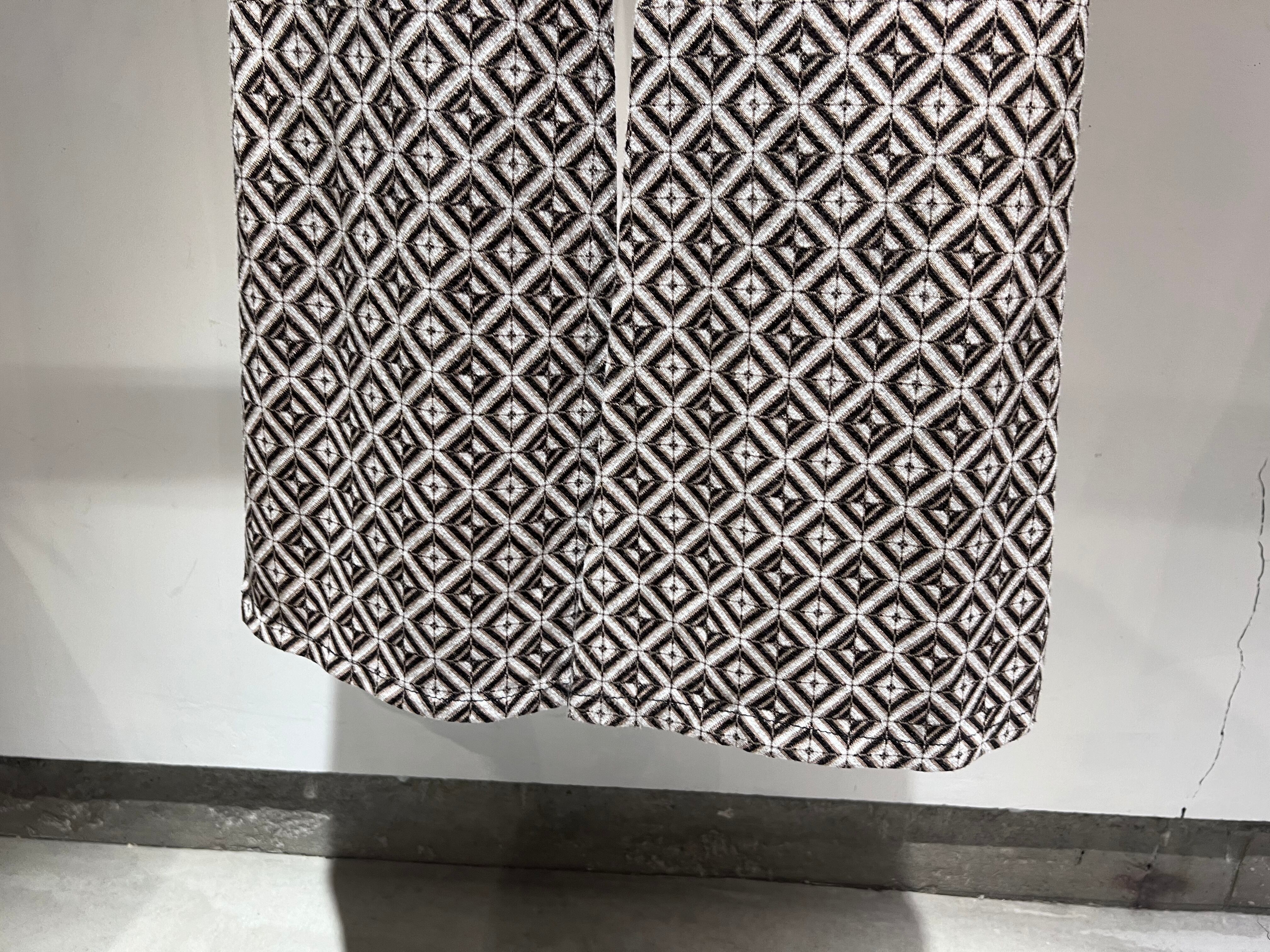 こちらは総柄のフレアとまたクセの強いディテールですが、色が落ち着いているのでコーディネートに馴染ませやすいかと思います。