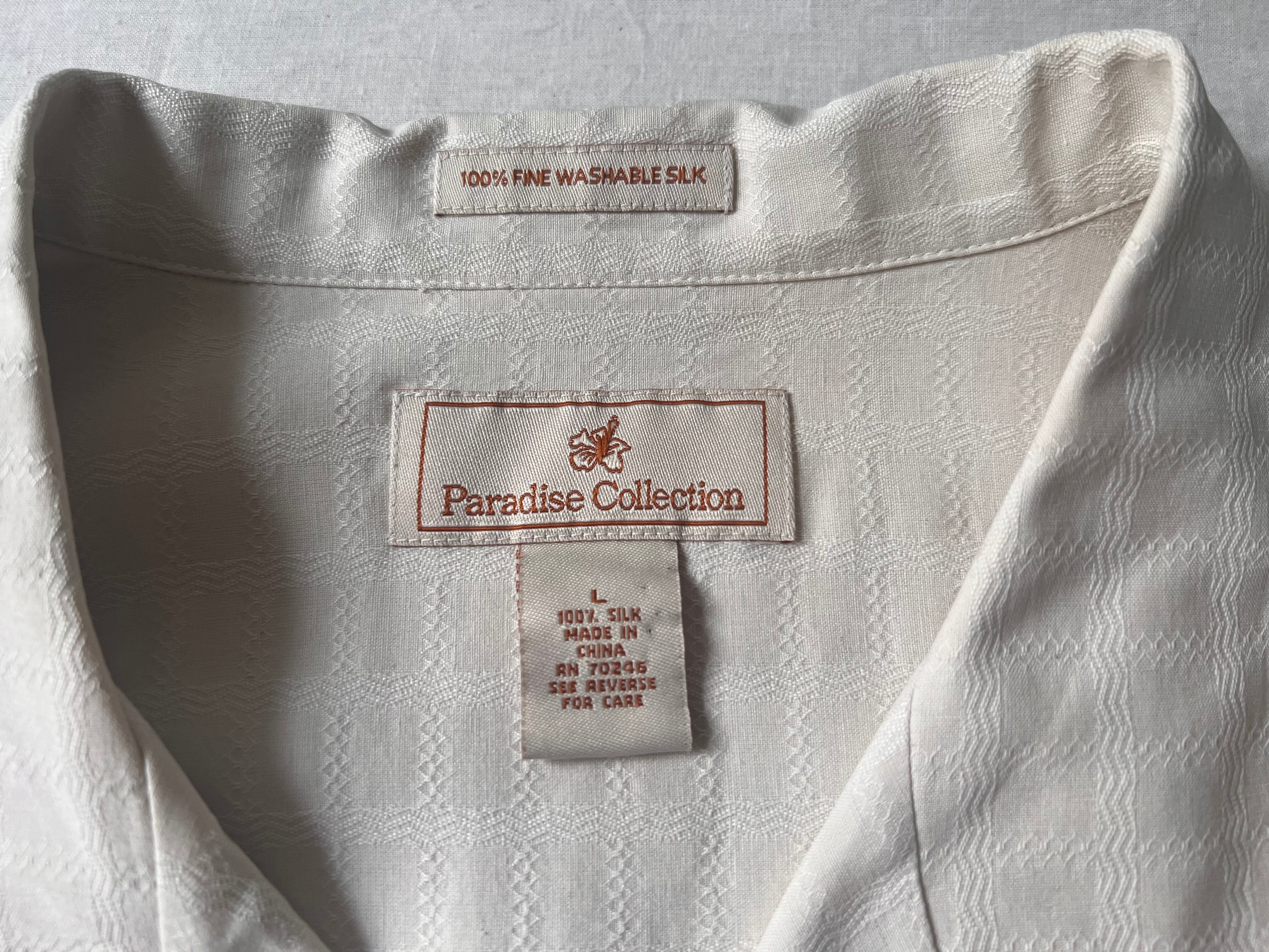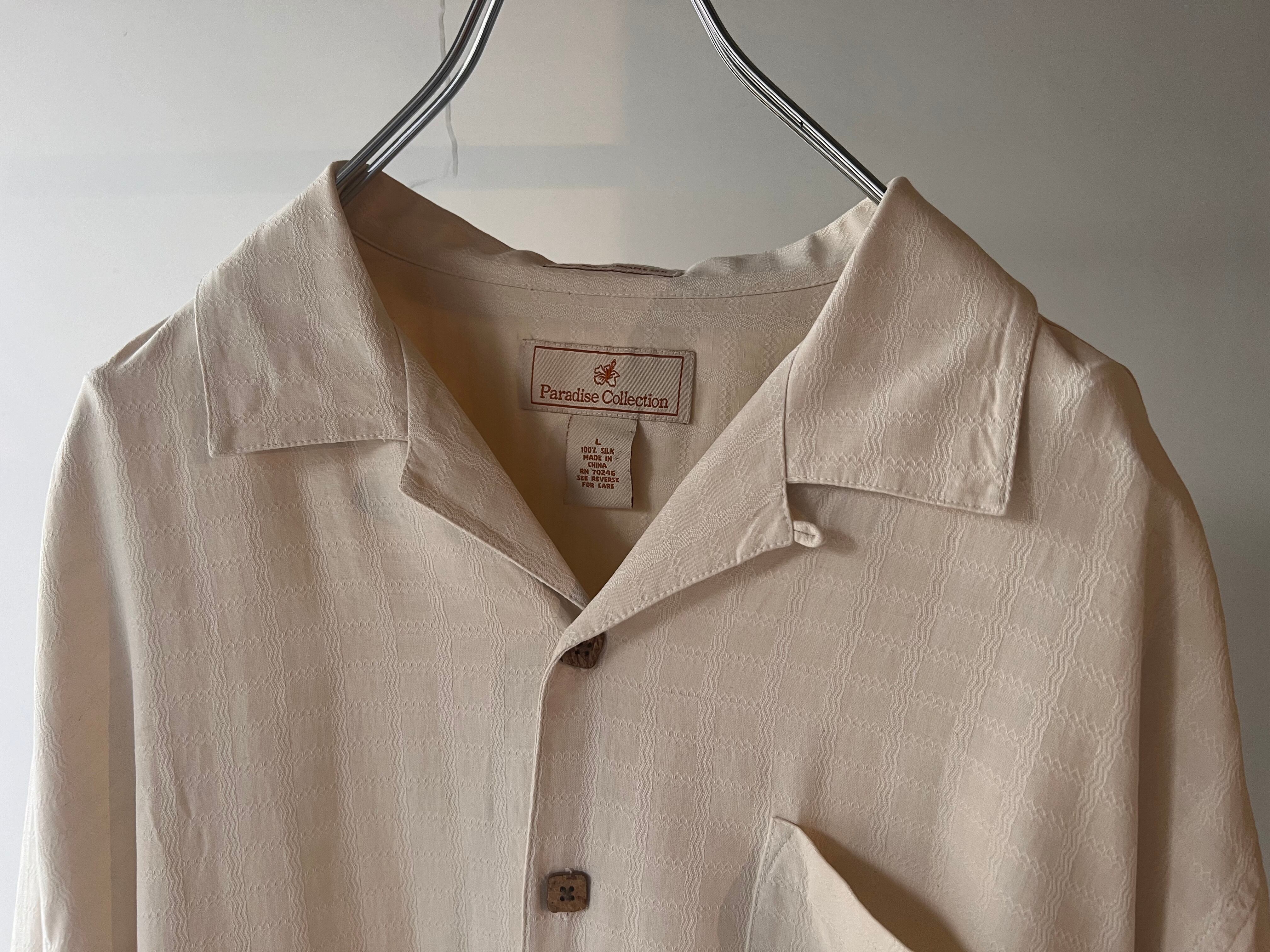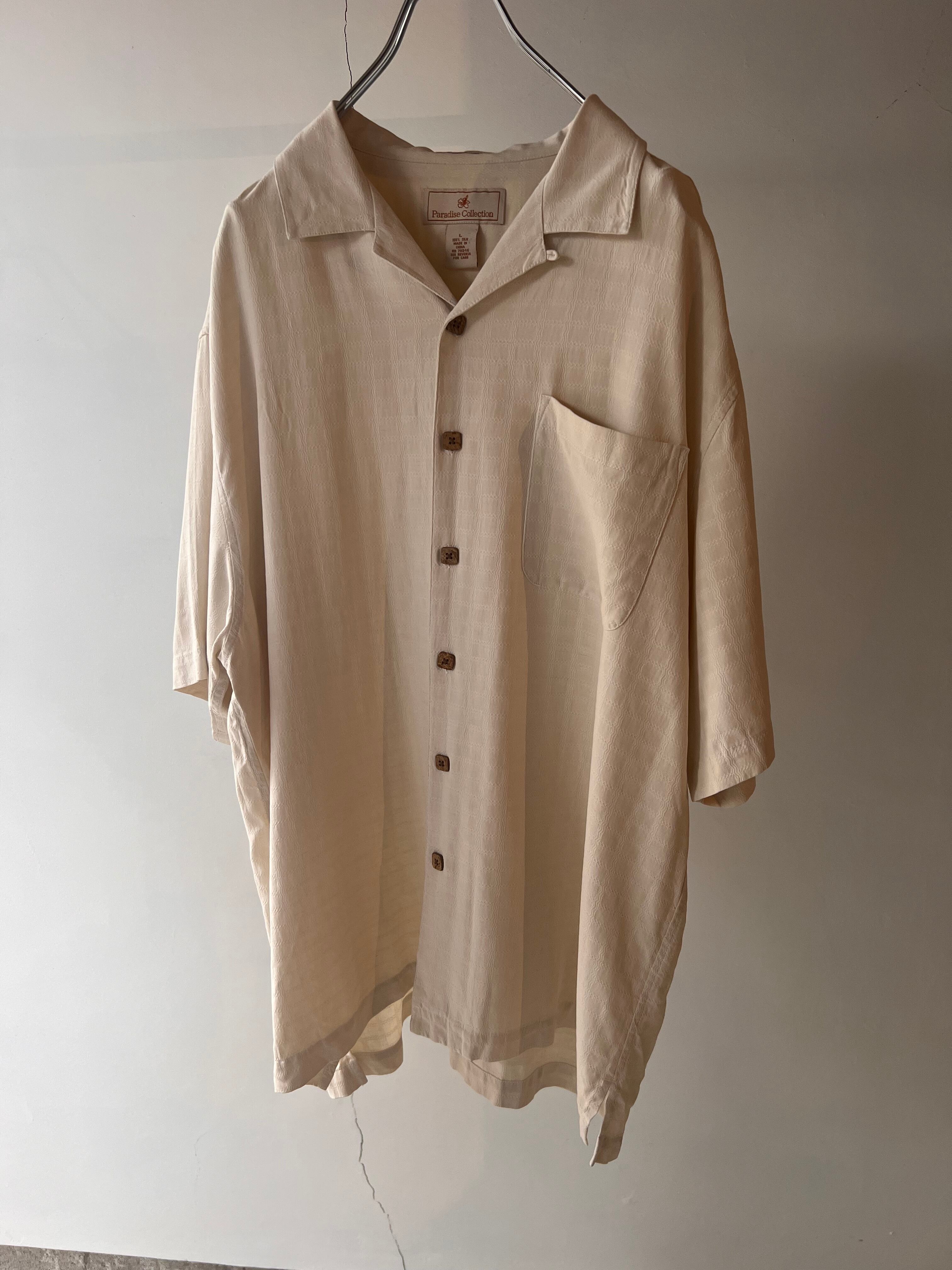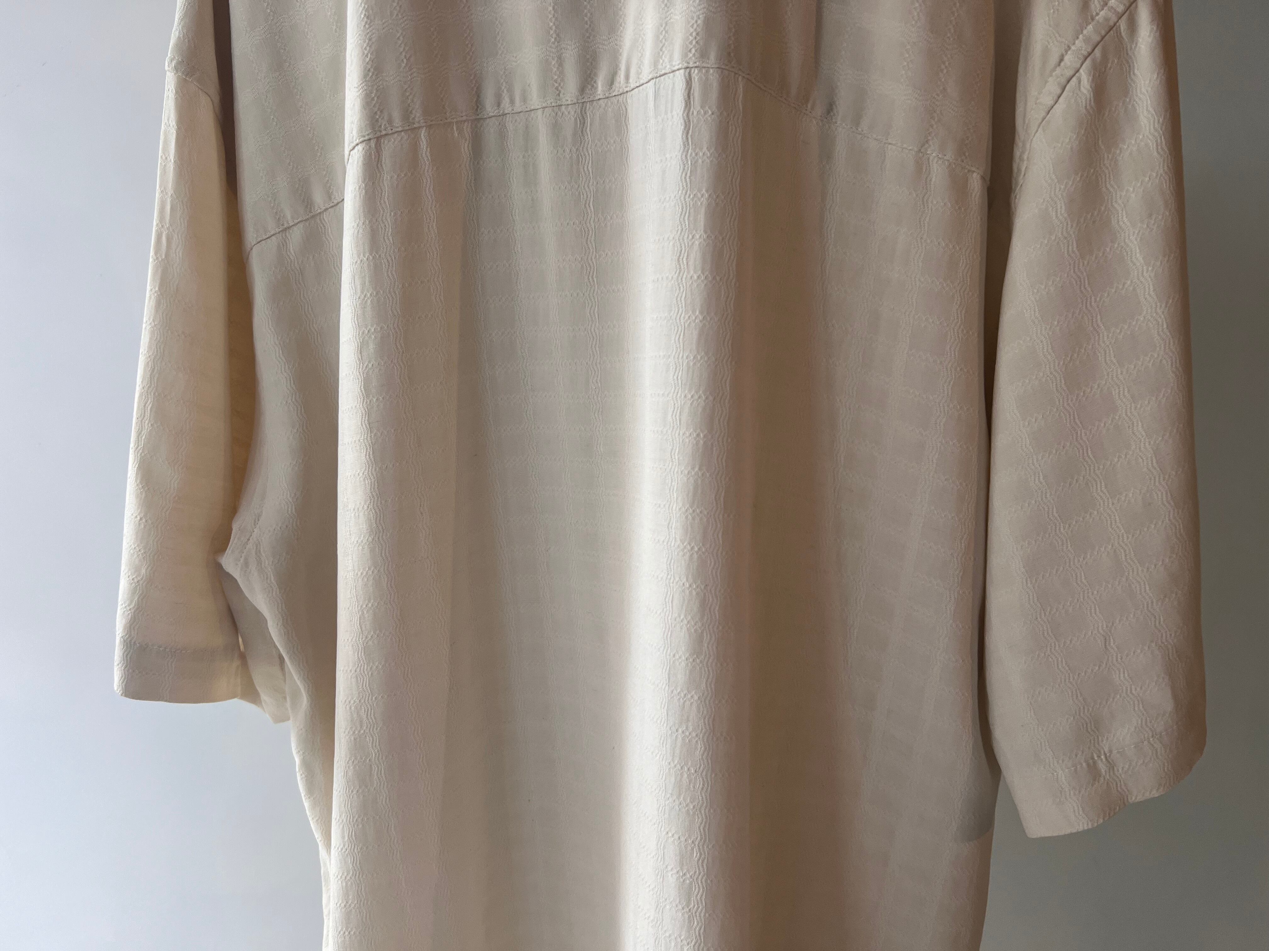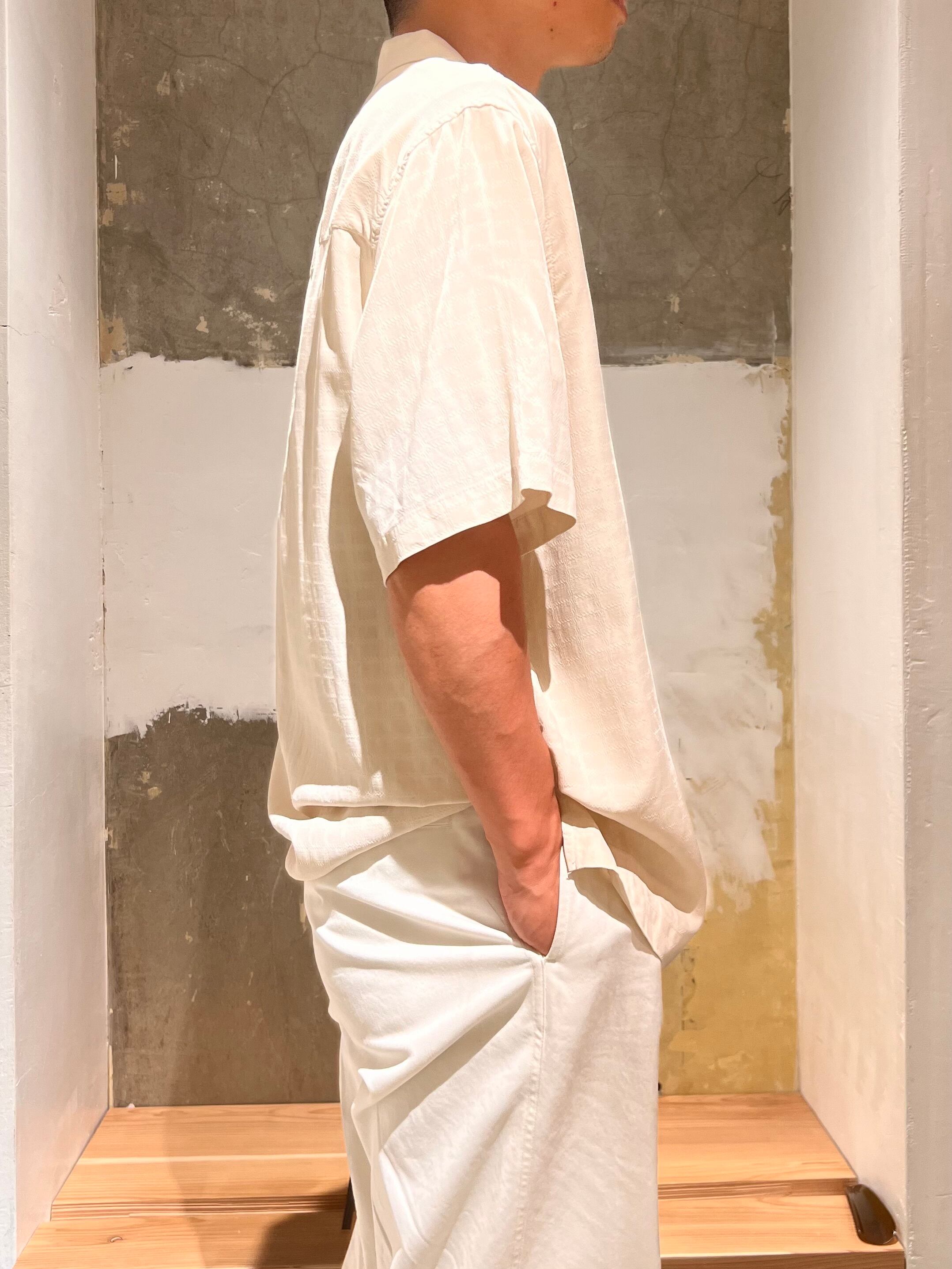 シルクの生地に織柄が入っており、なんとも上品な奥行きを感じます。さらにウォッシャブルシルクが使われているので、お手入れもしやすく夏にオススメの1着です。