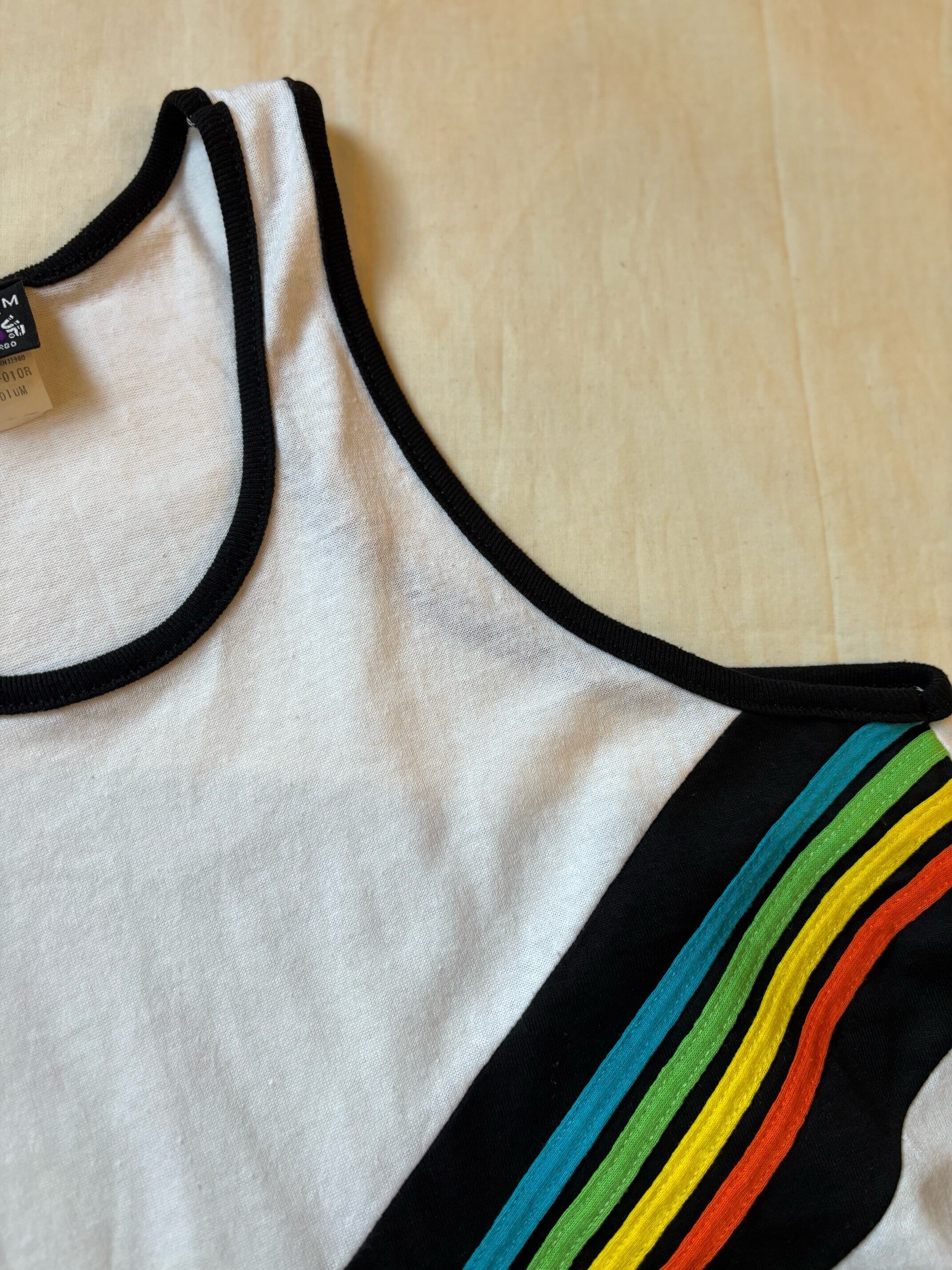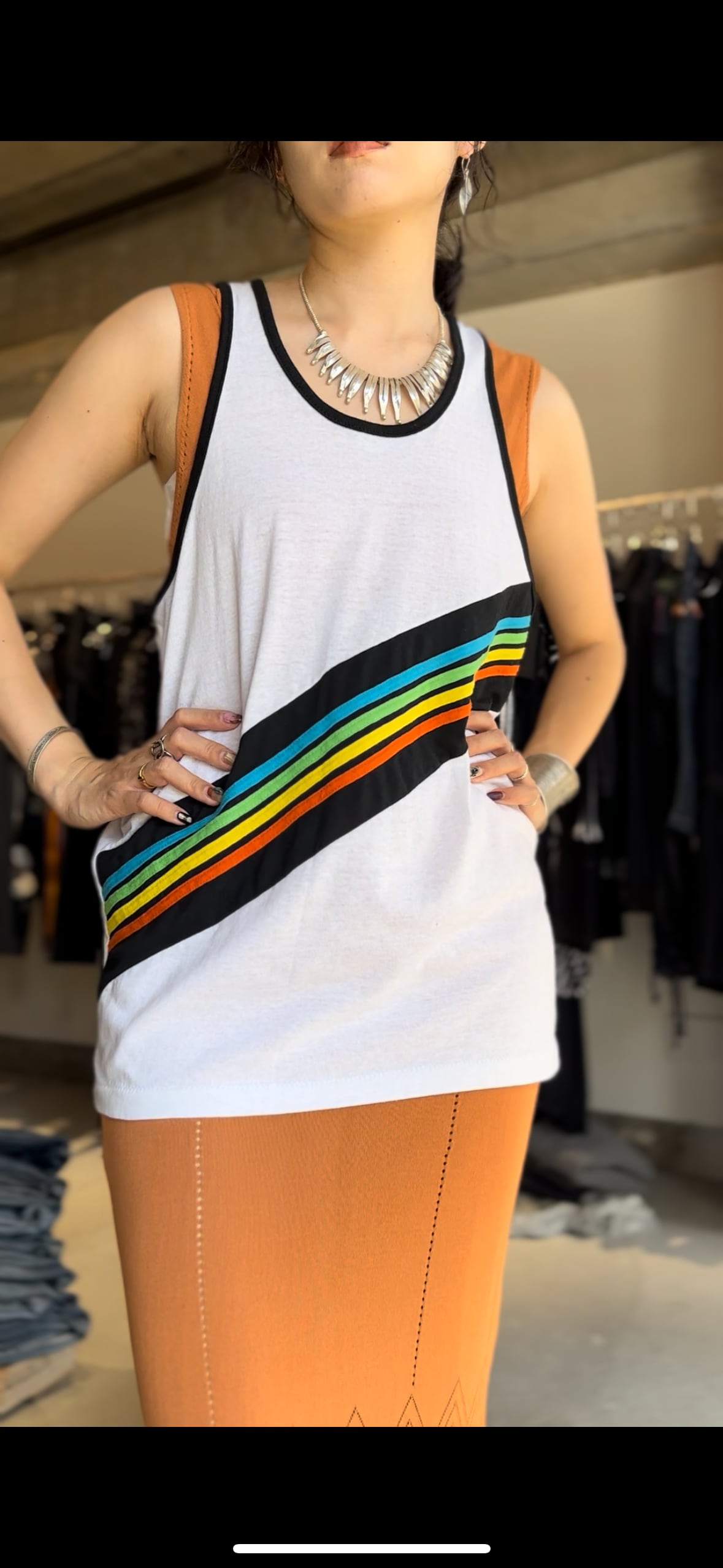 フロントに斜めに入ったレインボーラインとパイピングが可愛いタンクトップです。袖のカットが深めに入っていてアメリカンスリーブのようなデザインになっています。