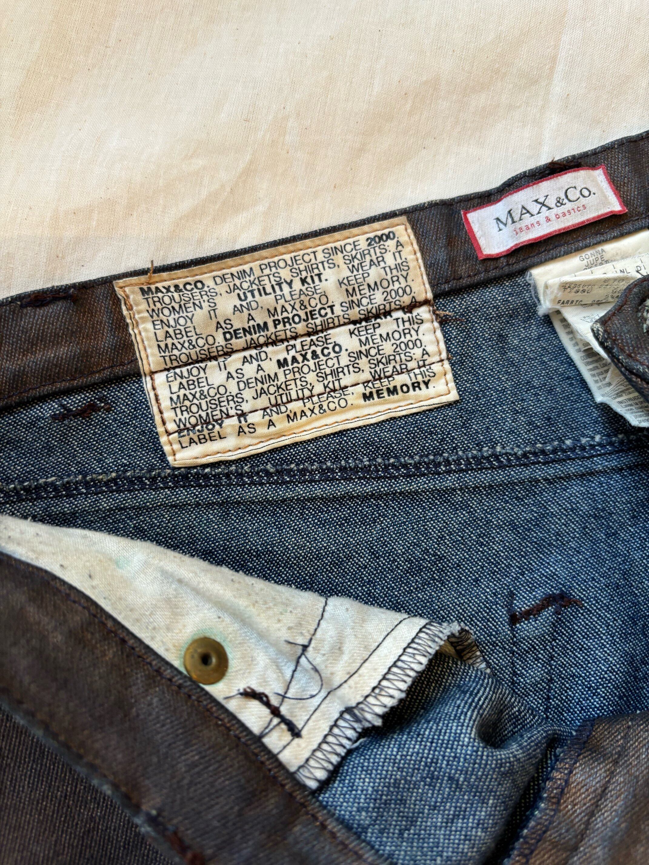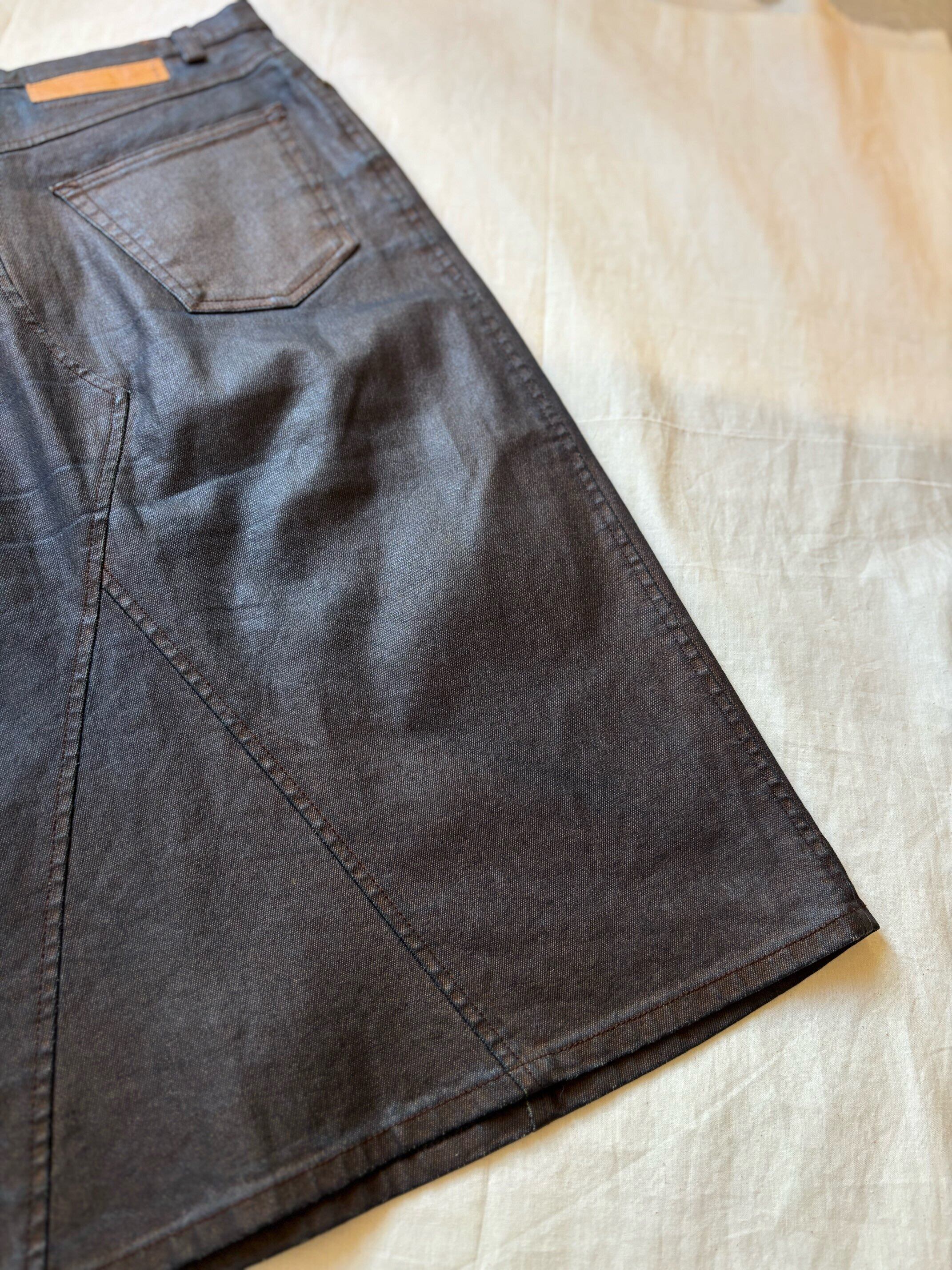 元々はコットンのインディゴスカートですが、表面に樹脂コーティング?してある生地感で、見た目もオイルドコットンのような見た目になっていますが、オイルでは無いのでベタつきなどはありません。