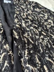 アニマルプリントにラメ糸が入っていてキラキラしています。生地はシャギーなのでわざと毛羽立ちがあるのですが、大変薄手の生地で少し透け感もあるので今の季節でも車内や施設内、オフィス内など冷房除けに良い感じだと思います。