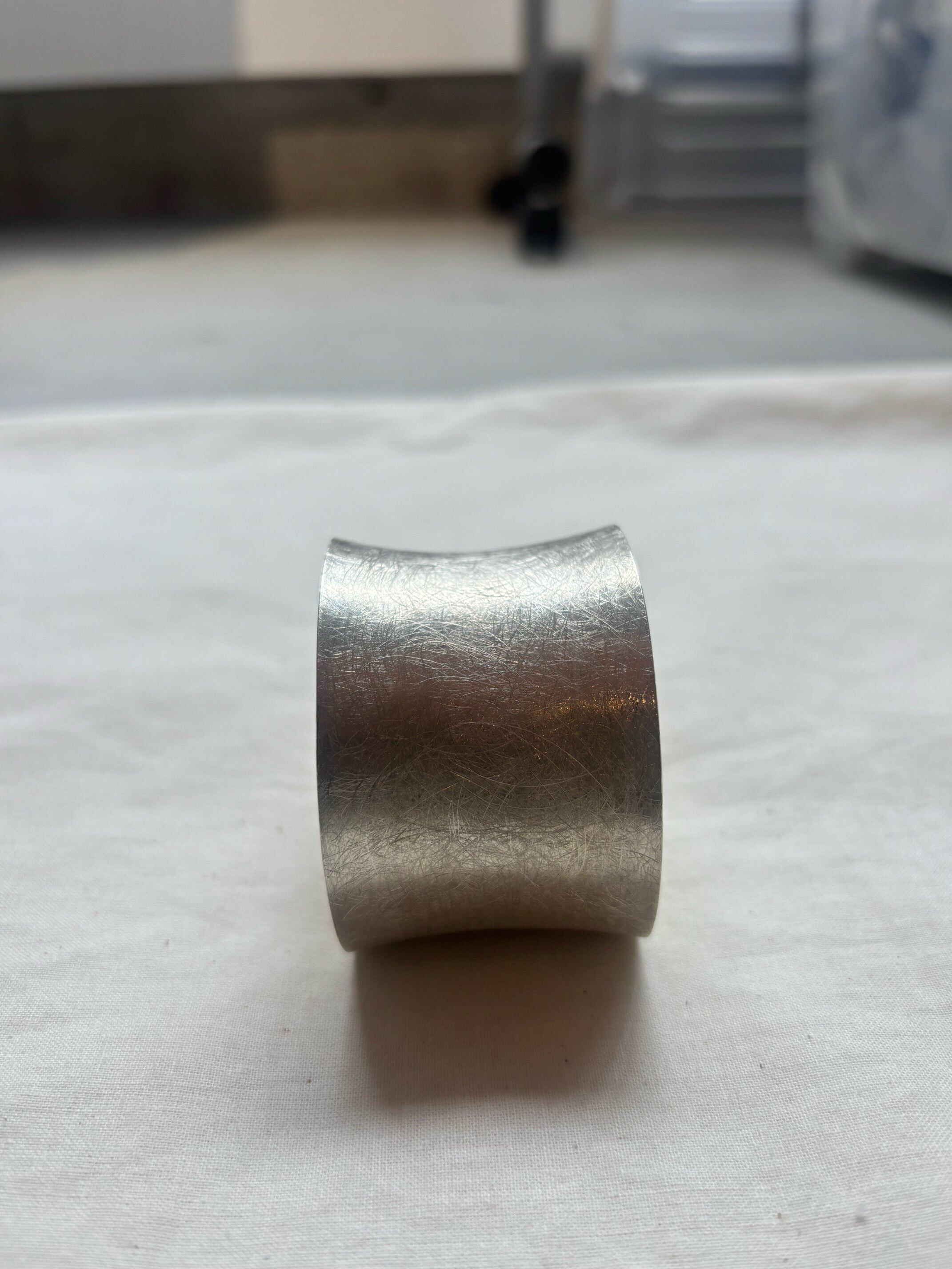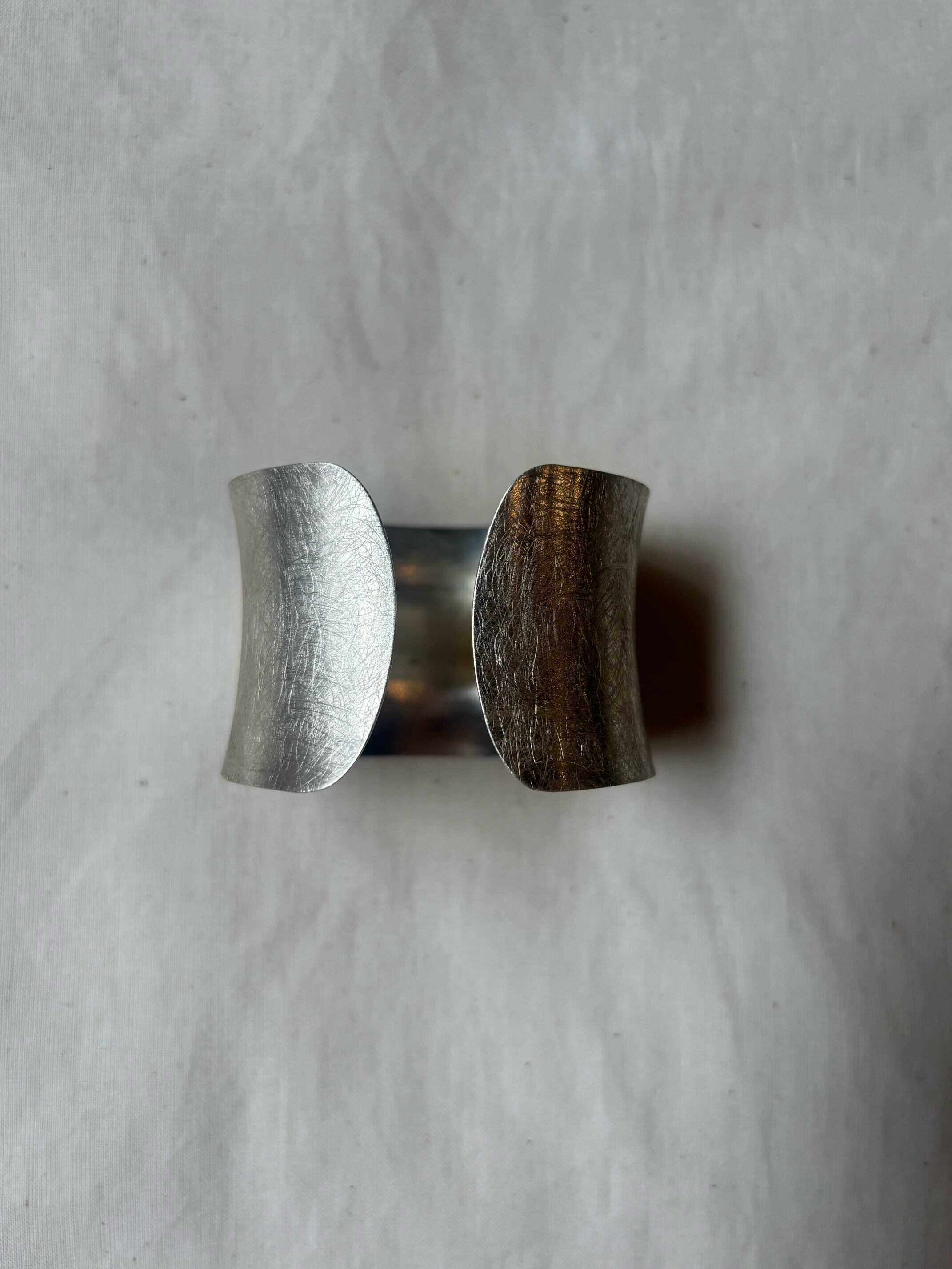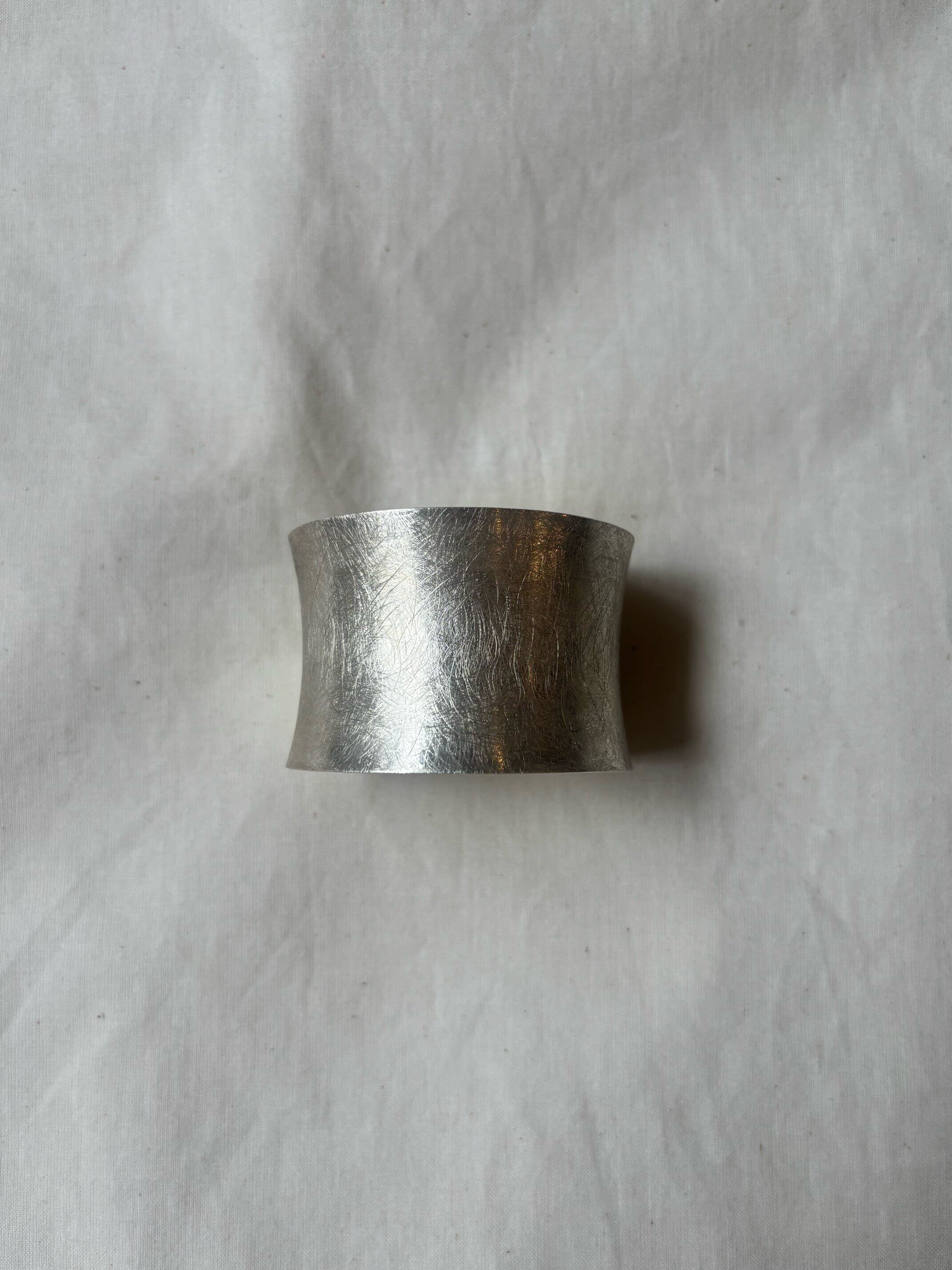 以前ナミナミの形の柄物がありましたが、そちらと同じ柄のシンプルな形状のバングルになります。中をわざと引っ掻いたような四方八方に線の入った柄が刻まれていて、とてもモダンでおしゃれな柄になっています。