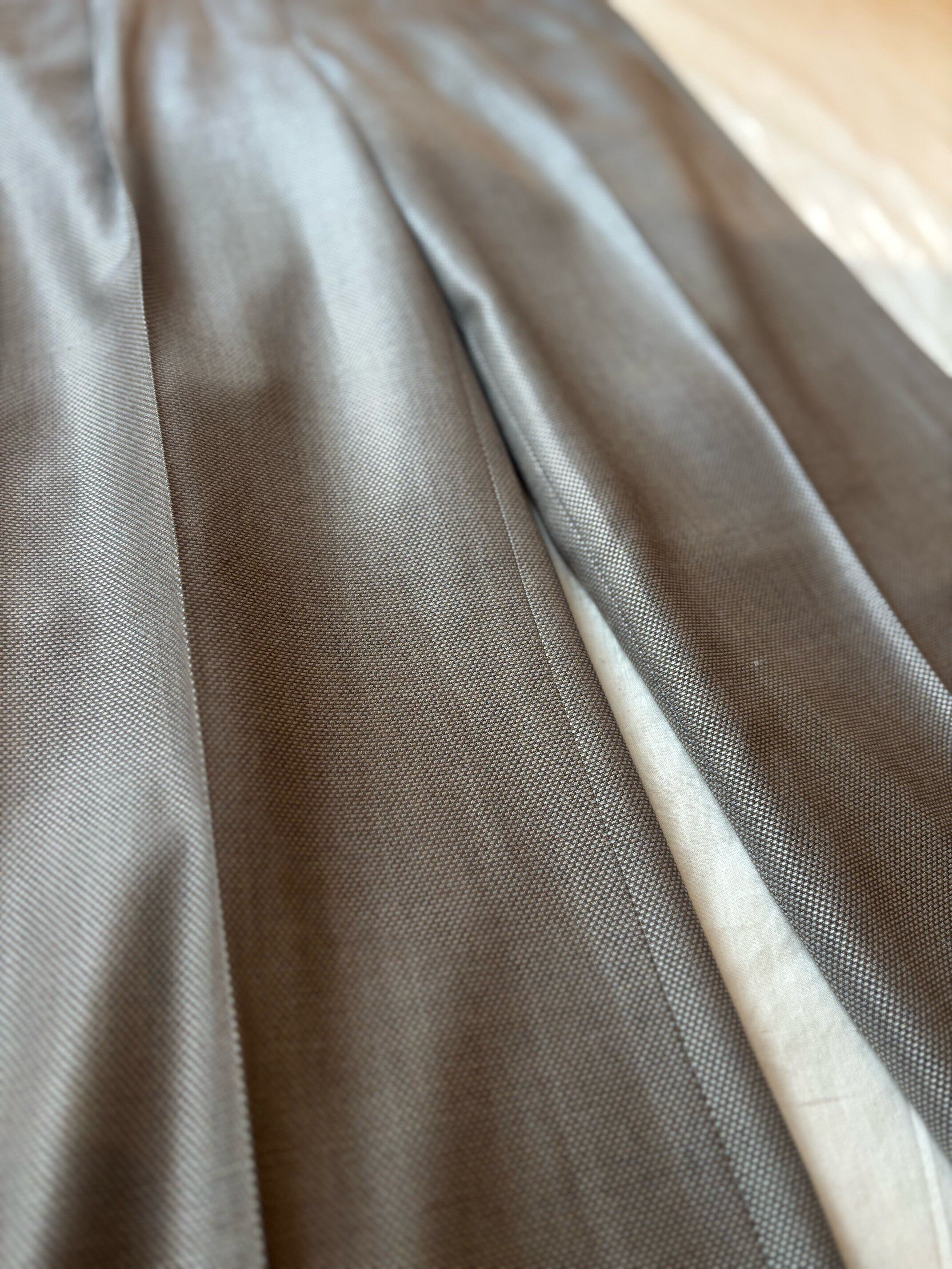 めちゃくちゃ上質なウールシルクの素材感に、生地にはよくメンズのスーツで使うバーズアイ、ローライズのウエストから流れる様なシルエットのフレアシルエットがとんでもなく綺麗なシルエットです。