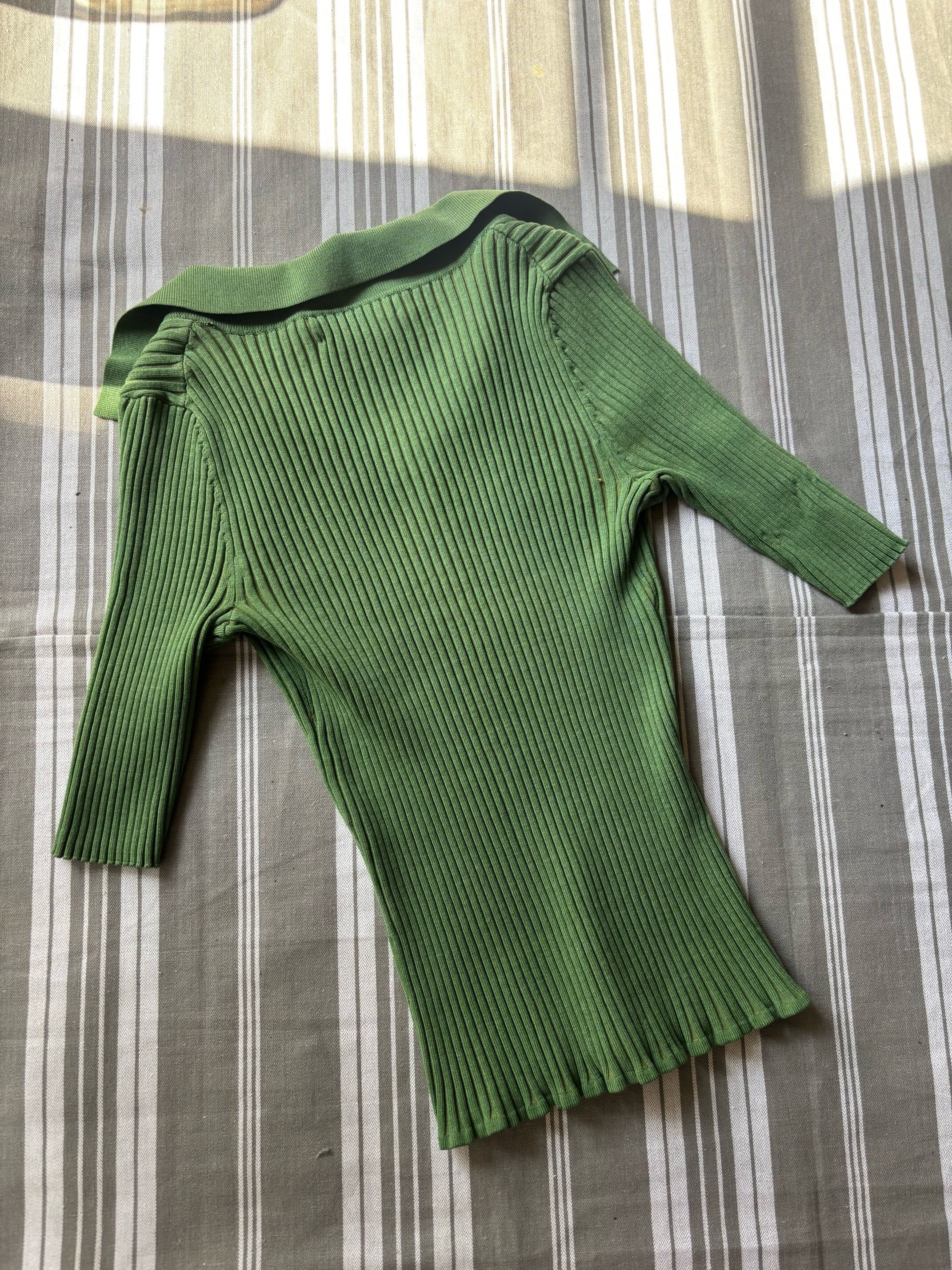 スキッパータイプのポロはタンクトップやteeシャツに代わるものとして人気です。深めというかぼかしたような色の絶妙なグリーンも春夏秋と長いシーズンで着れて良いと思います。
