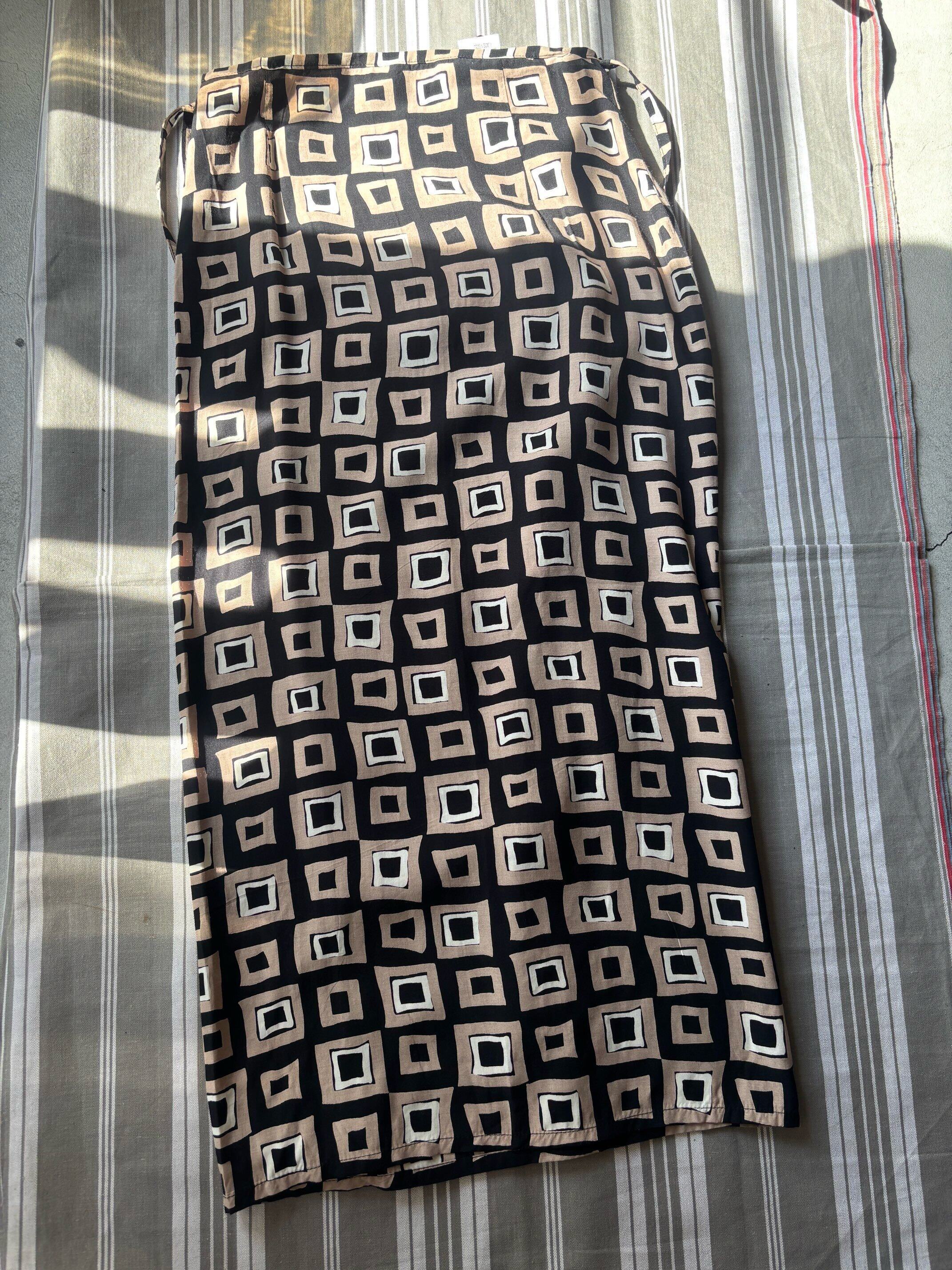 大きな四角のジオメタリックな柄に、柔らかくてしなやかな素材のビスコースの巻きスカートです。テロっととろみのある素材なので薄手でシワになりにくい素材なのも、どんなパンツに合わせても邪魔にならず、一枚着としても使いやすい素材感だと思います。