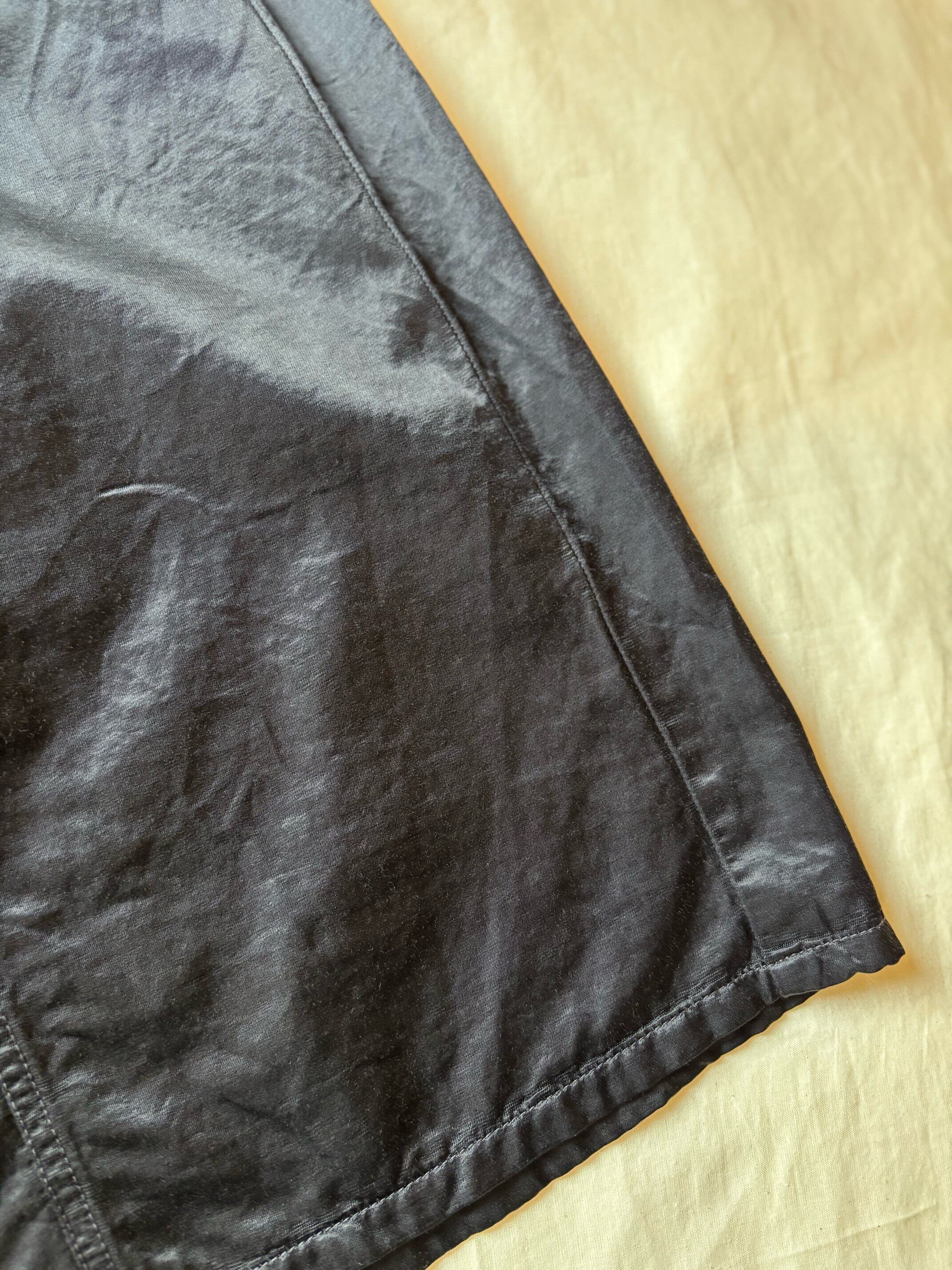 カラーは深いパープルがかったネイビーです。レーヨンが入る生地で表地に光沢感があり鈍く光るようなサラッとした生地感です。