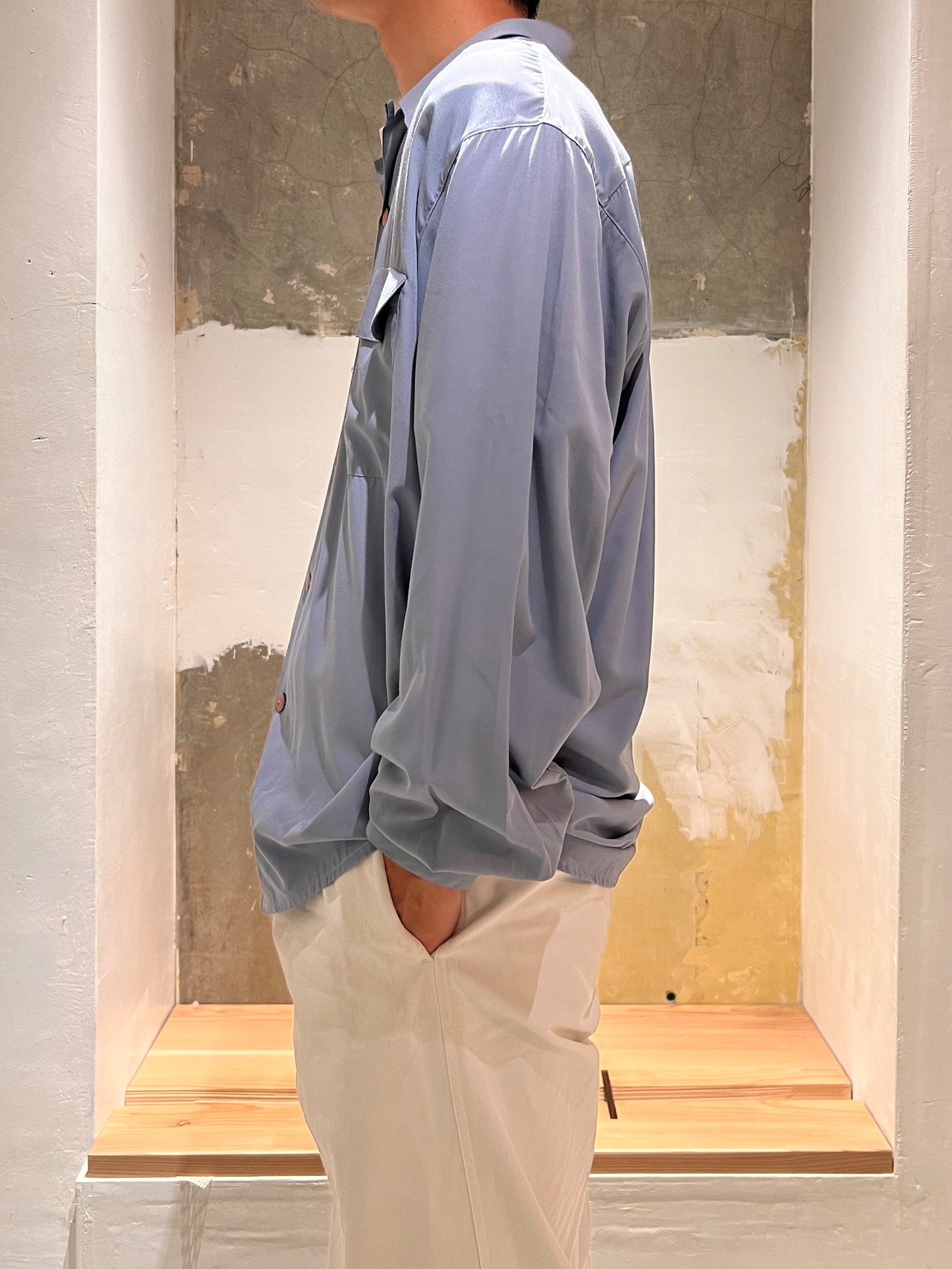1950年代頃に流行った解禁シャツを当時のイタリア人がモダンな感じで作ったような面白いバランスの1着です。カラーも都会的なブルーグレーです。
