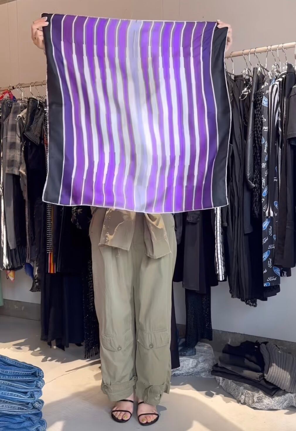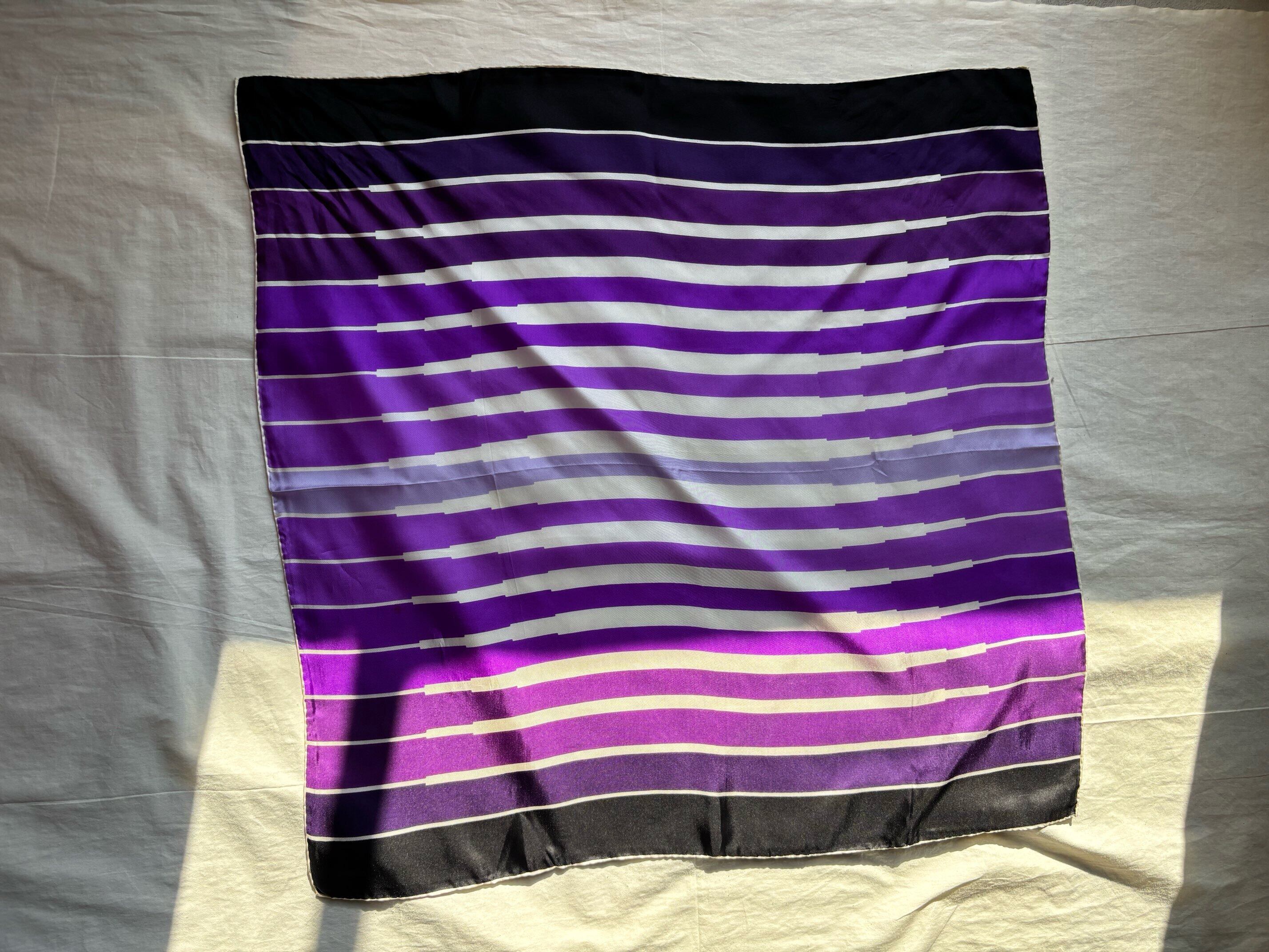 昨今トレンドのスカーフです。パープル×ホワイト×ブラックのバランスの良い配色のスカーフです。通常正方形のスカーフは90×90位の大きさがスタンダードですが、こちらは70×70がクリーニングなどで少しだけ縮んだのではないかと思いますが、状態はとても綺麗です。