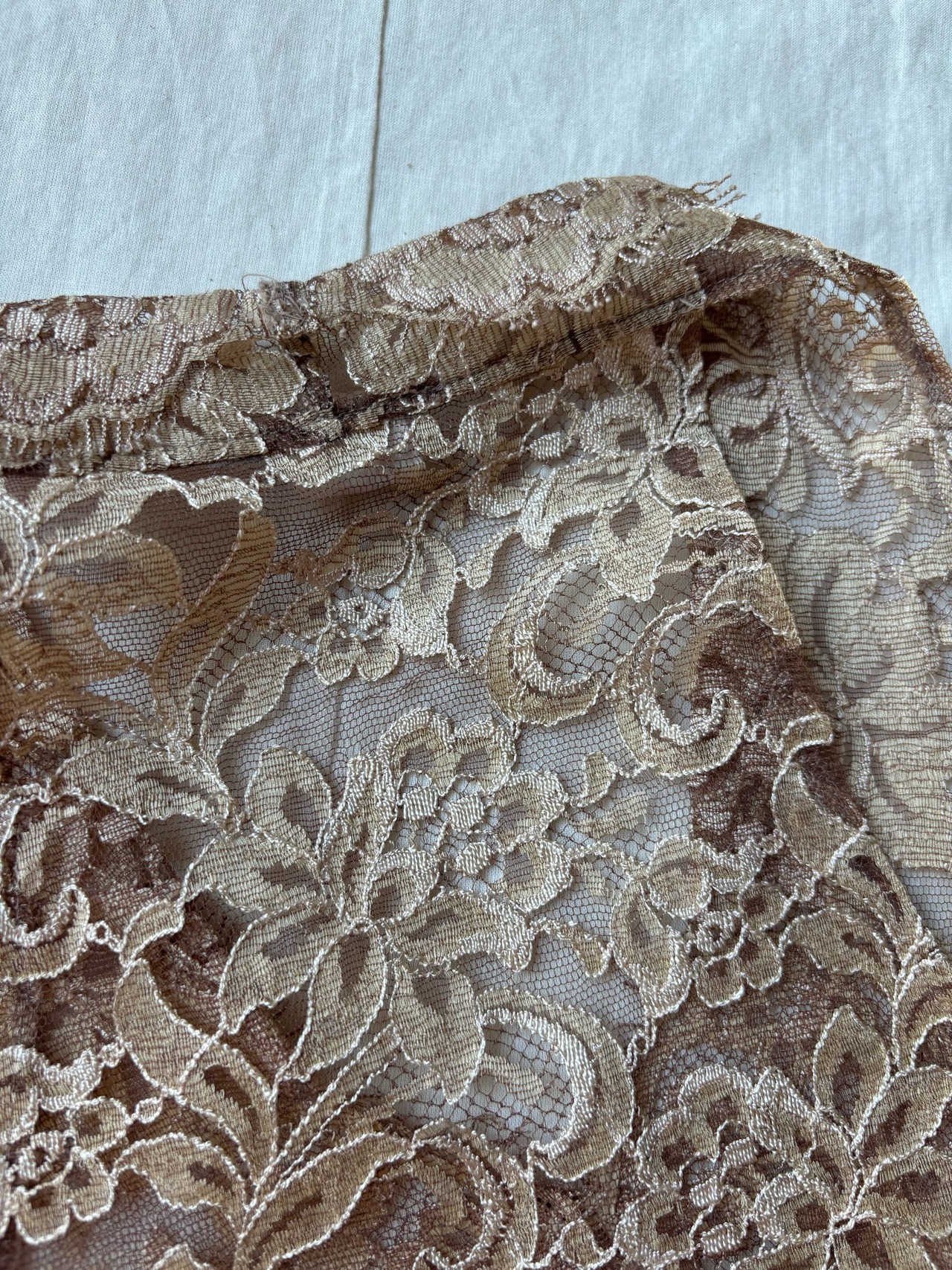 珍しいですね。肩がぐっとえぐれた作りになっているベストで、なかなかレースで作られているものは見たことがありません。
