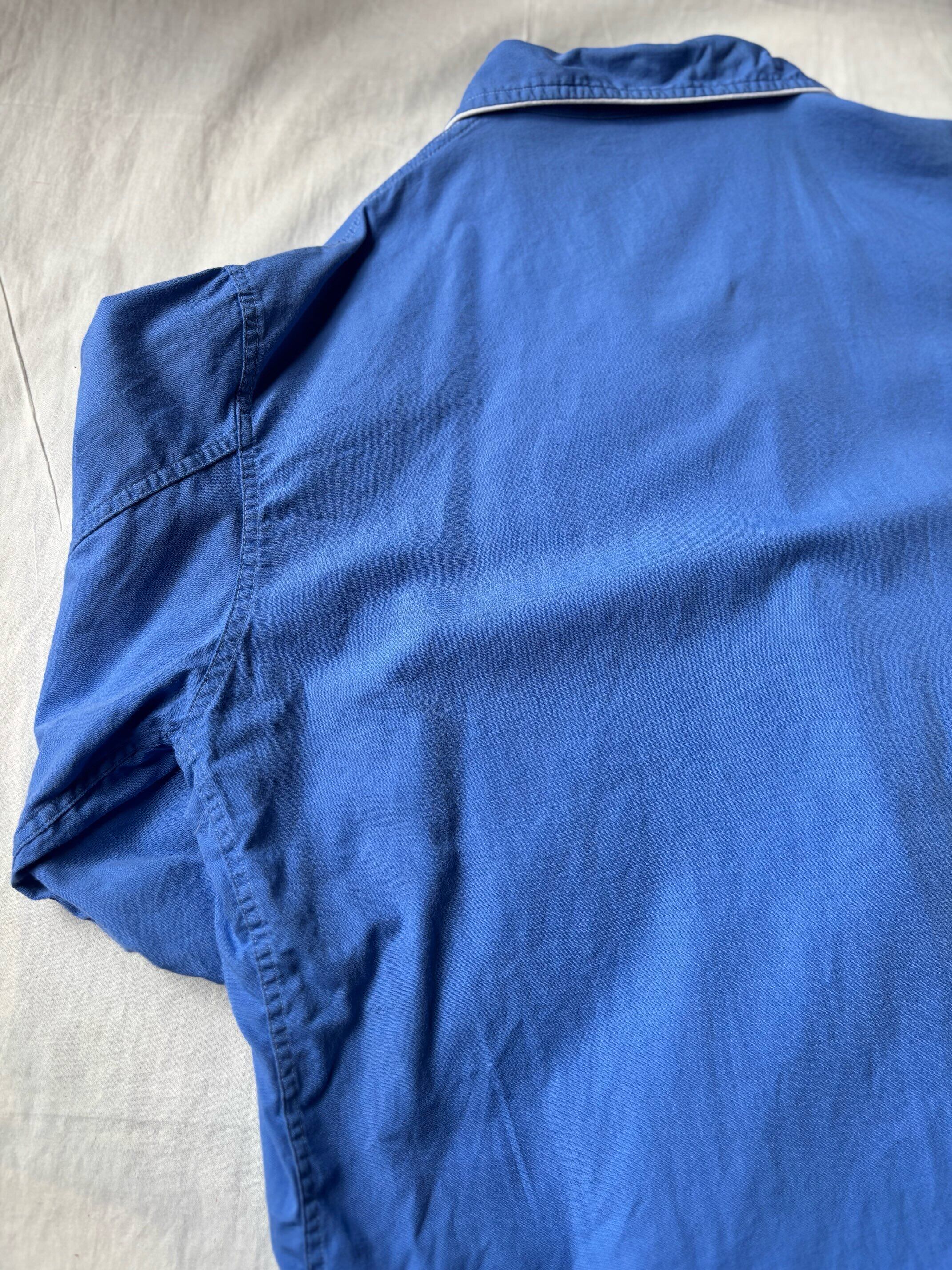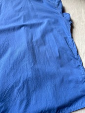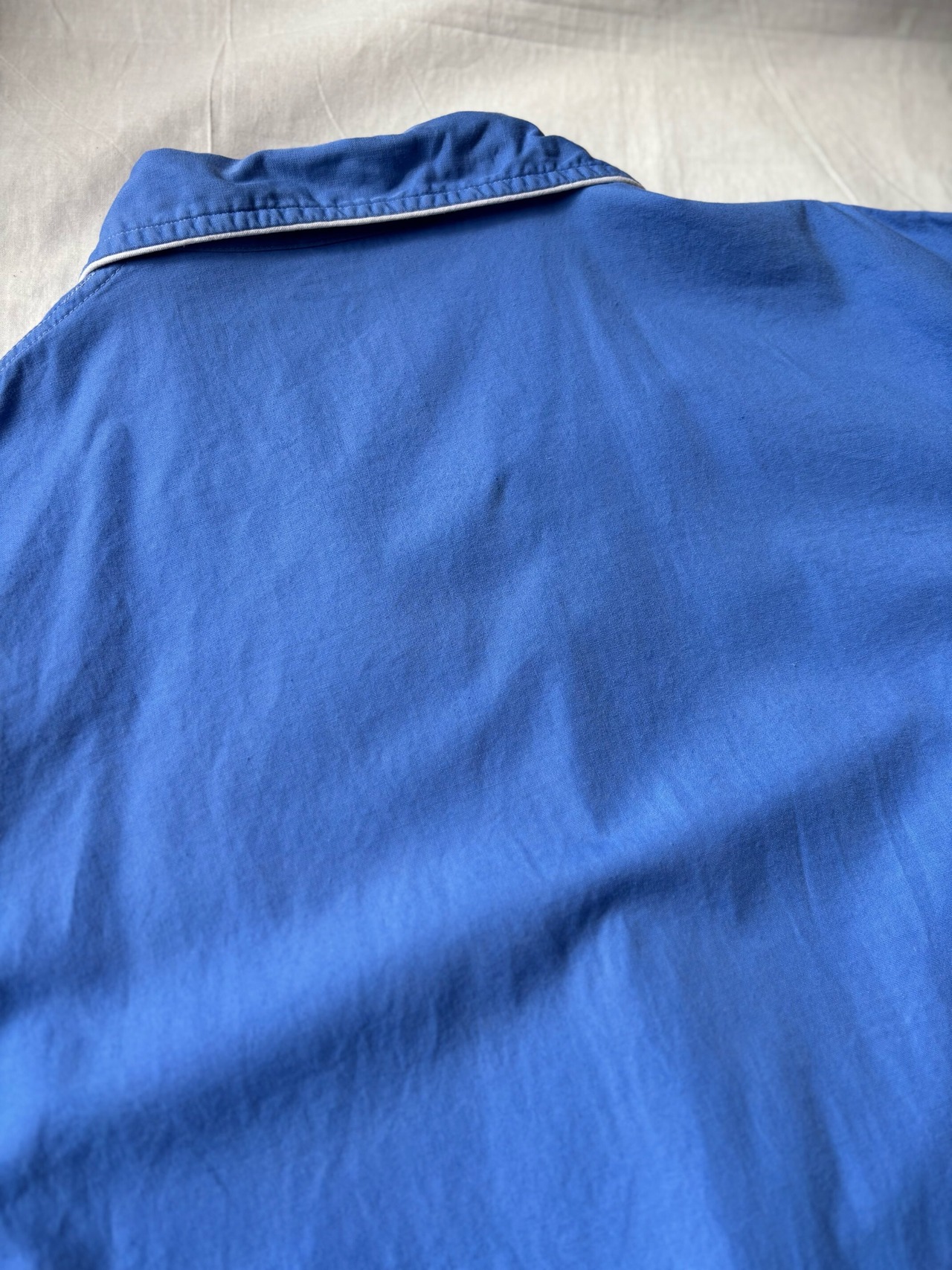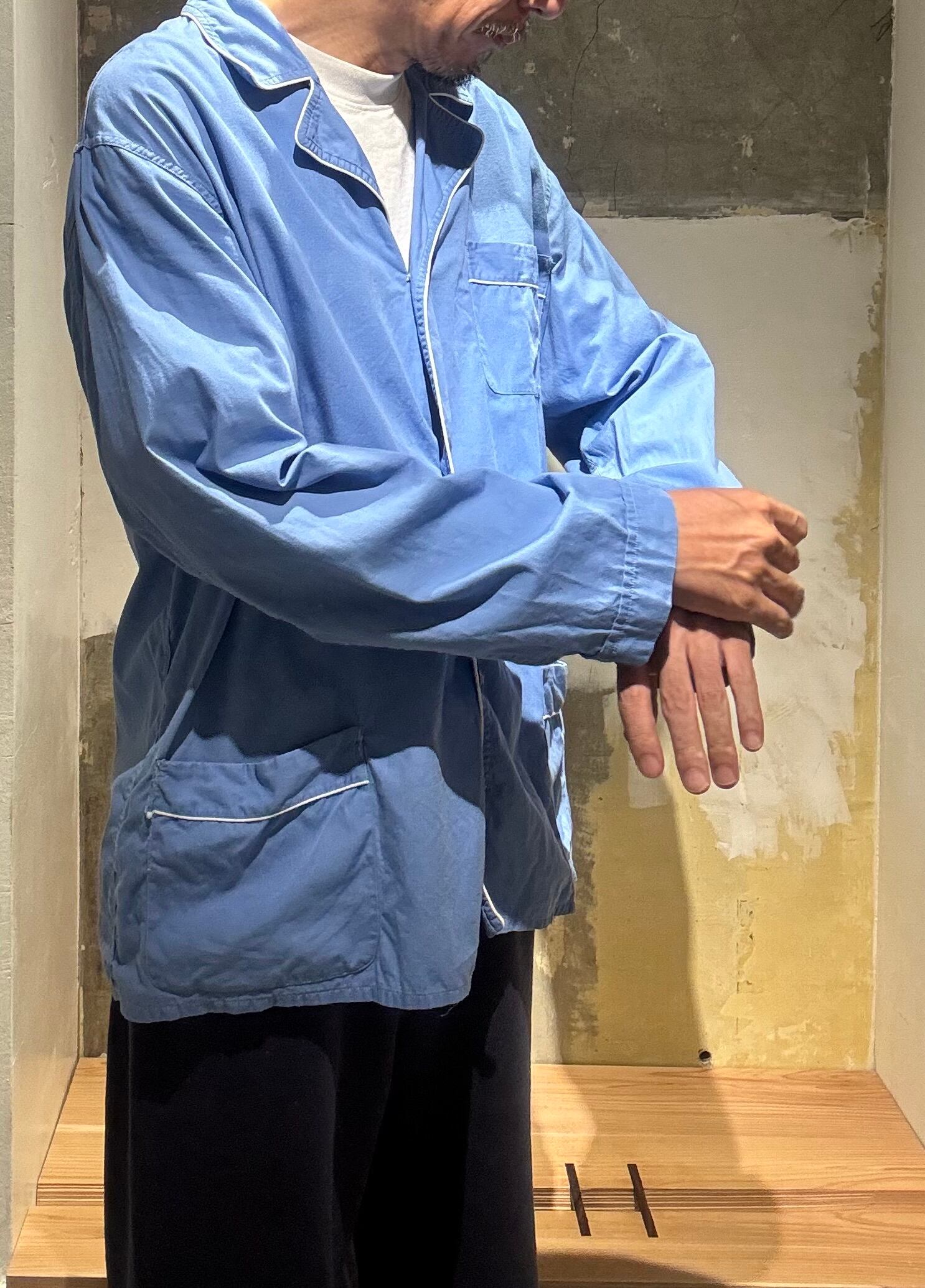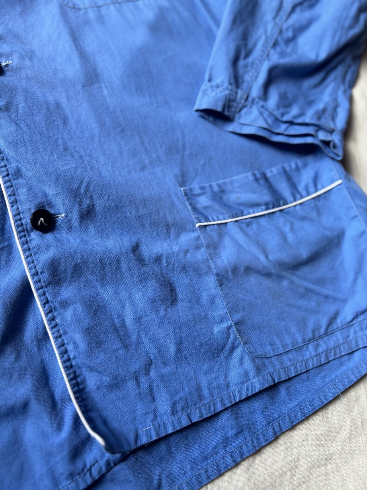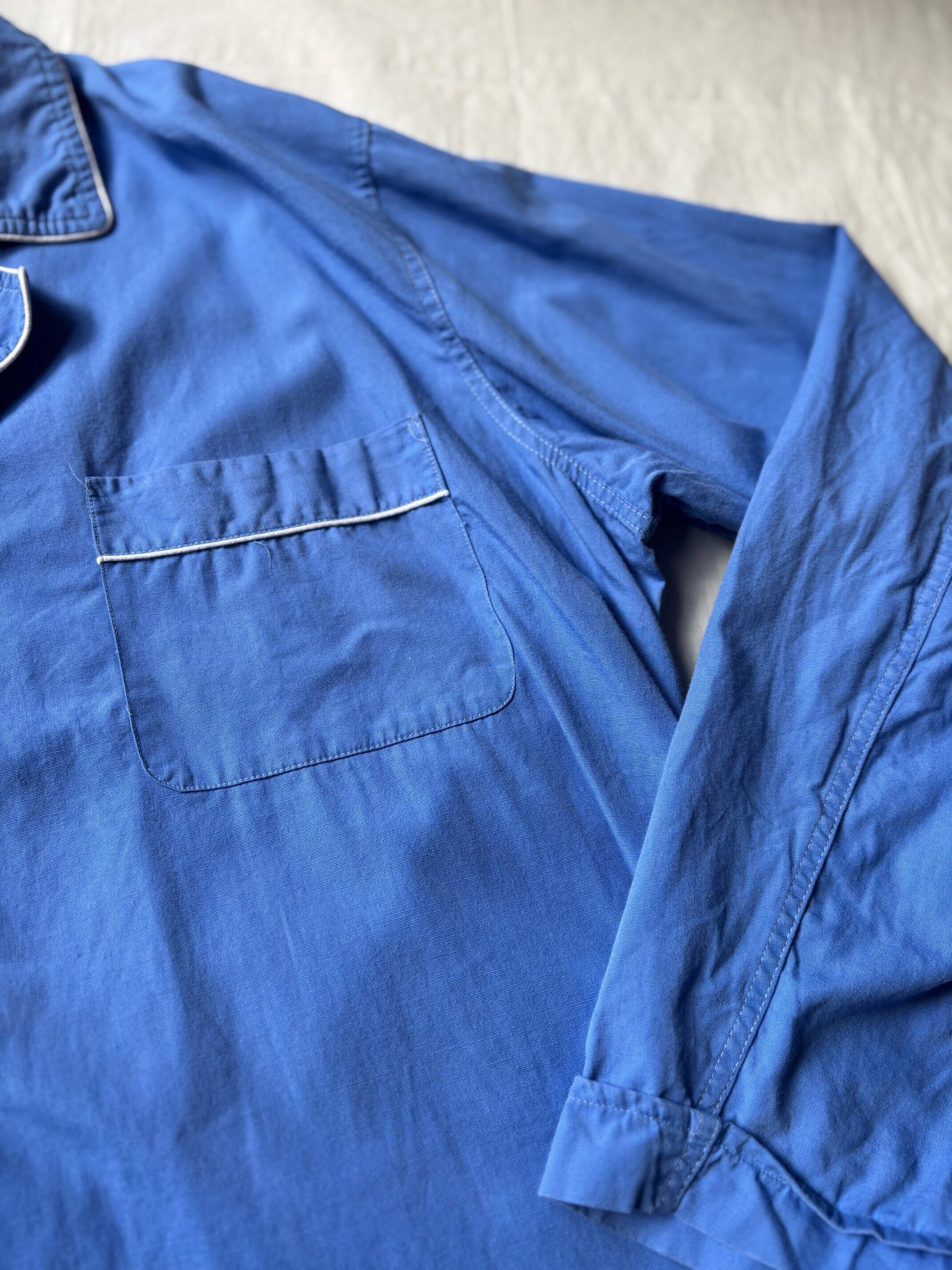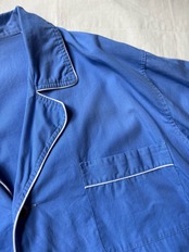 青に白のパイピング、胸ポケット、腰にもポケットがつくオーソドックスなディテールのパジャマです。