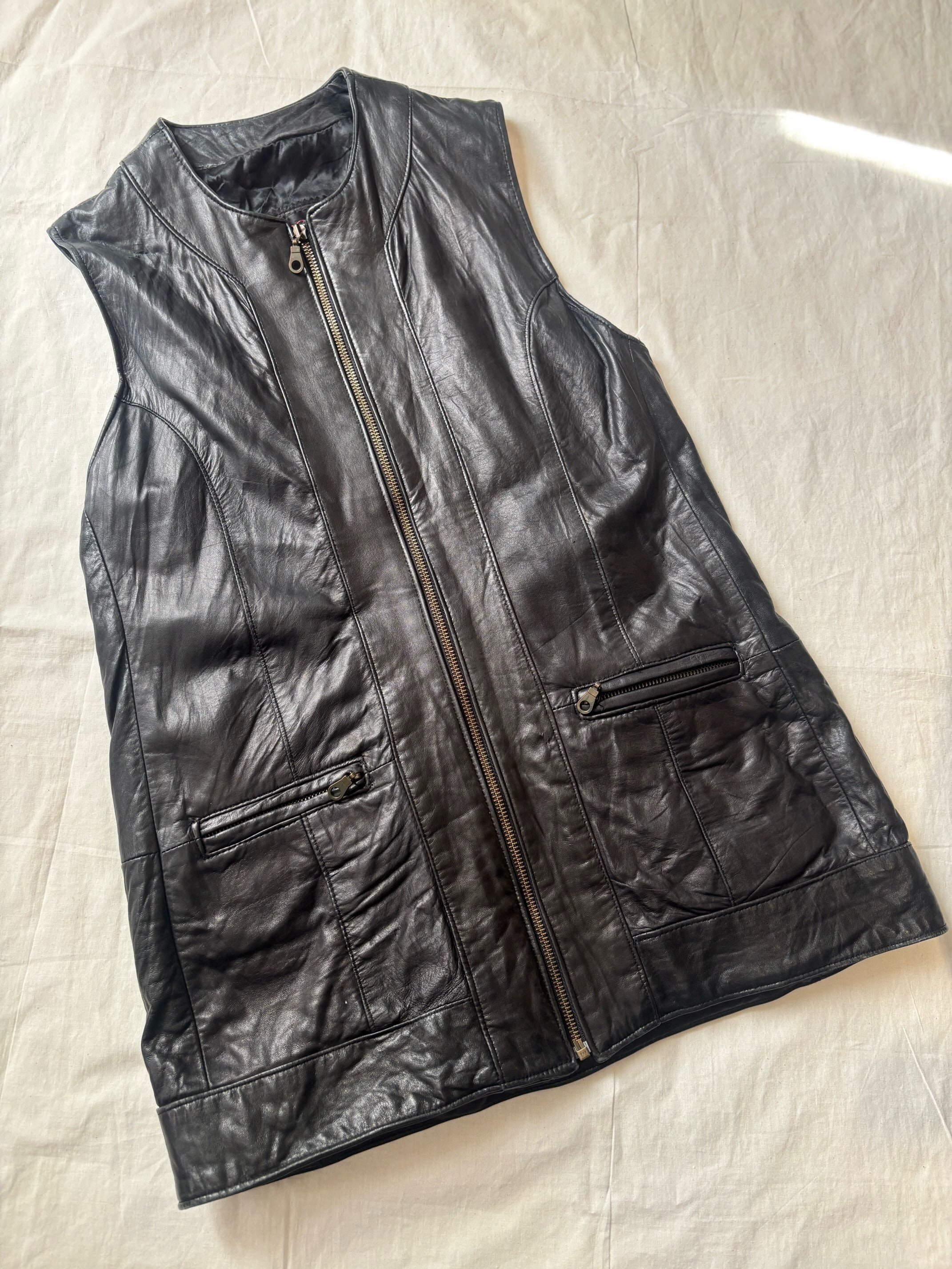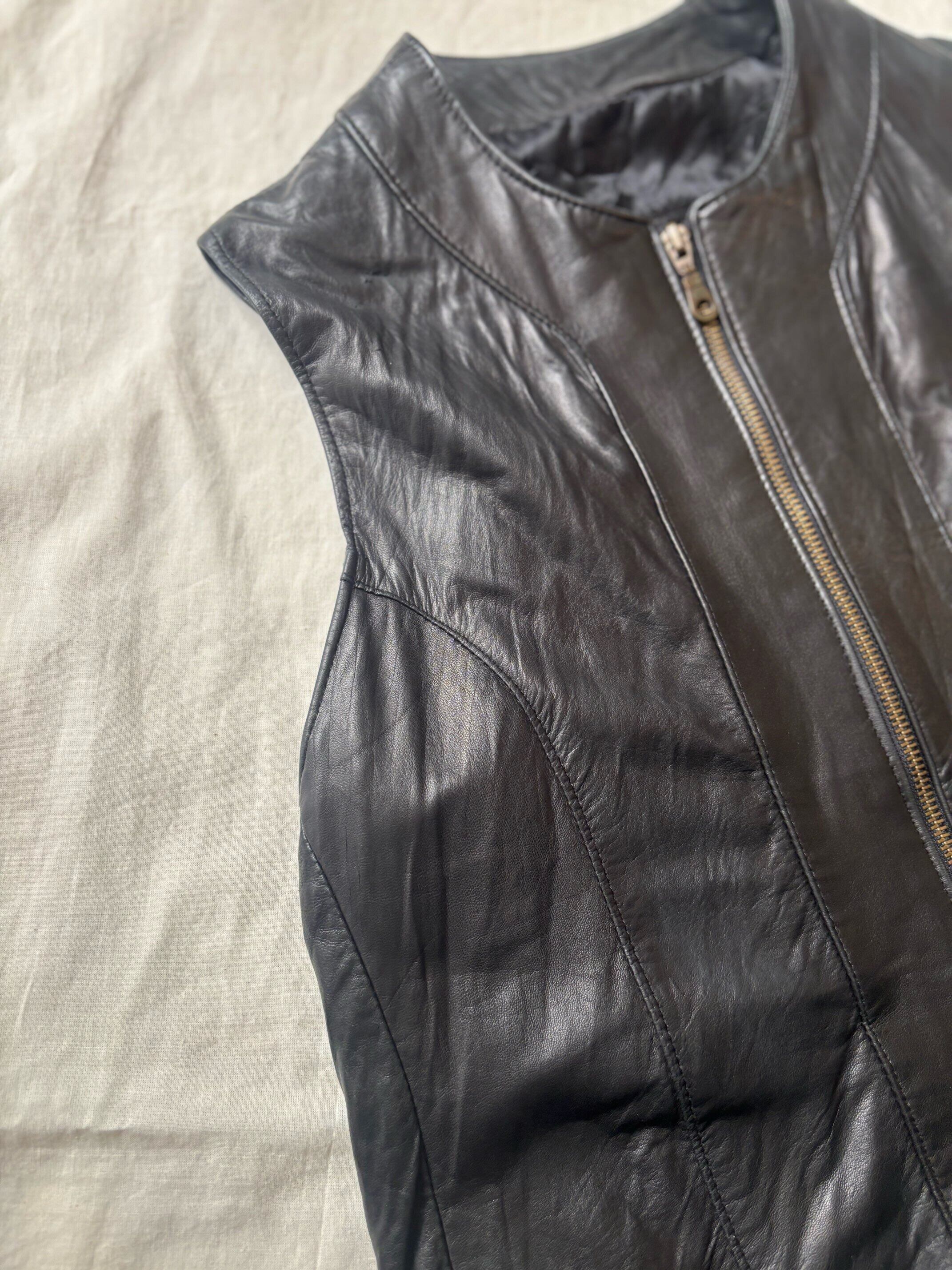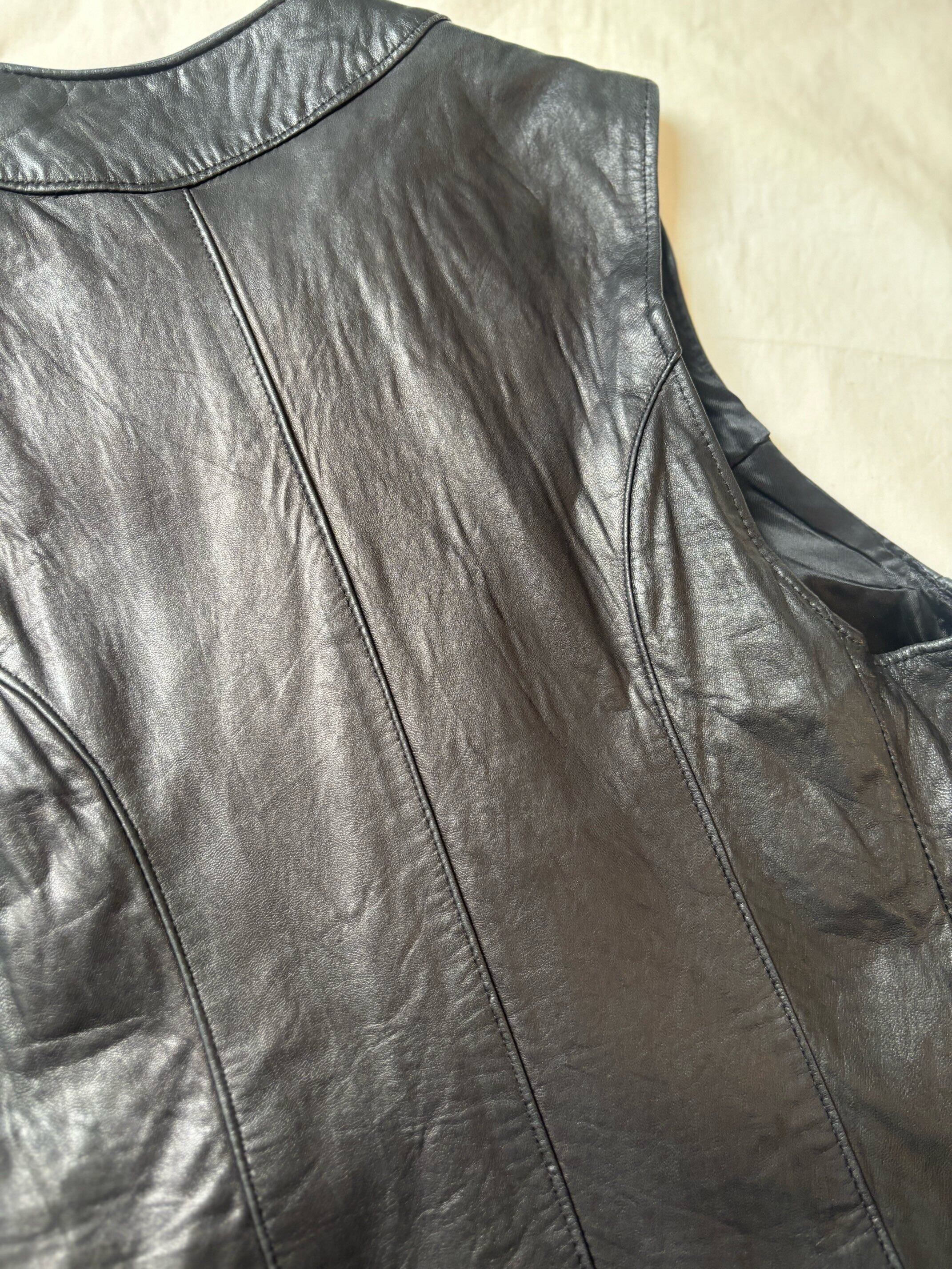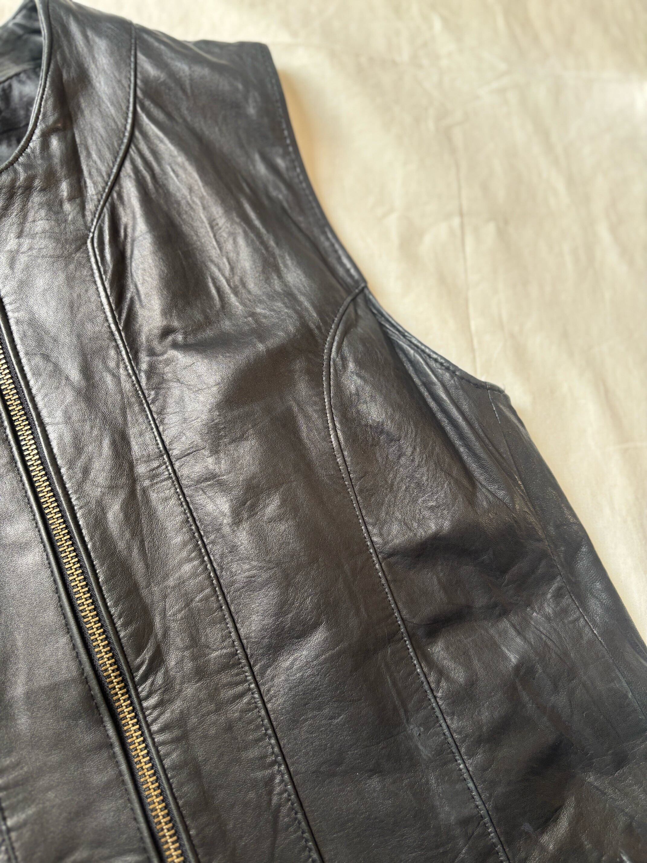 今期も秋冬の主役であろうレザーのアイテムですが、新品のブランドのレザーの高騰がとまらない状況ですので、ここ数年は古着で探している方も多いと思います。その中でもレザーベストはなかなか良い形のものが少なく、入れたくてもなかなか入荷出来ません。多いのがジレタイプのものが多いのですが、stylingが限られるので買い付けも余程良い形のものでないと入れません。その中でこちらのベストは突破が首まで閉まるタイプ、裾がスクエアでアウターとしても可愛い形、更にラムレザーで軽くて柔らかいという3拍子揃ったベストになります。