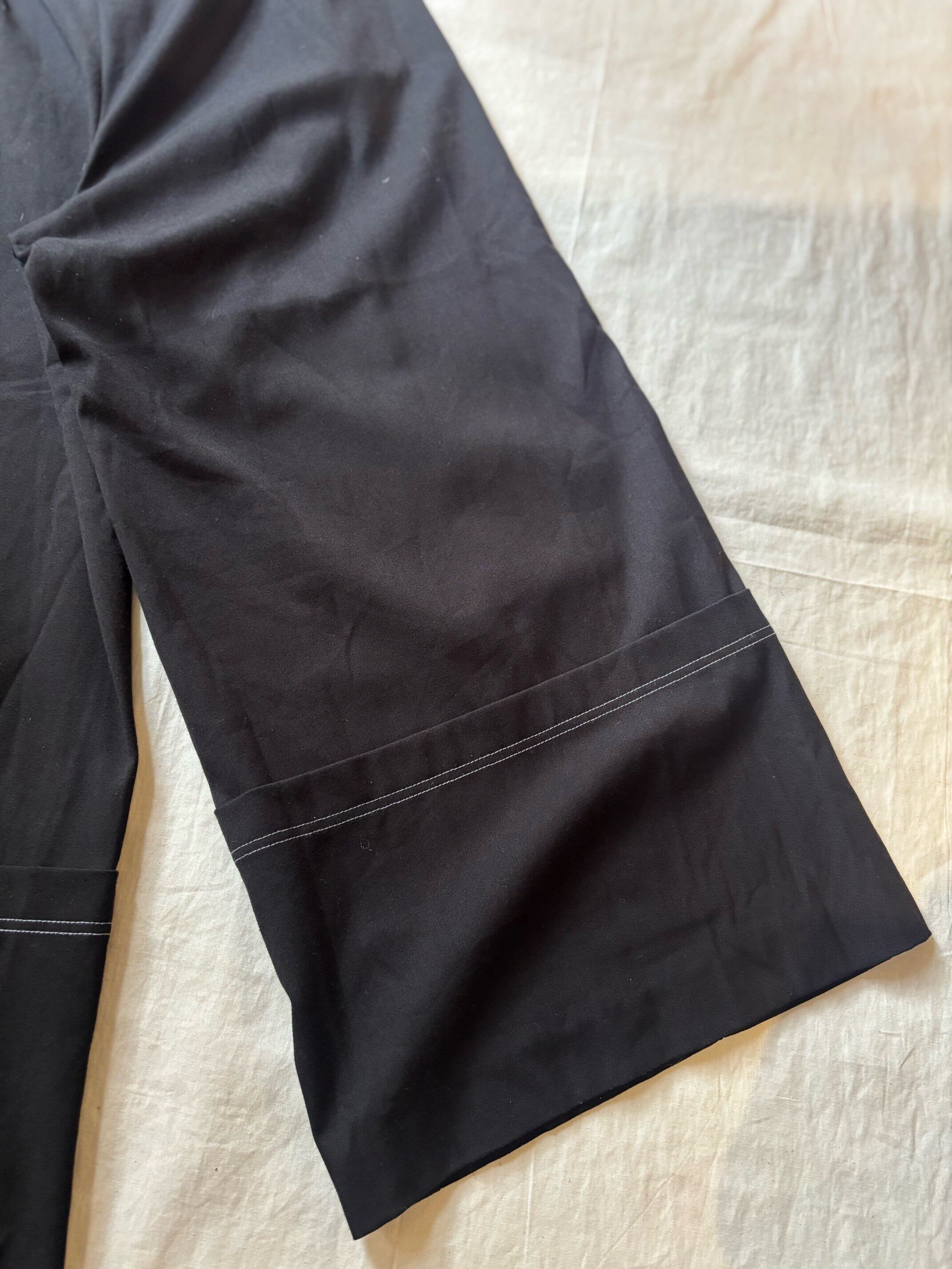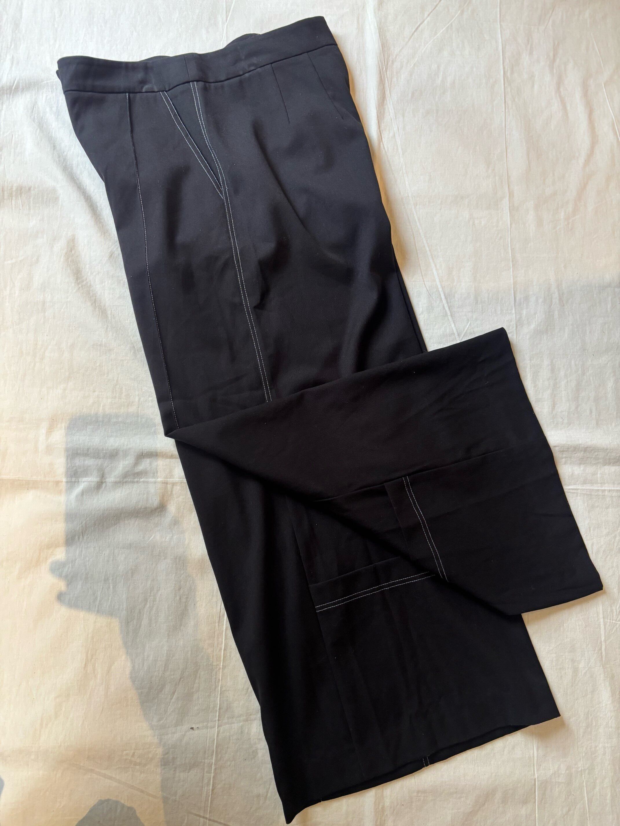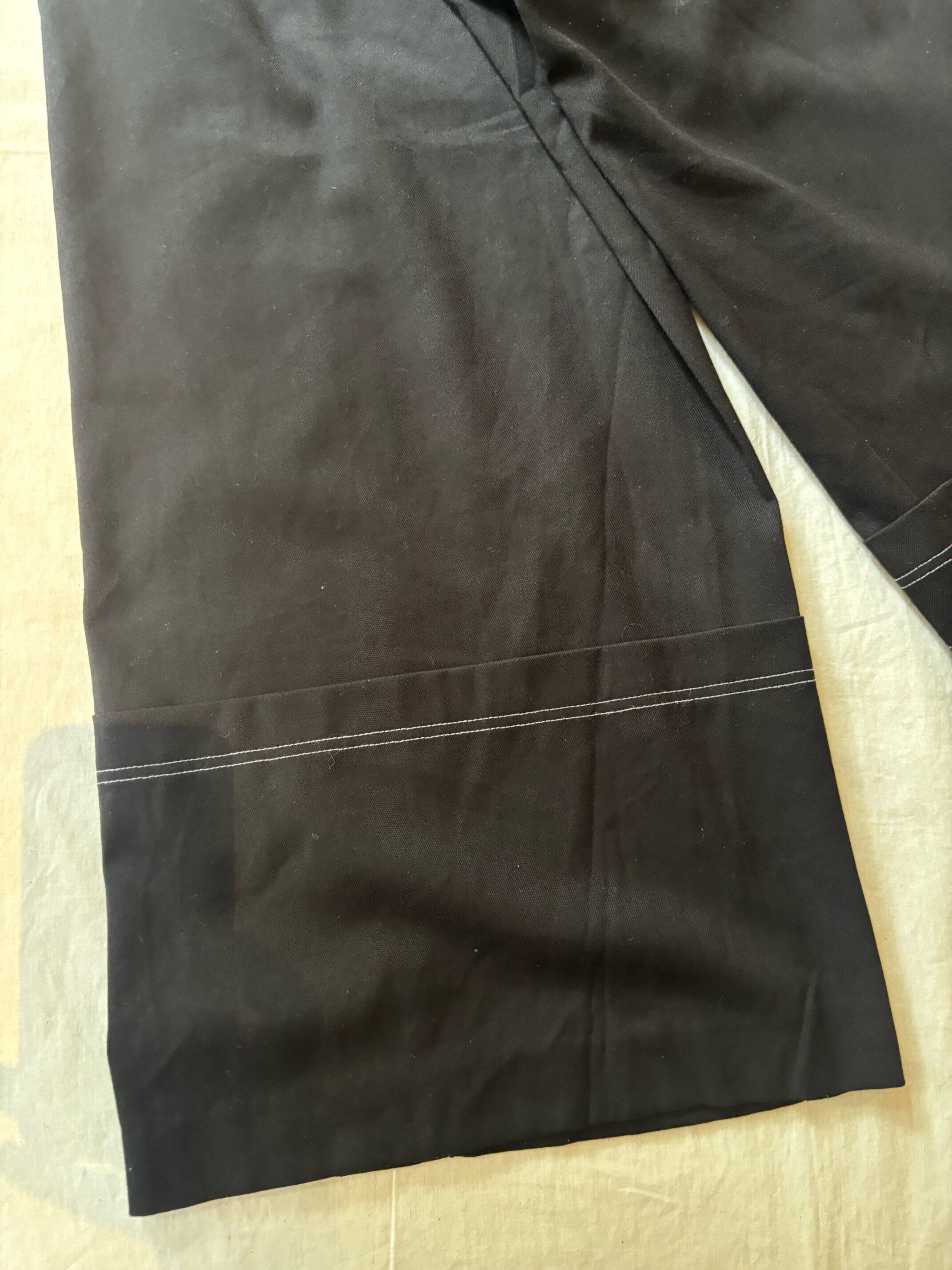 ブラックのベーシックなテロっとした素材に白のステッチが映える可愛いデザインだと思います。90年代後半辺りから2000年代にかけてクロップド丈は一度流行ったのでその頃のものだと思いますが、少しストリート感も出せるアイテムで、白のラインソックスにローファー、上はテーラードジャケットなどのstylingが可愛いのでは無いかと思います。