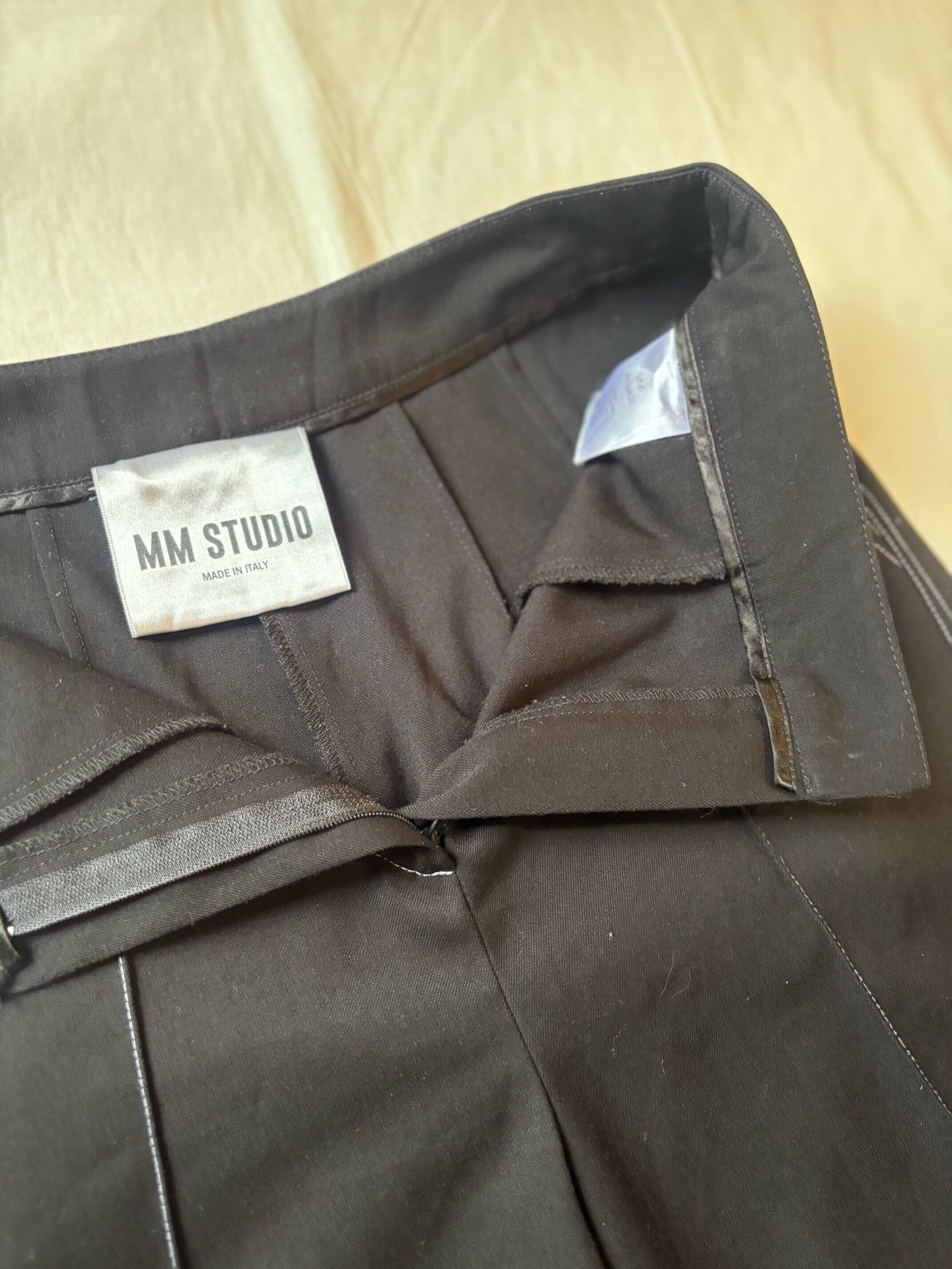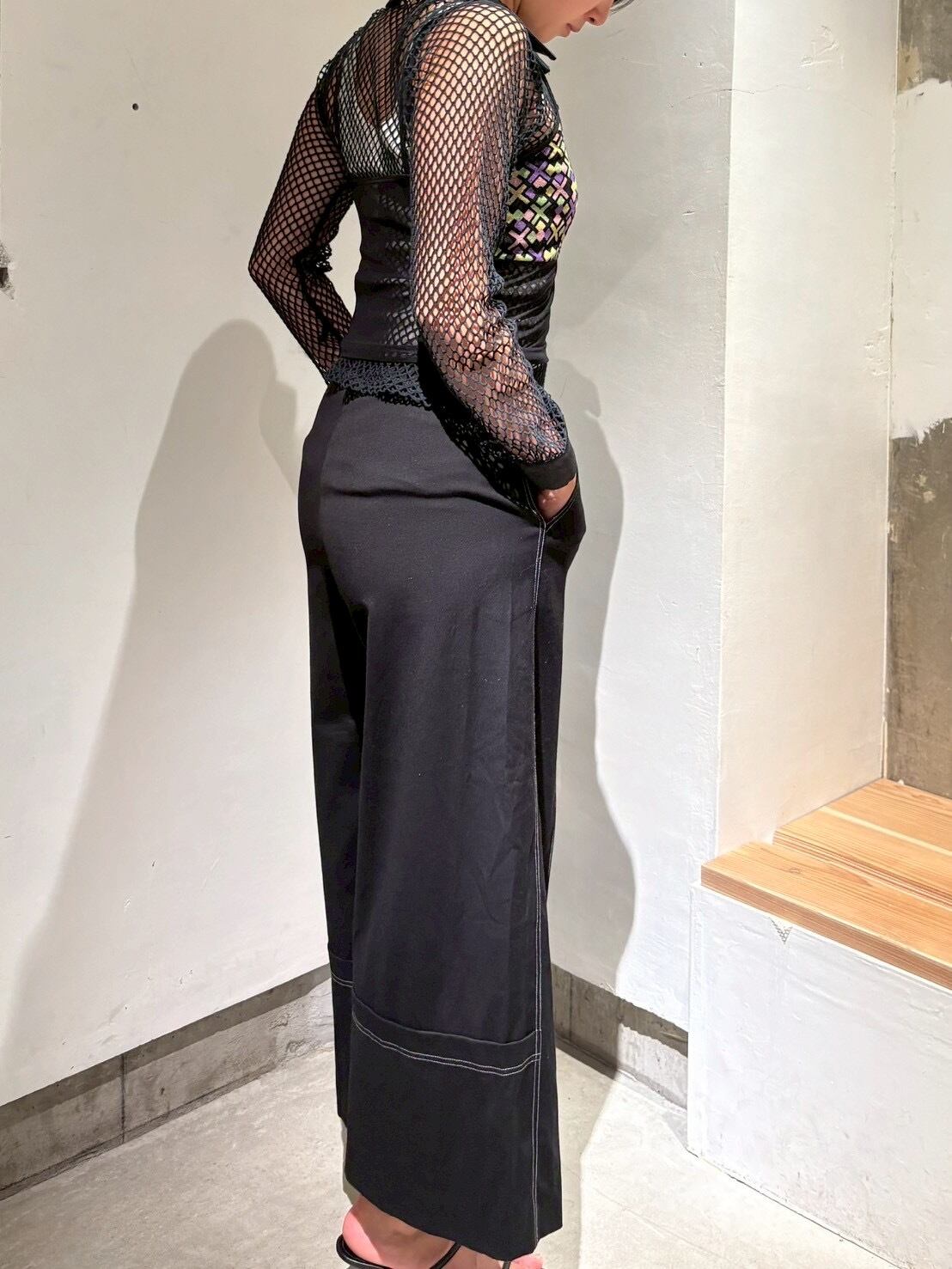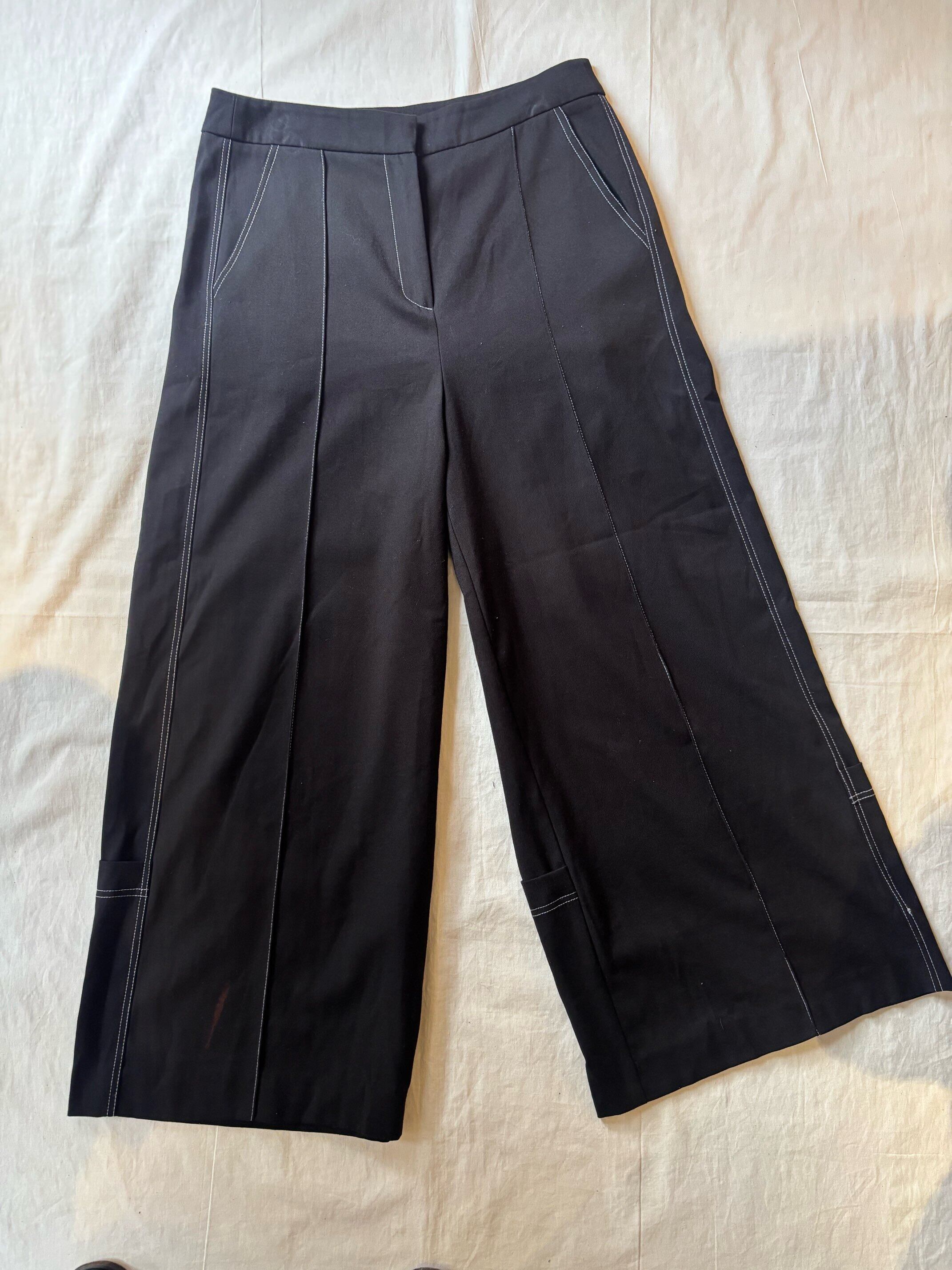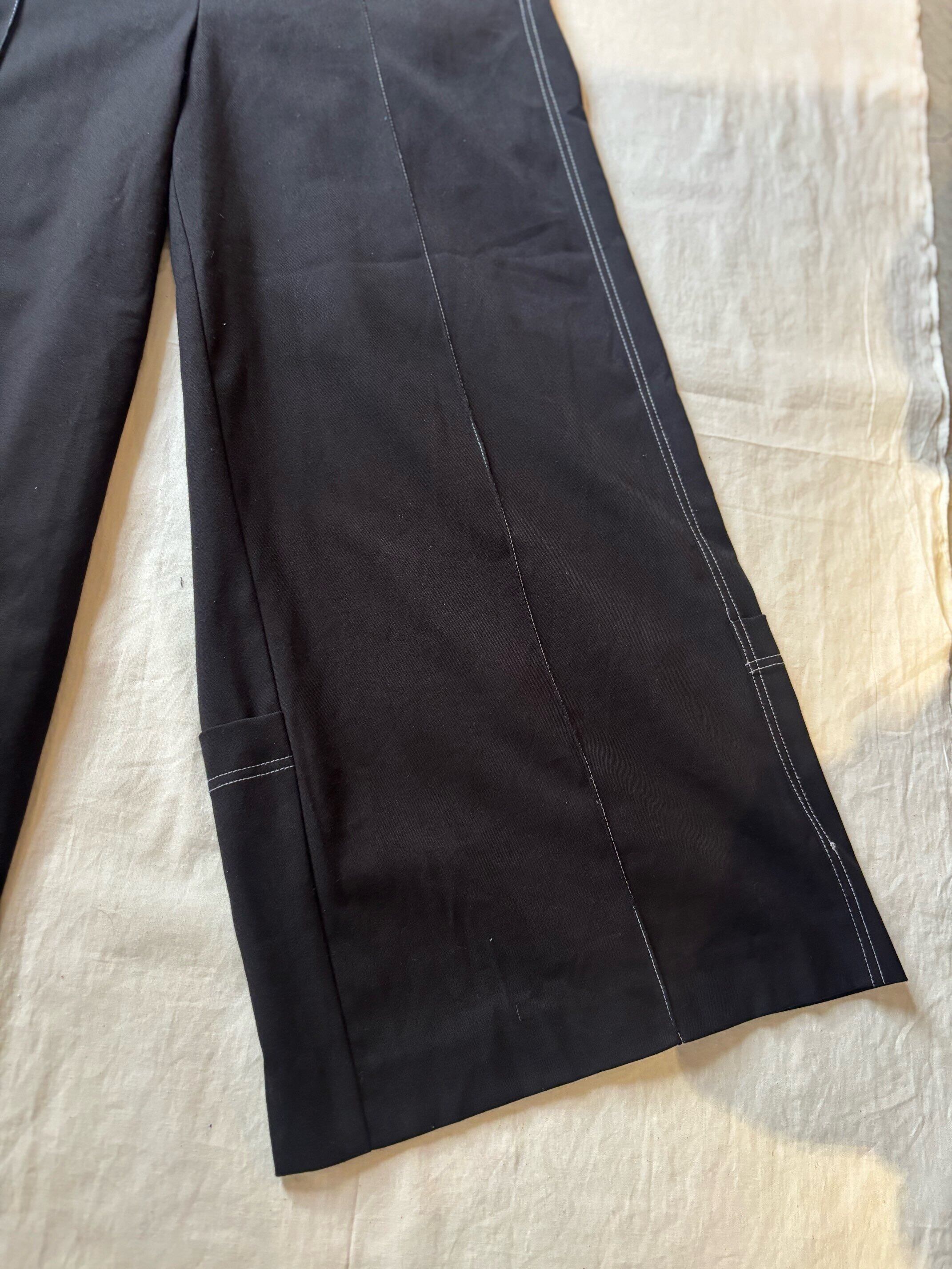 ブラックのベーシックなテロっとした素材に白のステッチが映える可愛いデザインだと思います。90年代後半辺りから2000年代にかけてクロップド丈は一度流行ったのでその頃のものだと思いますが、少しストリート感も出せるアイテムで、白のラインソックスにローファー、上はテーラードジャケットなどのstylingが可愛いのでは無いかと思います。