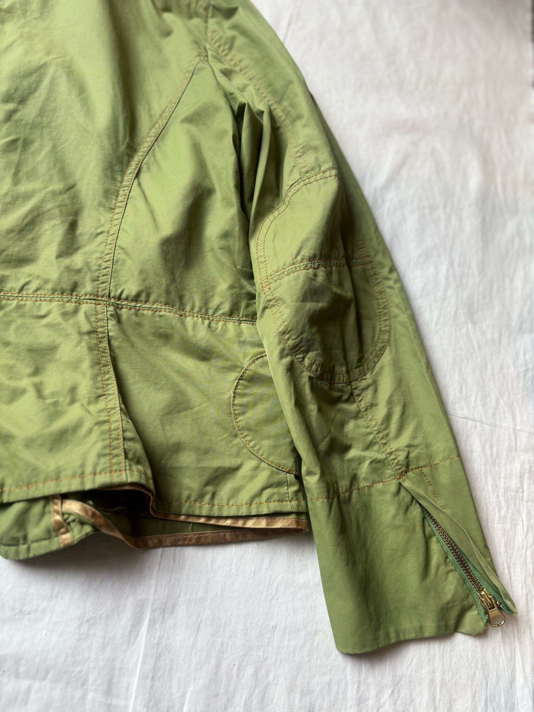 こちらは2000年代前半頃のジャケットでピスタチオのような鮮やかなグリーンとオレンジのステッチ、ブランドの刻印が押されたボタンや様々なギミックのあるポケット、エルボーパッチなどそのディテールがとても凝った作りのジャケットです。この当時のトレンドだったタイトシルエットが今の20代の方にはどハマりするサイズ感だと思います。このサイズ感だと恐らく女性が着ても可愛いと思います。