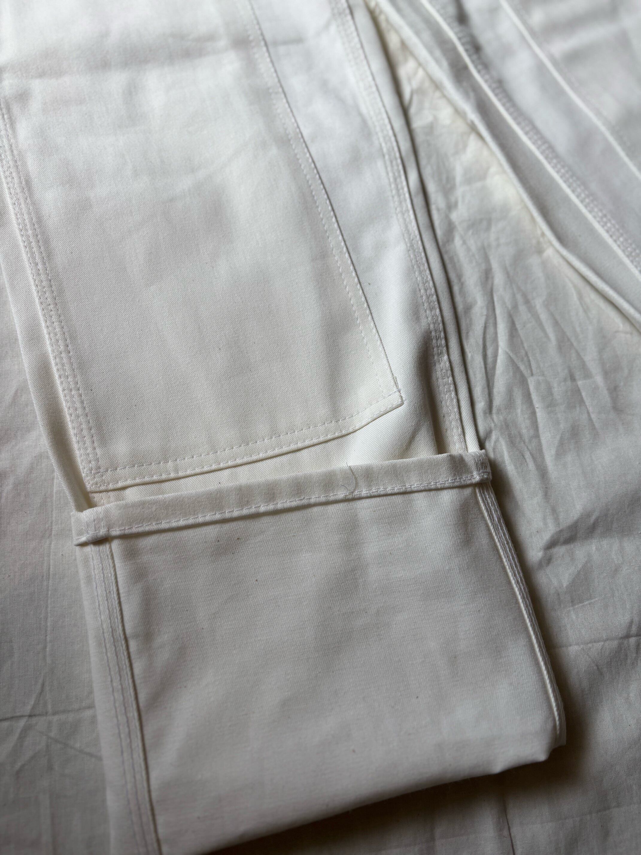 白のワークパンツなのでトップスは少し女性らしいアイテムでも良いかもしれません。ワンピースに重ねて着るのも良いと思います。ボリュームのあるブラウスなどを合わせても良いかもですね。