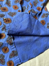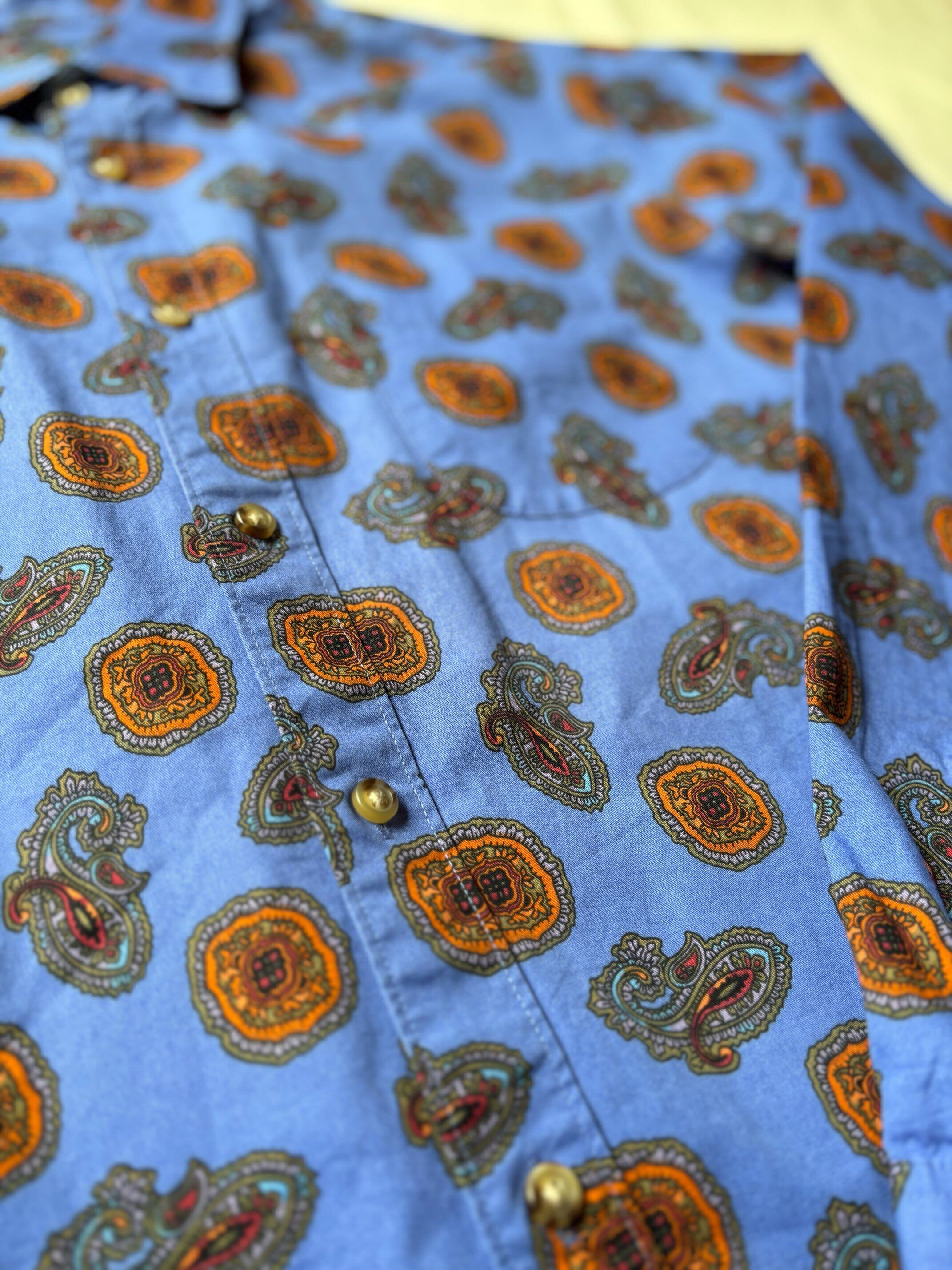 ネクタイにあるようなボディが綺麗なブルーにオレンジとブラウンの高相性のペイズリー柄がとてもクラシックでかっこいいシャツです。よくネクタイやブルゾンの裏地に使われていたり、細かい柄のペイズリー柄は多いのですが、大胆な大きさの柄はとても珍しいです。