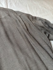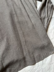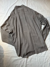 こちらも珍しいシャツです。まずは素材がレーヨンベースのシャツで落ち感、ドレープ感が出るとても良いシルエットになります。そして襟の形がとても珍しく、50年代〜60年代頃のフランスのワークシャツなどにみられる、細めで小さく角度の付いたワイドカラーになっていて、ドレープ感のある素材に対してよく考えられた襟形になっています。通が見るとわかるポイントだと思います。