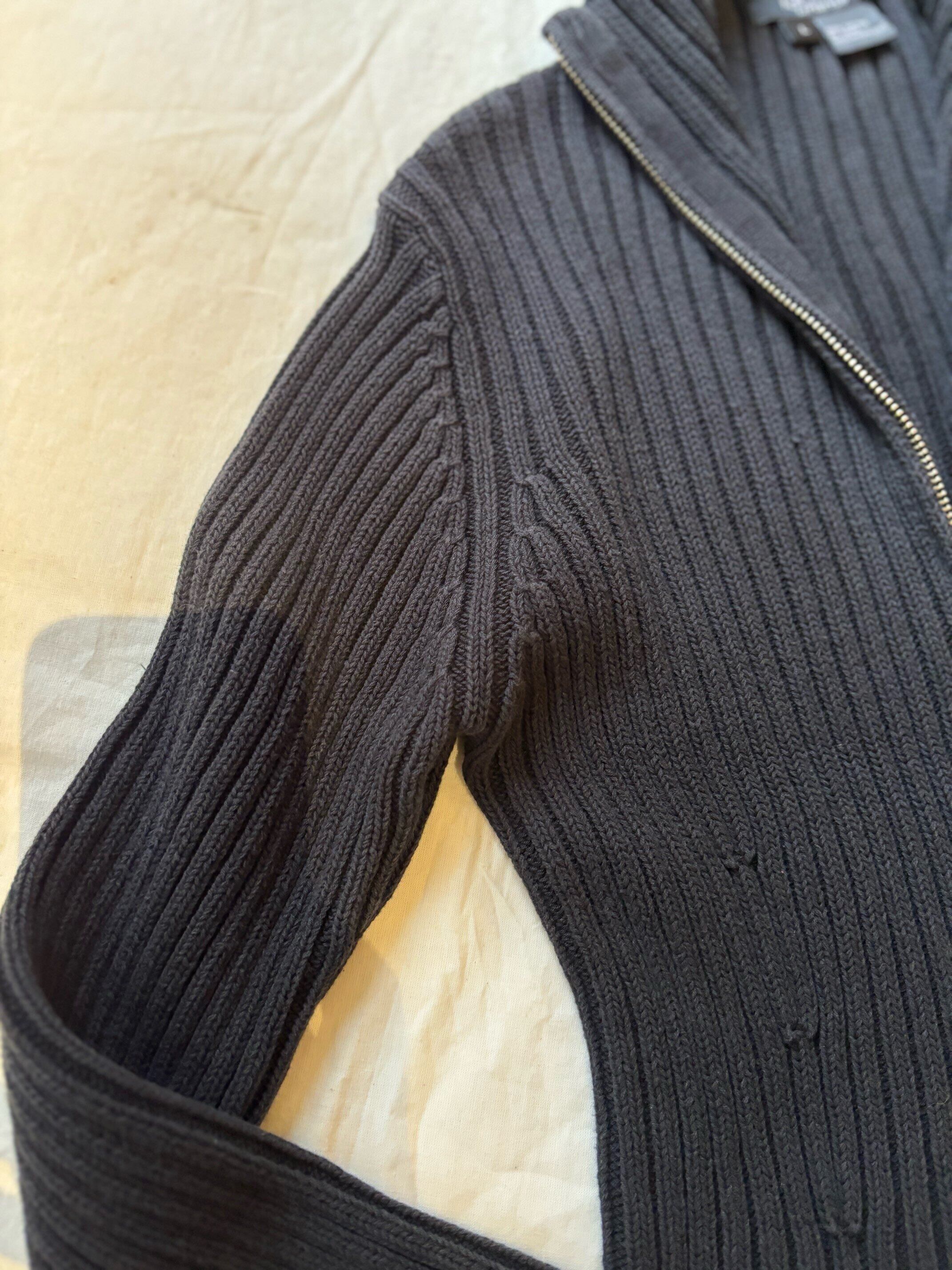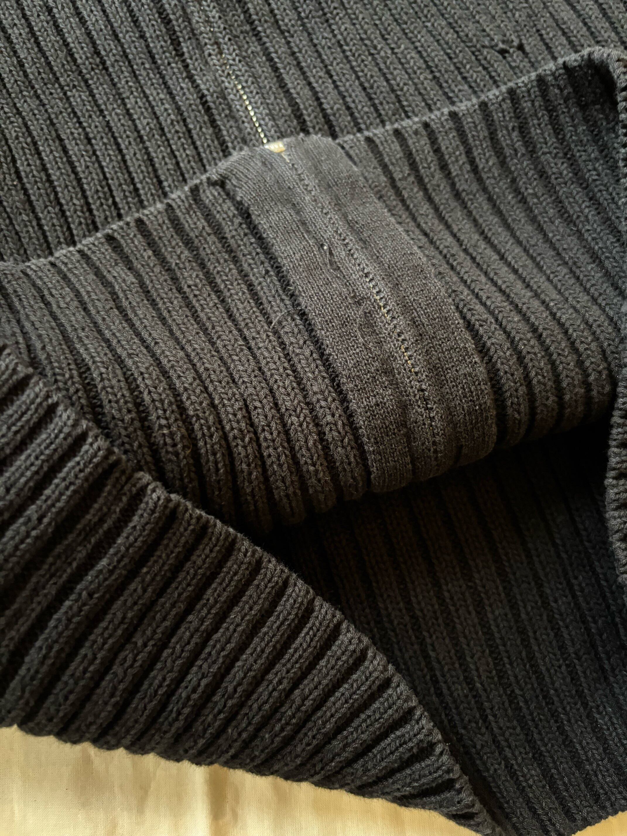 かなり乾いた素材感のコットンニットで、ミドルゲージくらいの厚さなので、着れる季節も長いニットです。ウールのチクチク感もなくニットが苦手な方でも着やすいと思います。
