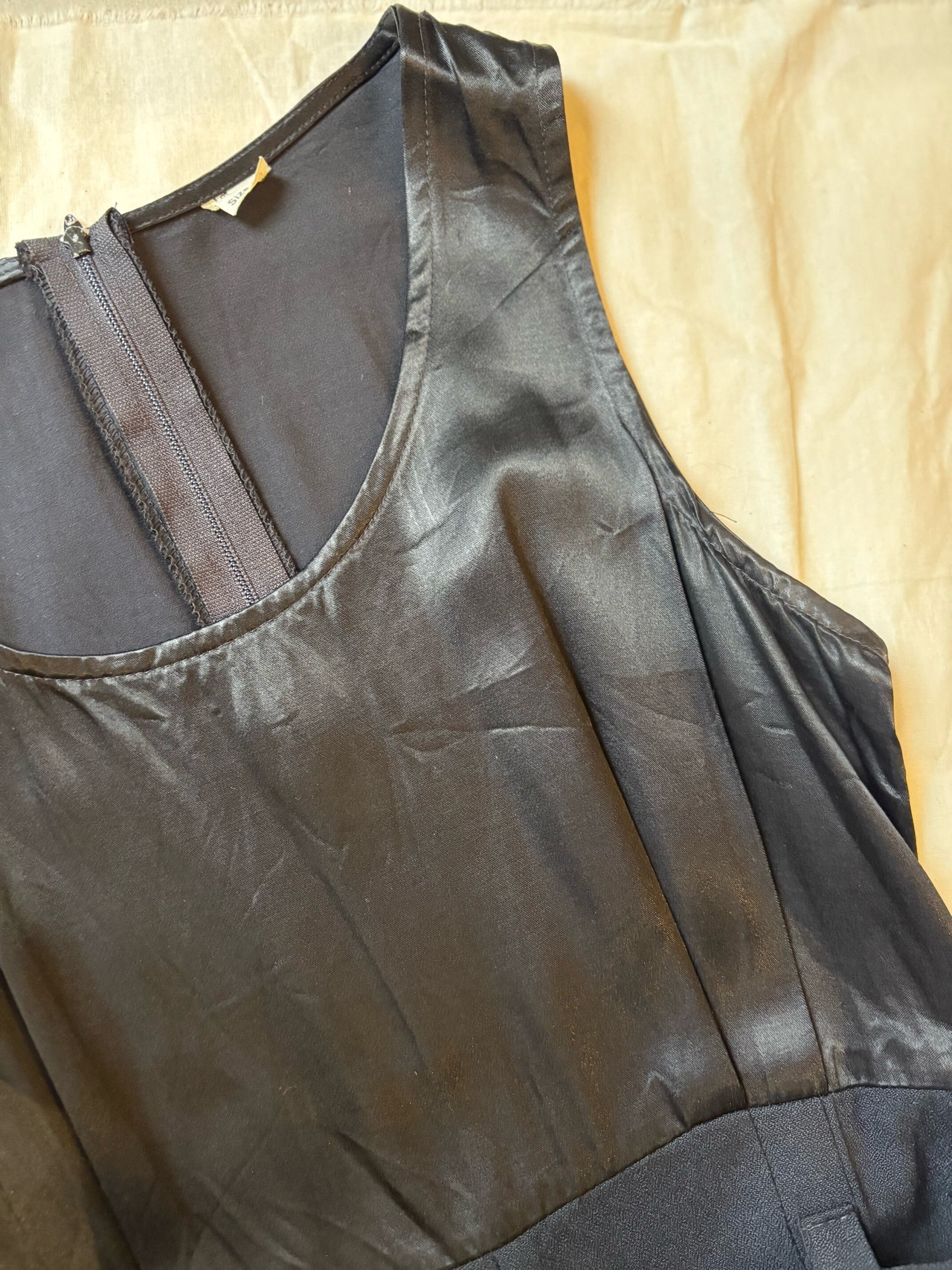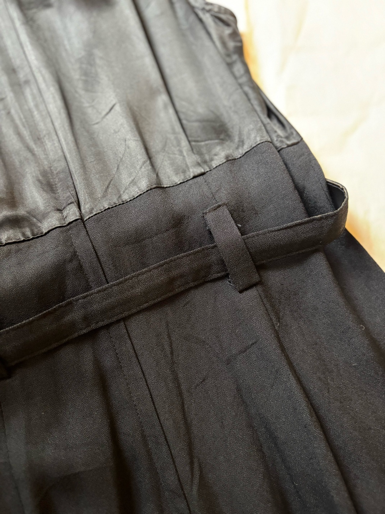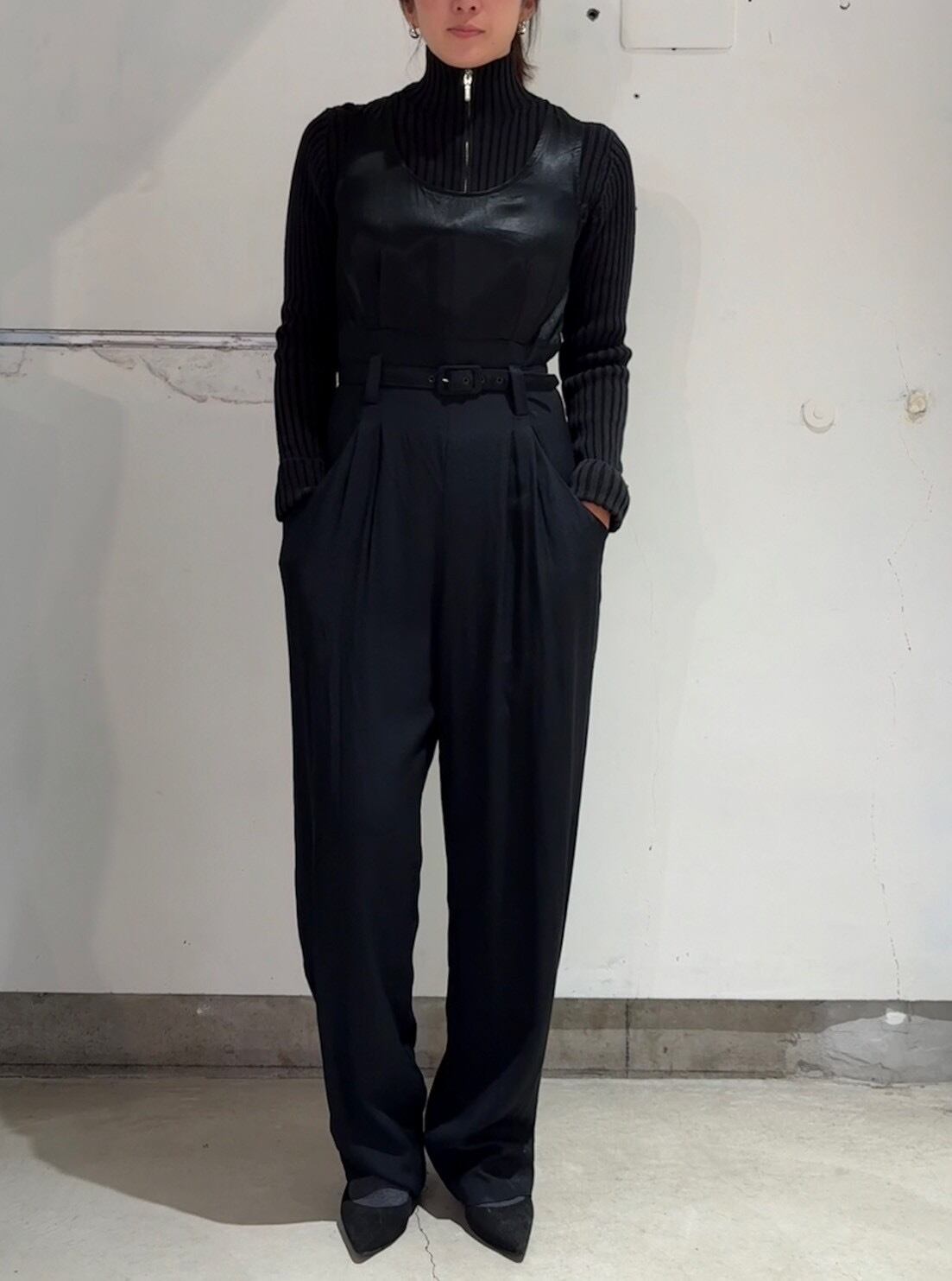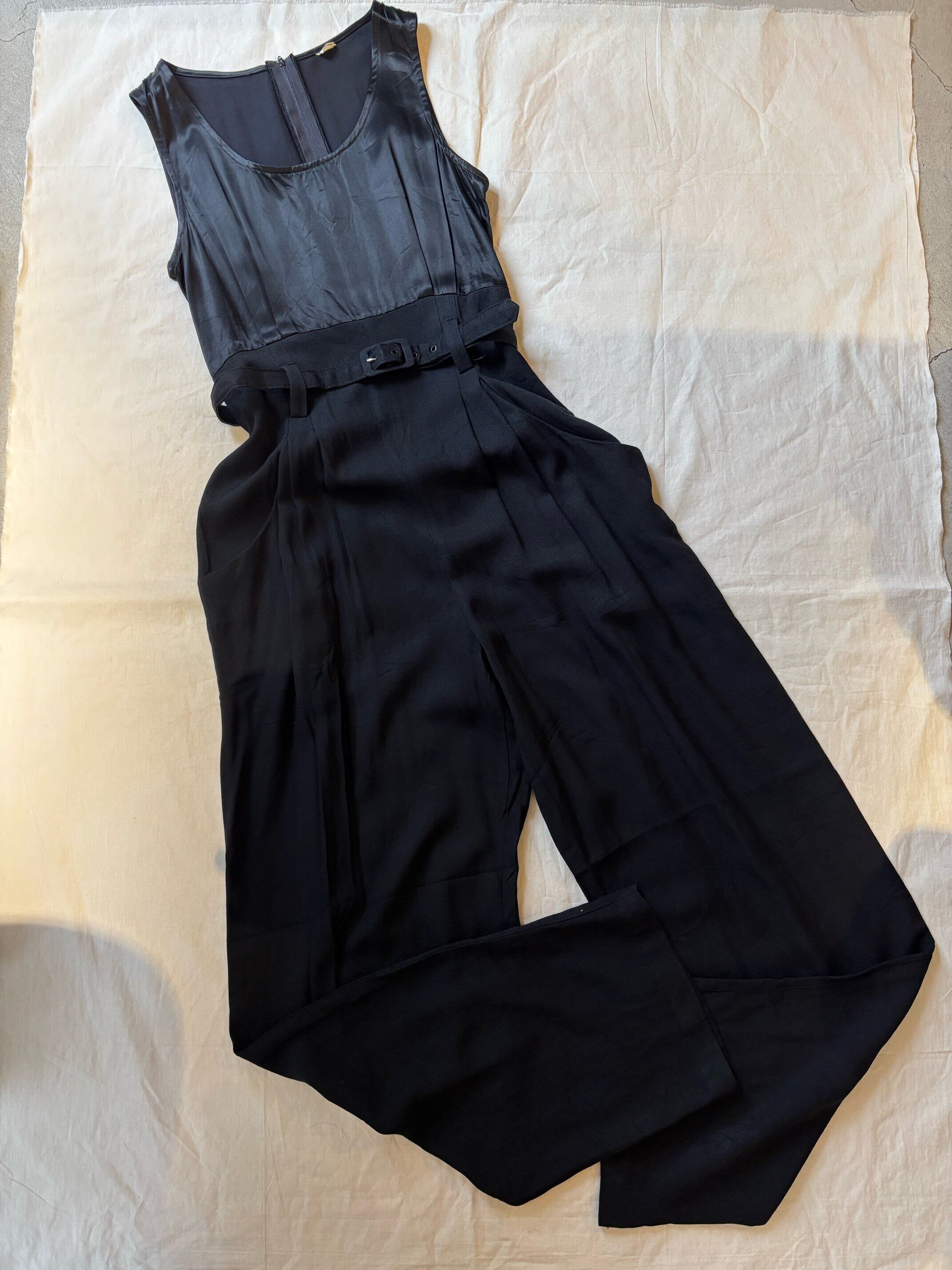 上半身が光沢のあるサテン、下半身は艶のない素材のとろみのあるレーヨン系の素材のジャンプスーツで、インナーを色々変えればほぼオールシーズン使えるアイテムです。