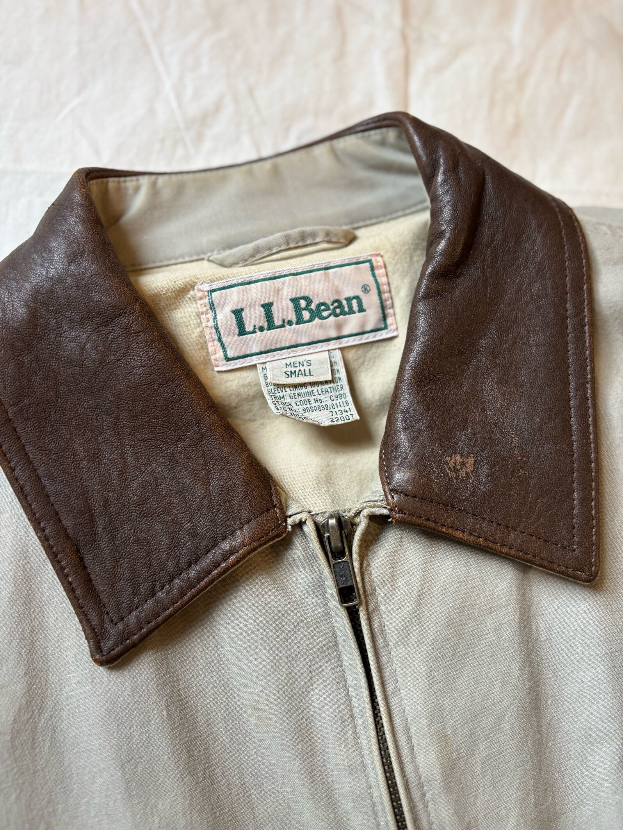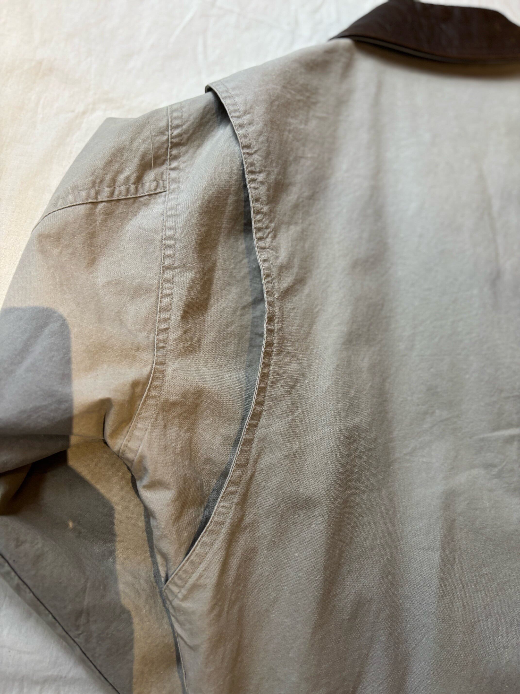 茶色のレザーの襟にコットンのカーキとベージュの中間のような絶妙な色目のボディ、大きな4つのポケットにアクションプリーツと、機能性も抜群のアイテムです。