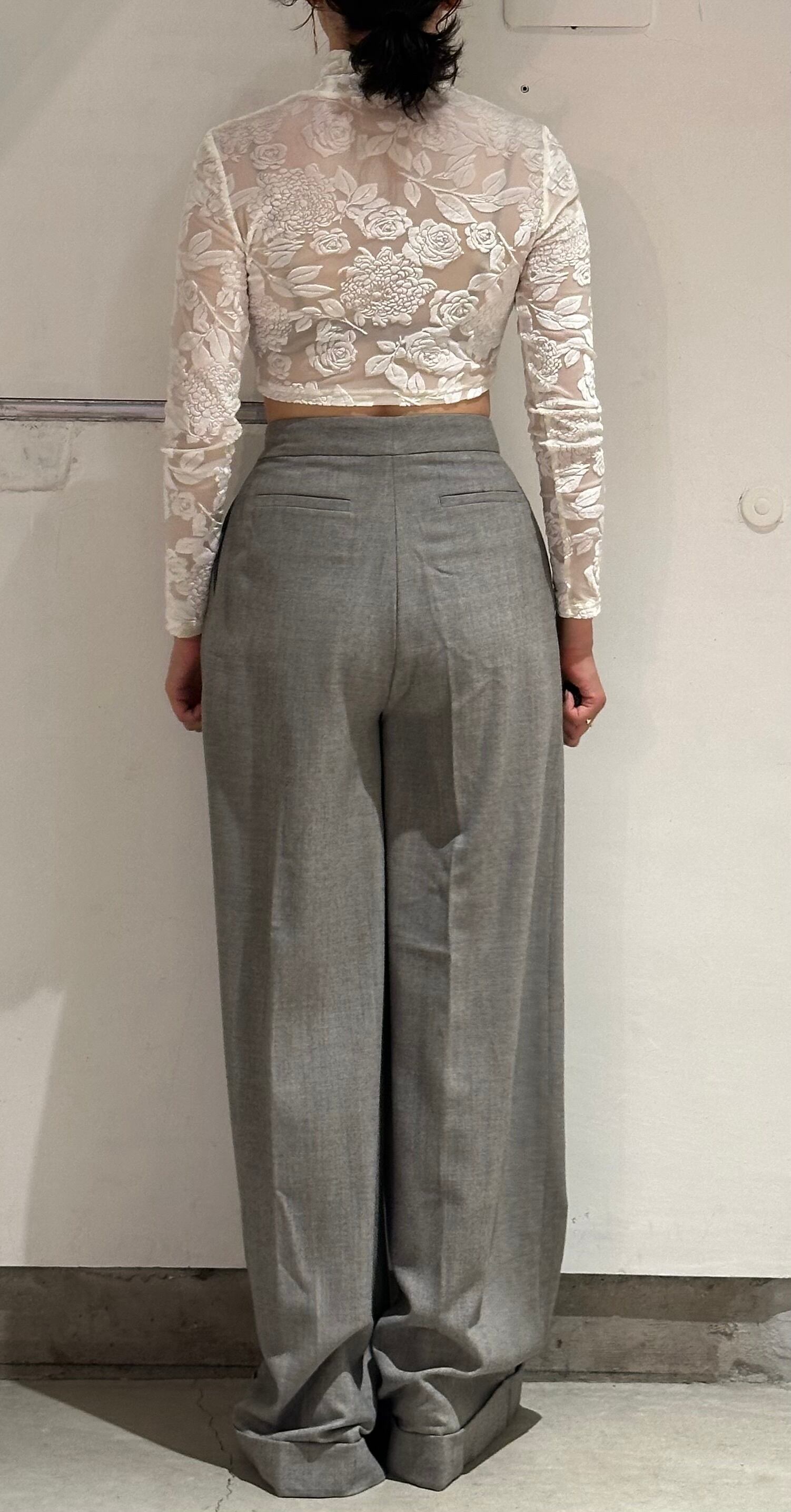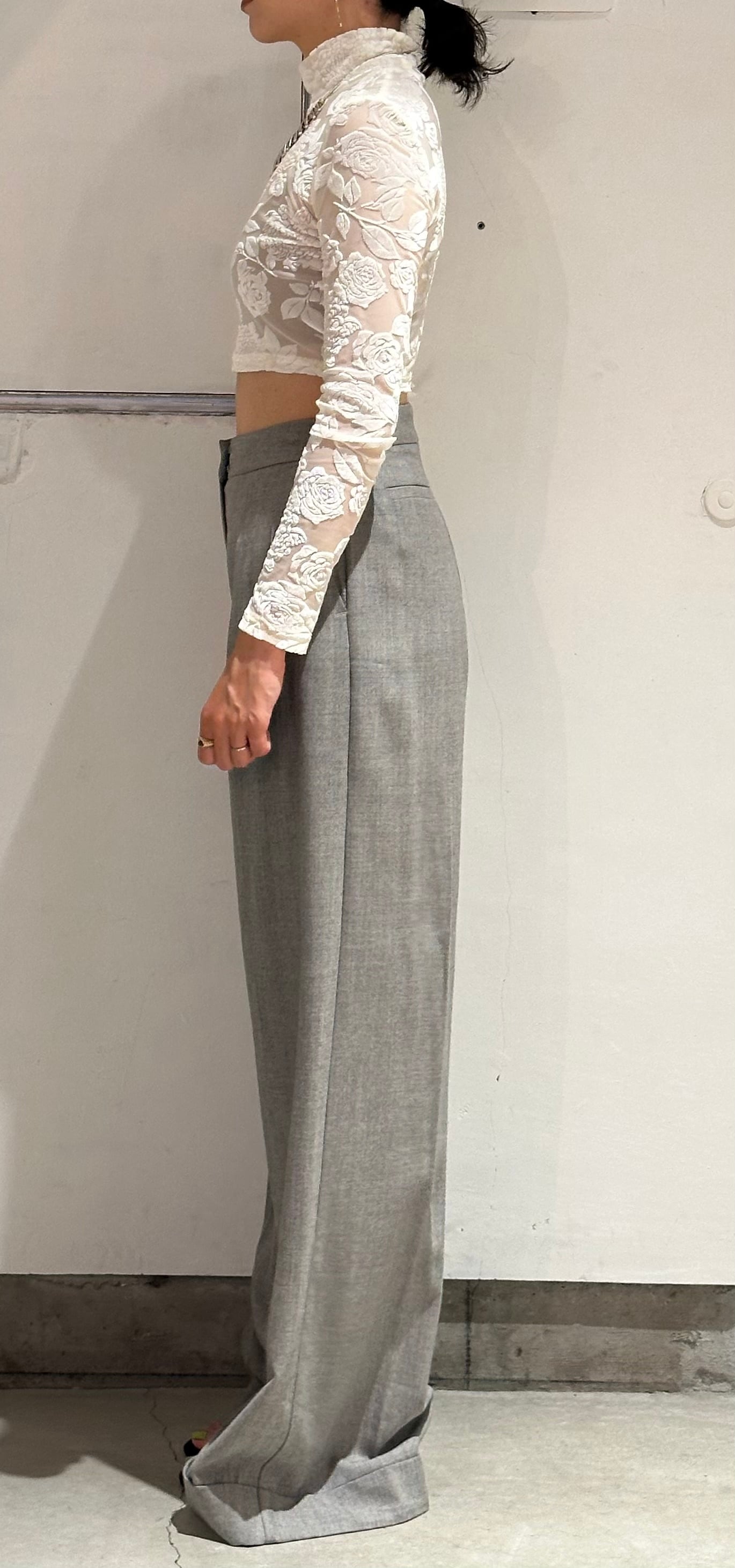 丈が外人サイズのボトムスですが笑ウエストが細く、シルエットもワイドフレアでとても良いシルエットのトラウザーズです。丈詰めは当店でも承っていますので少し調整して頂ければと思います。