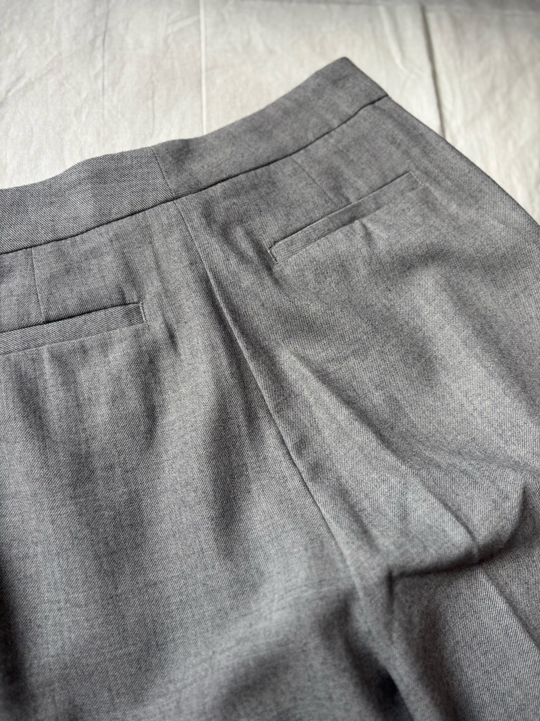 少し起毛感のあるウールにビスコースを混ぜてトロみが出るような素材感にしています。生地自体はウールサキソニーです。このような化学繊維を入れる事でシルエットや素材感もそうですが、生地自体も丈夫になるメリットがあります。