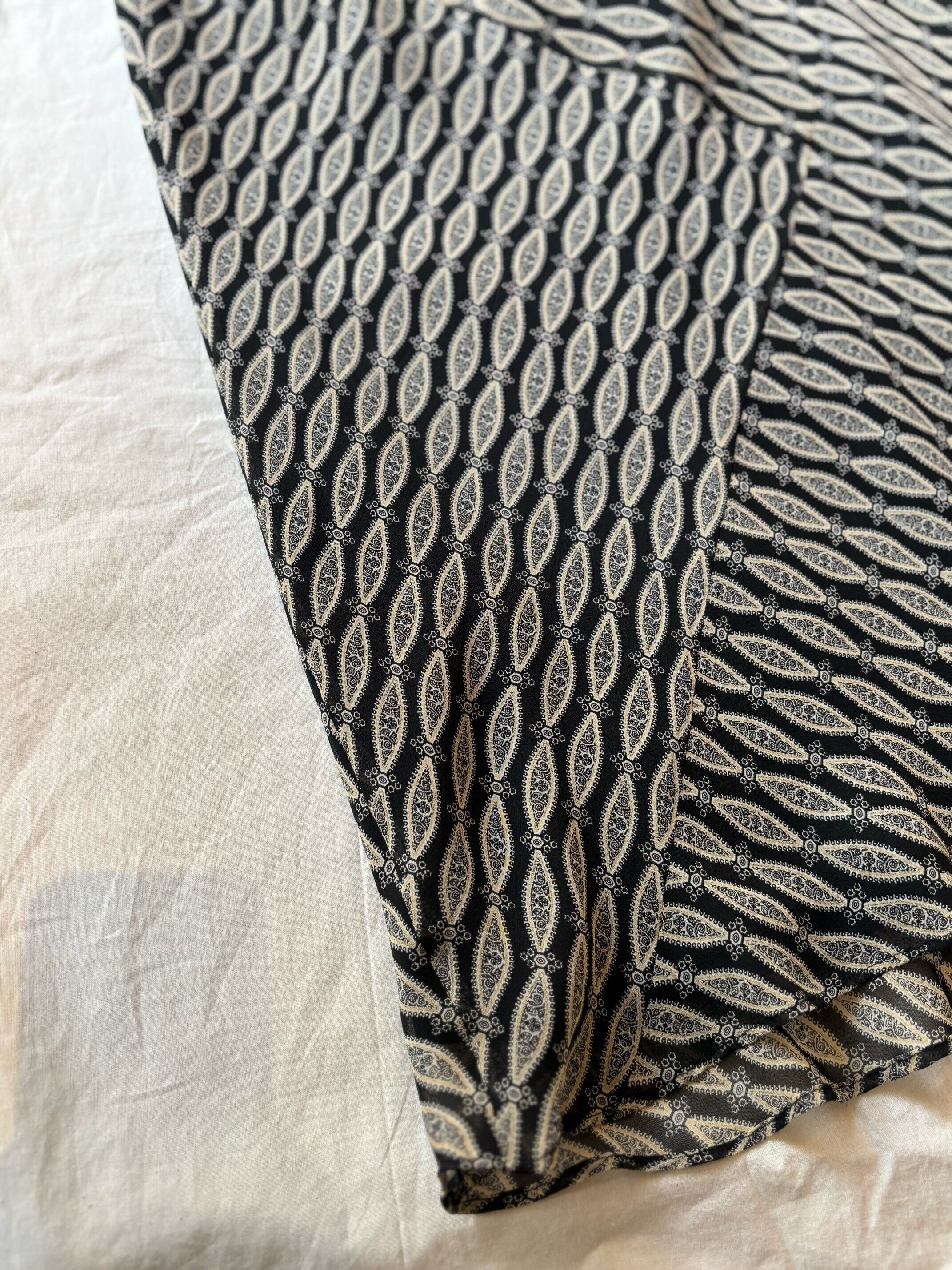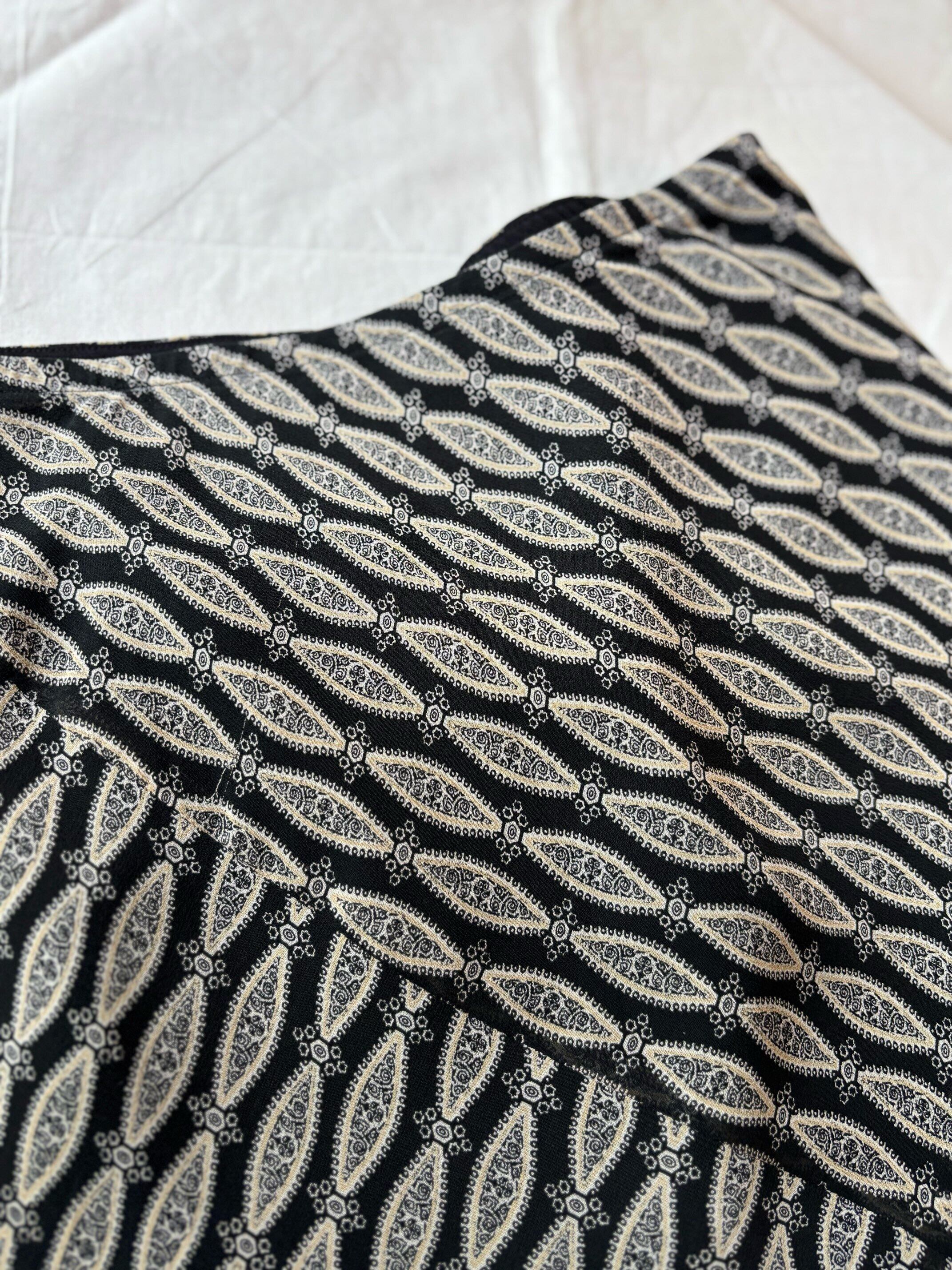 薄めなブラックをベースに大きめなペイズリー柄が描かれたミディ丈のスカートになります。少しだけ裾がフレアになっているのも可愛いシルエットだと思います。