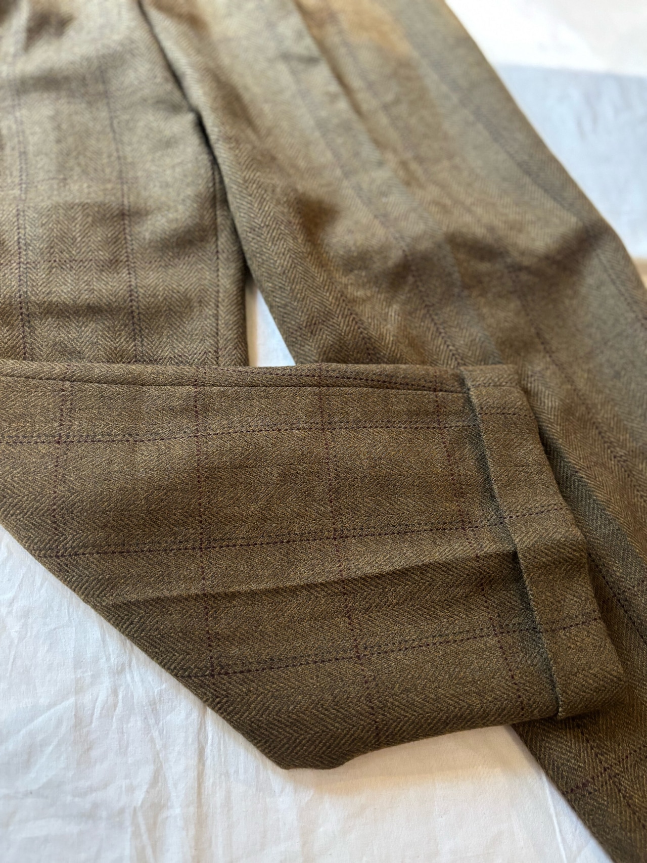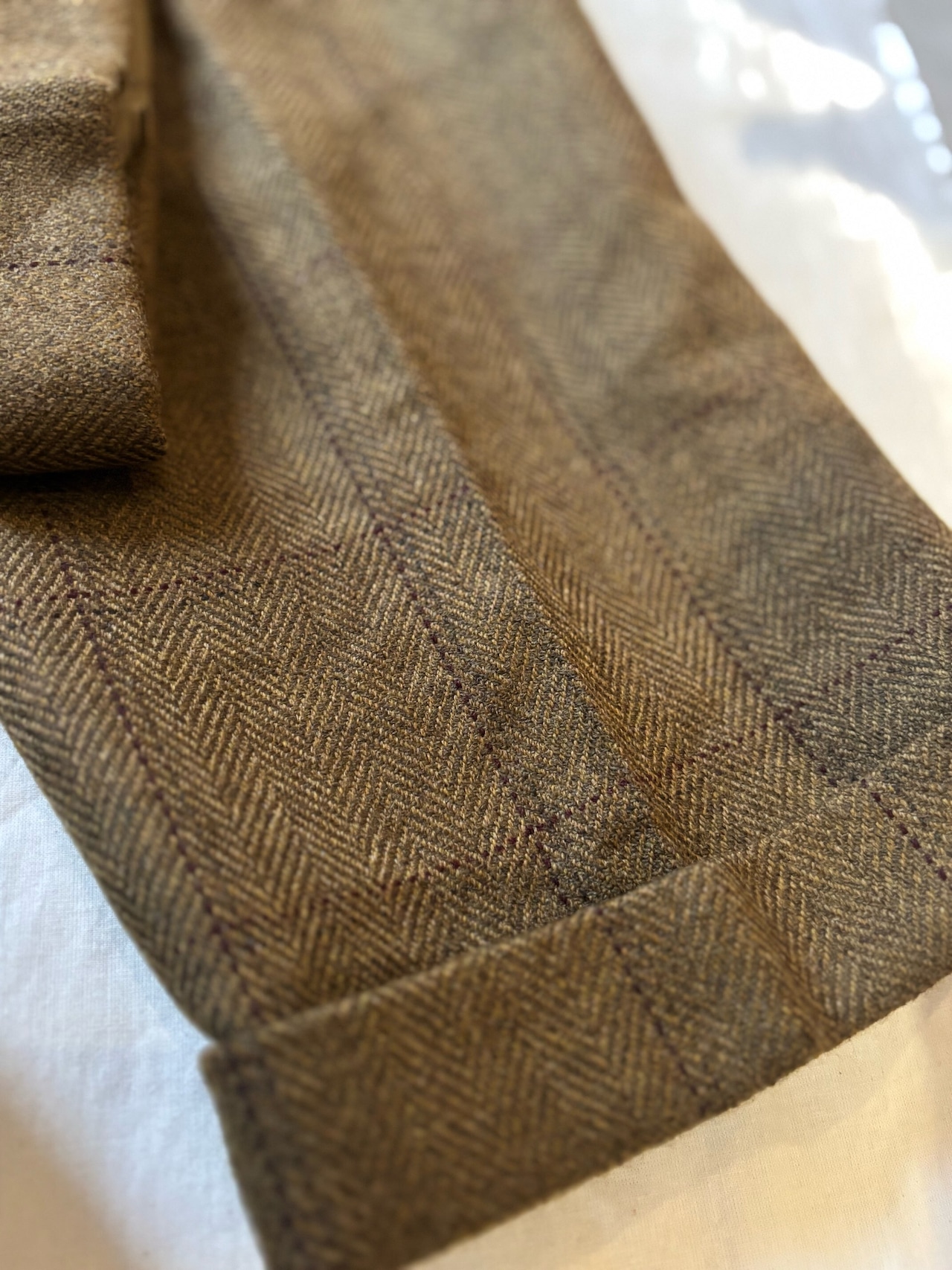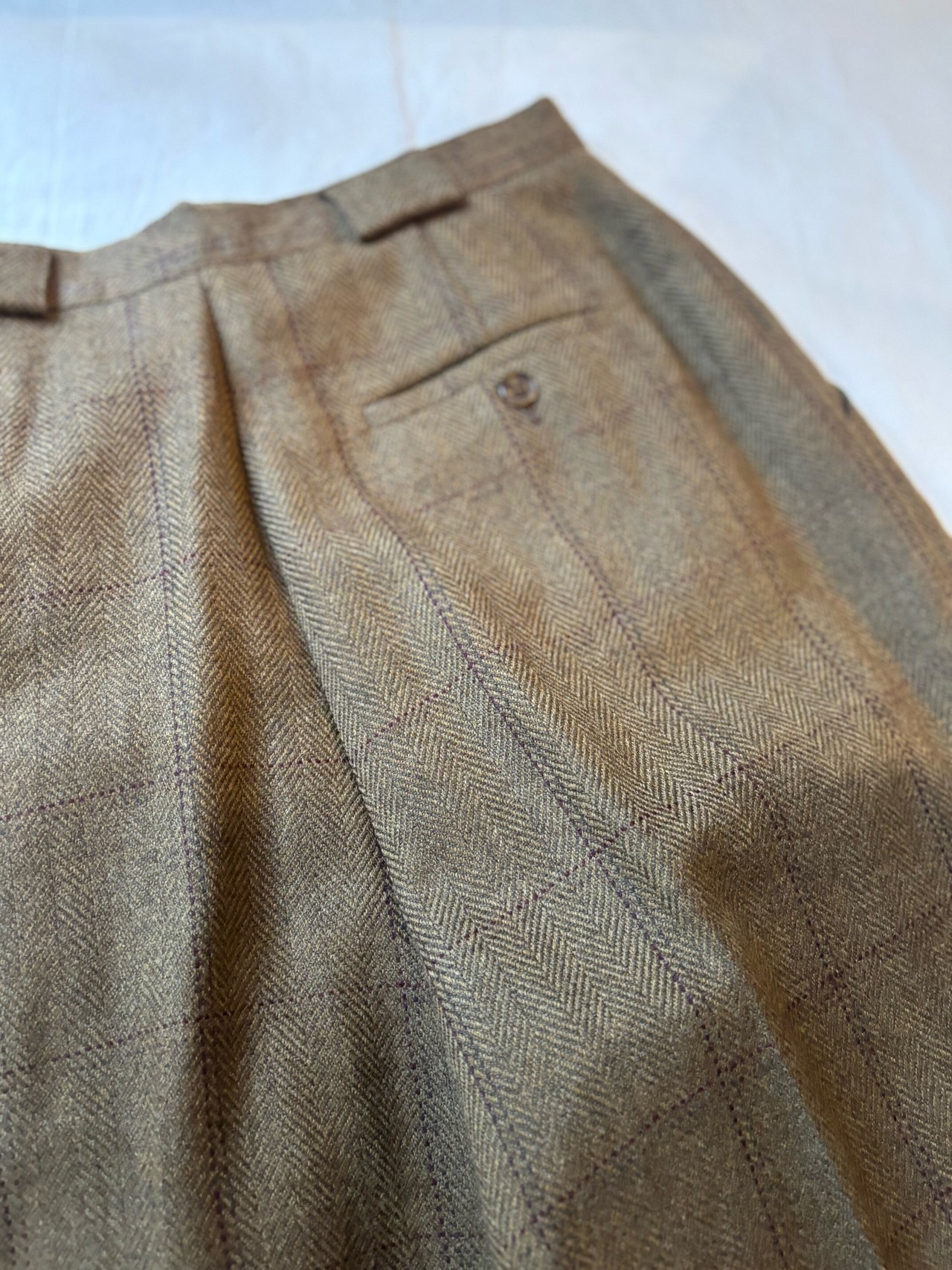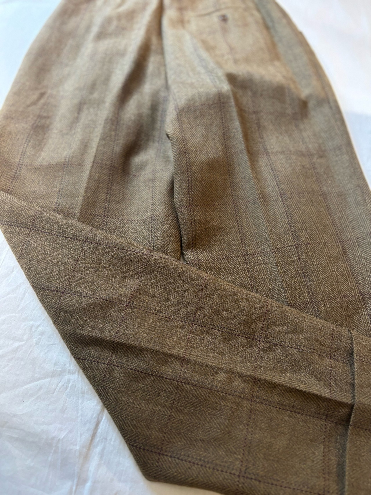 クラシックなブリティッシュトラッドなオーバーペンの柄にヘリンボーン生地の柔らかなウール、カラーはアース系のカーキとブラウンの中間のような色でとても良いトラウザーズです。talon zipが付くので年代も古い割にとても綺麗な状態のパンツです。
