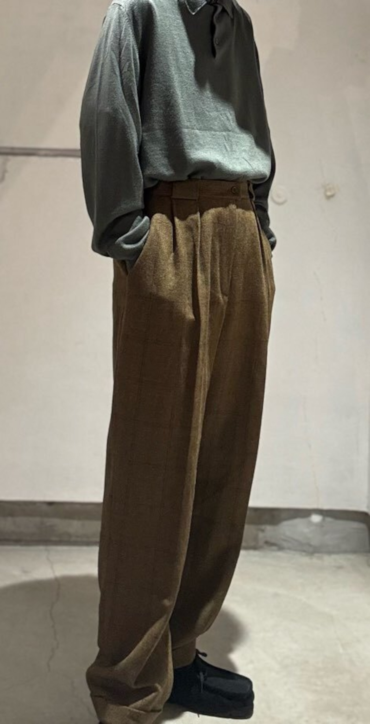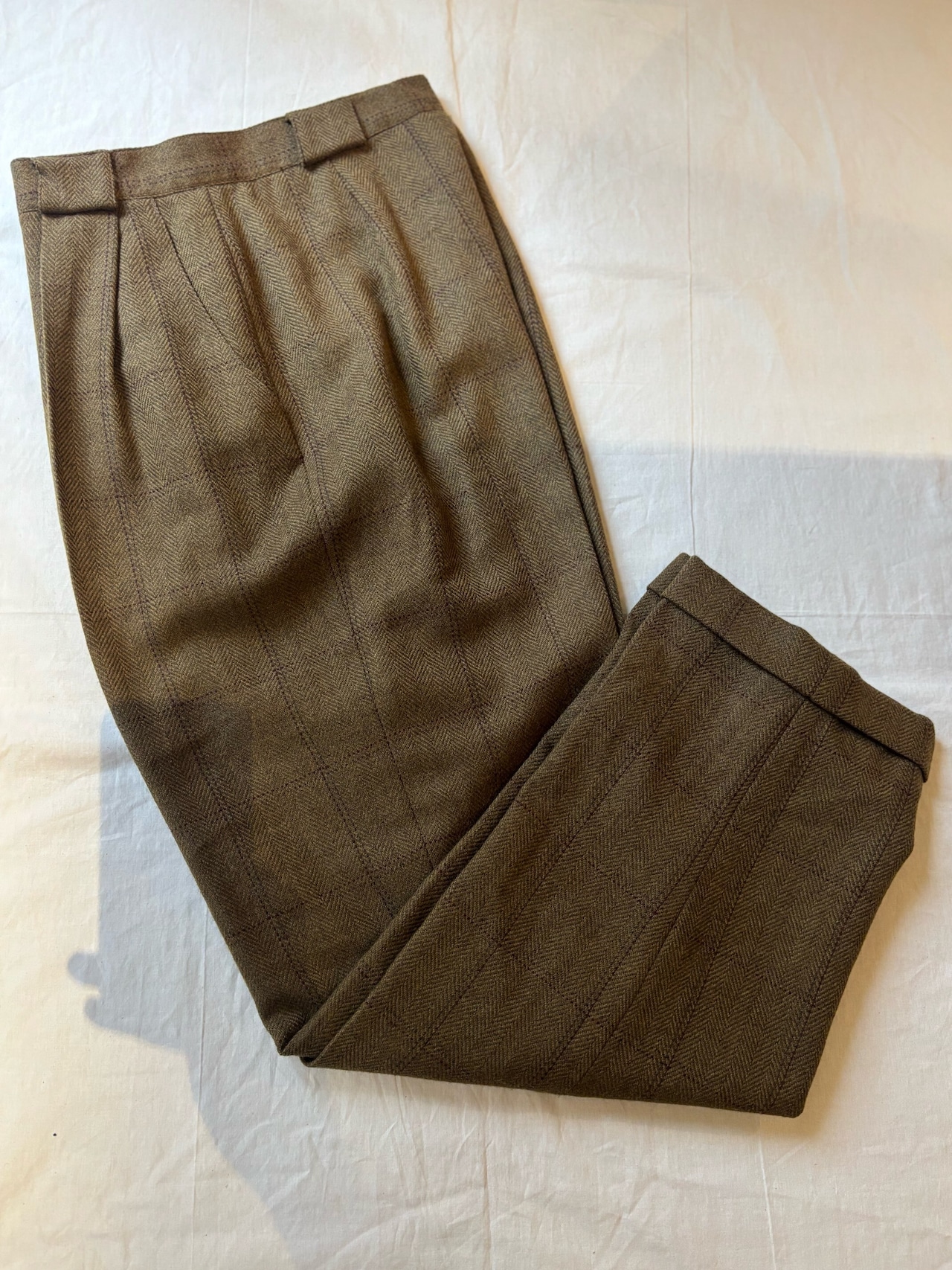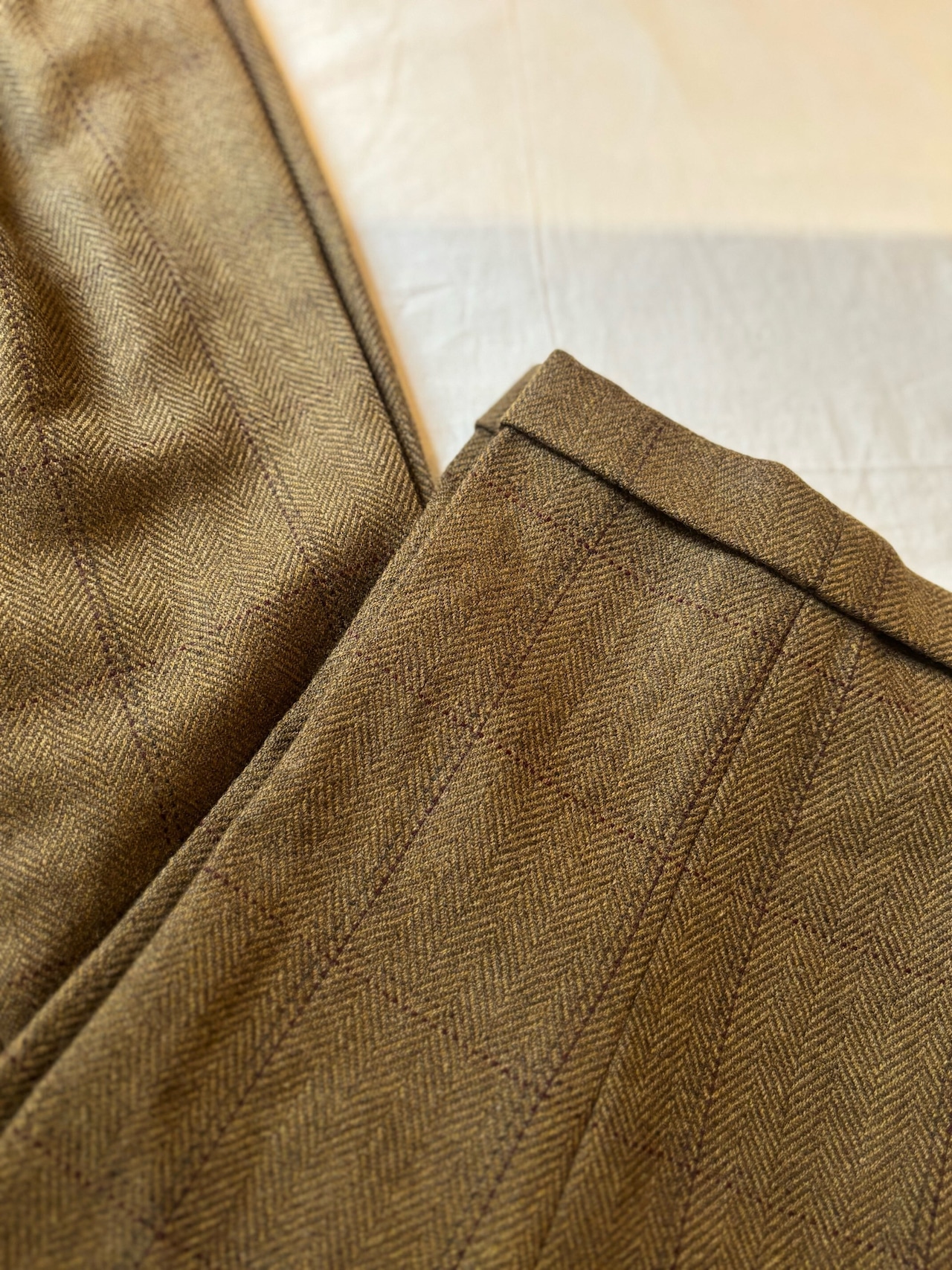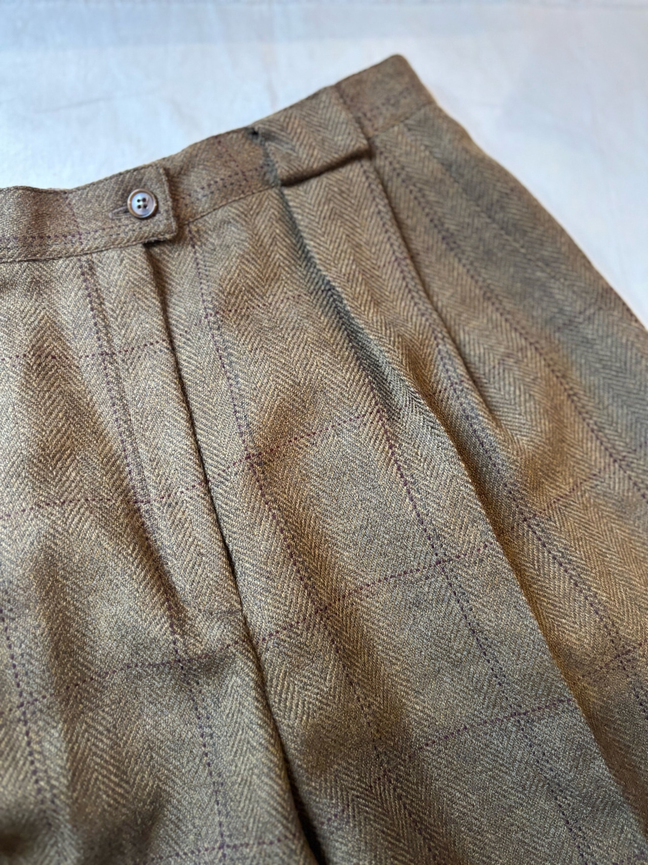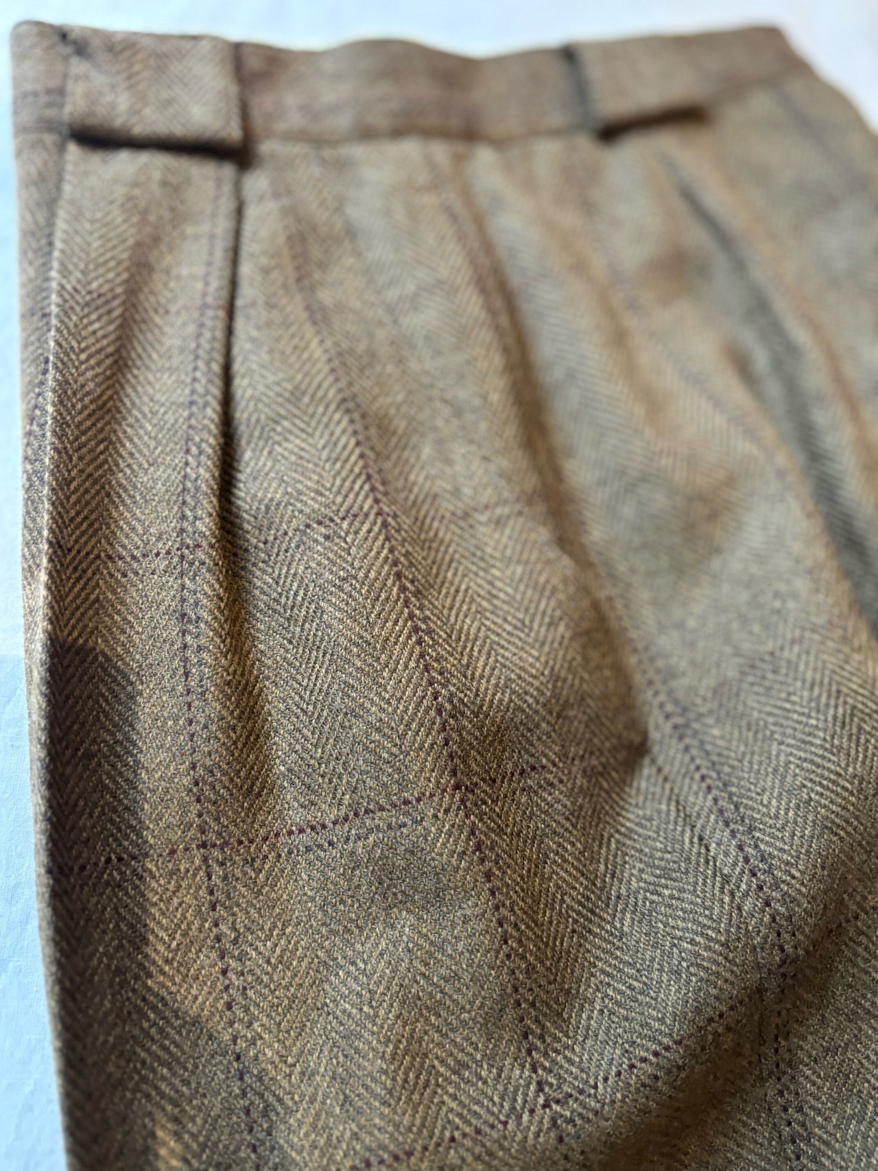 クラシックなブリティッシュトラッドなオーバーペンの柄にヘリンボーン生地の柔らかなウール、カラーはアース系のカーキとブラウンの中間のような色でとても良いトラウザーズです。talon zipが付くので年代も古い割にとても綺麗な状態のパンツです。