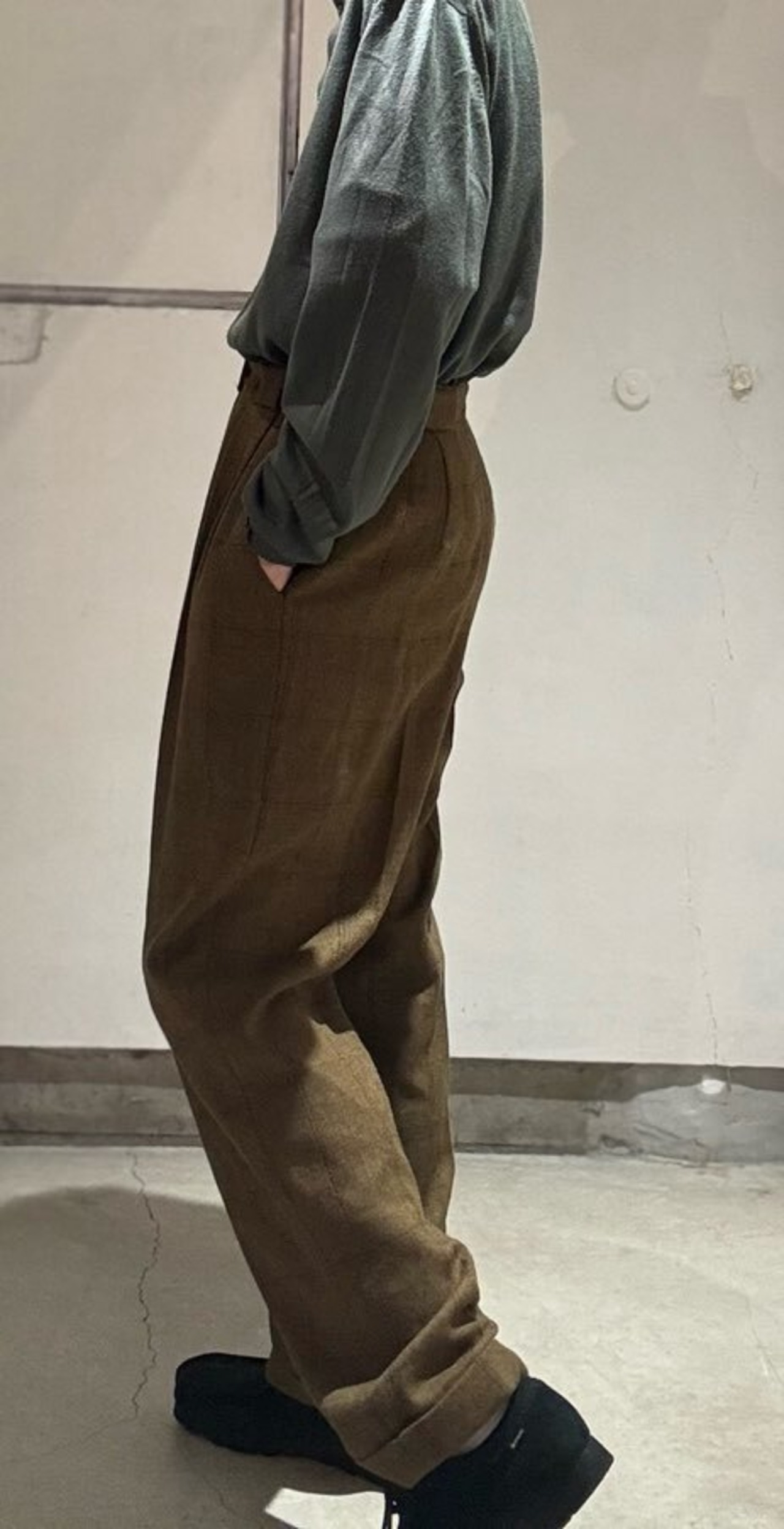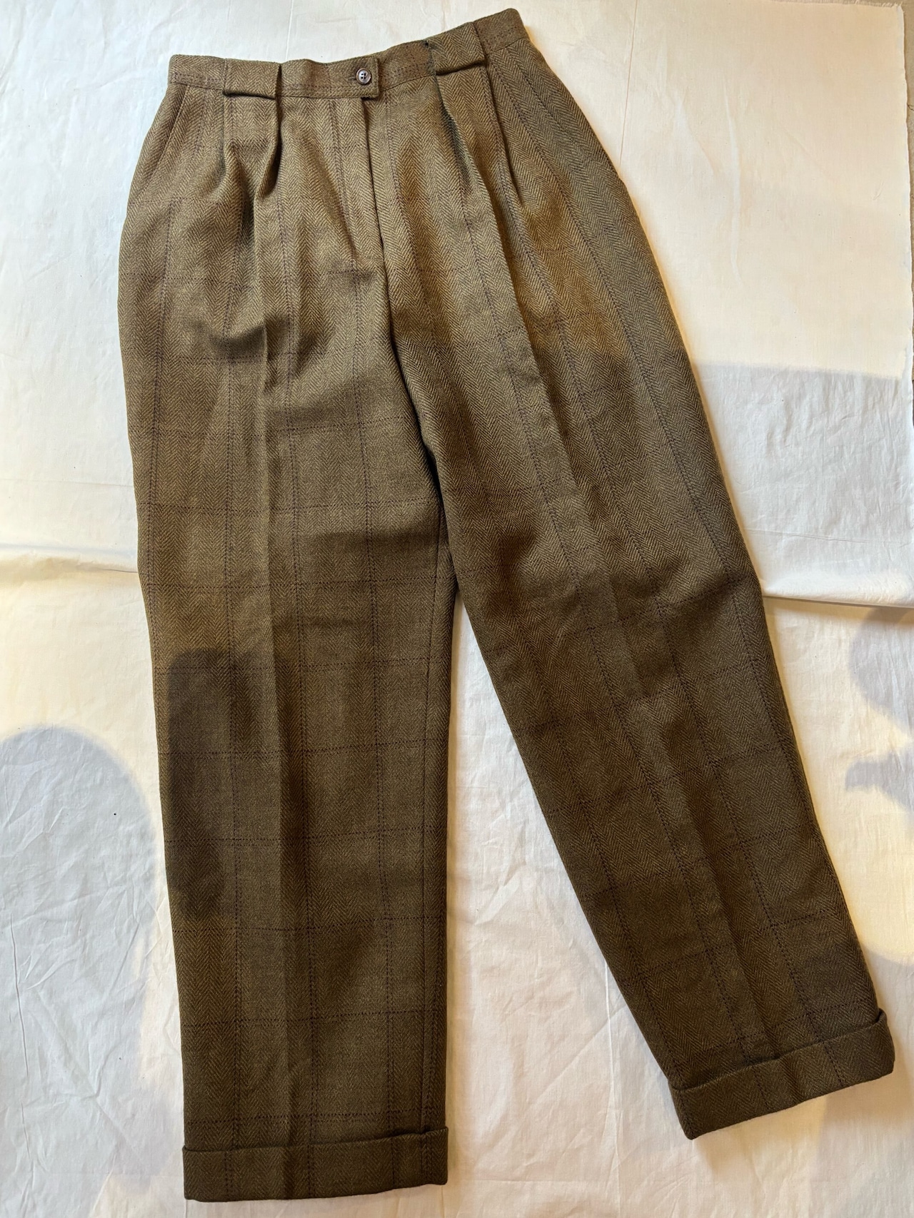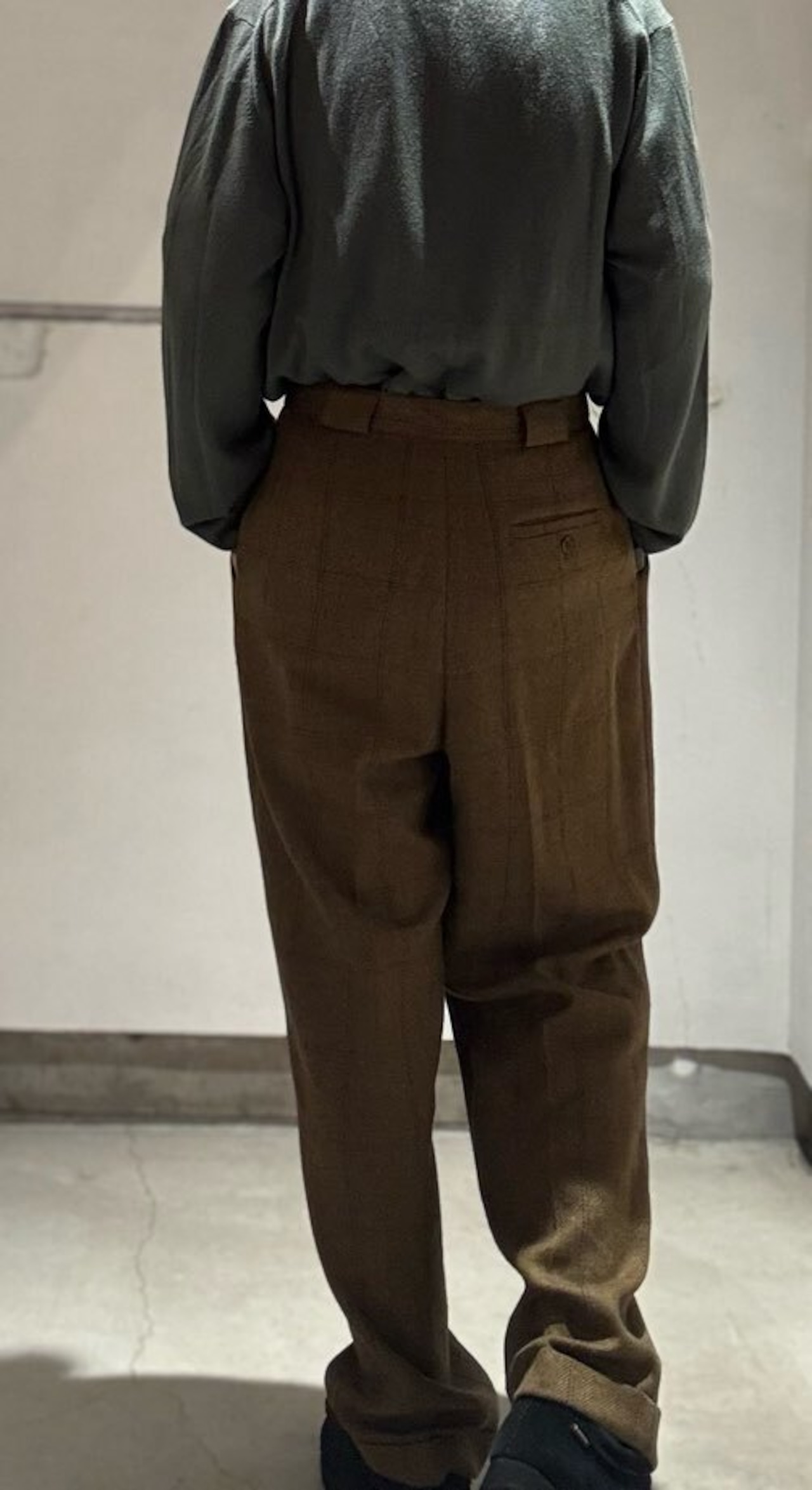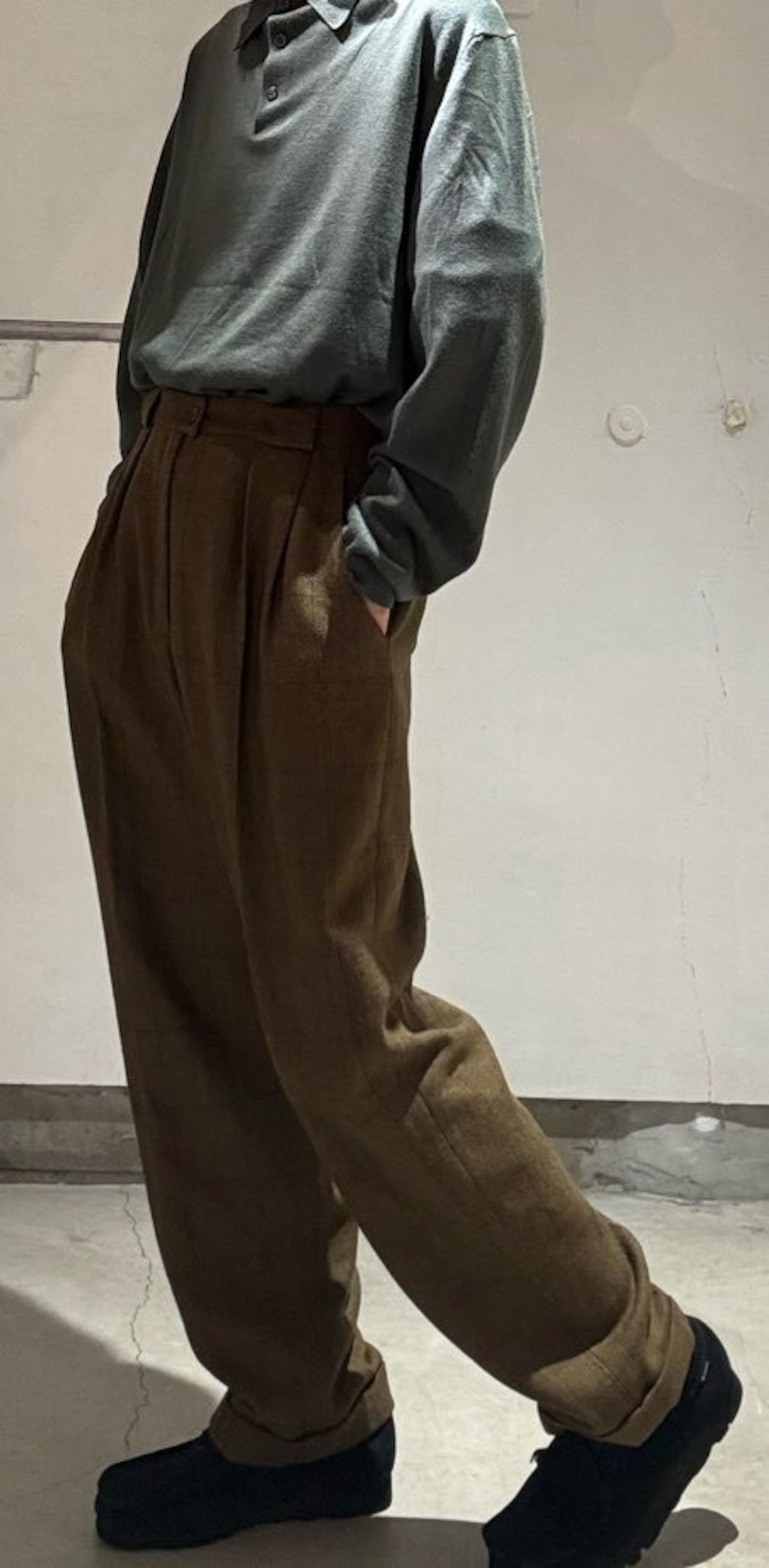 クラシックなブリティッシュトラッドなオーバーペンの柄にヘリンボーン生地の柔らかなウール、カラーはアース系のカーキとブラウンの中間のような色でとても良いトラウザーズです。talon zipが付くので年代も古い割にとても綺麗な状態のパンツです。