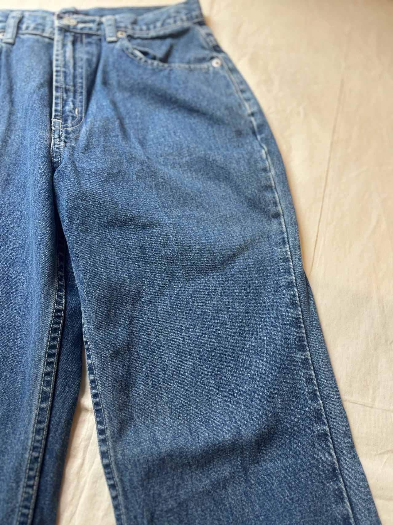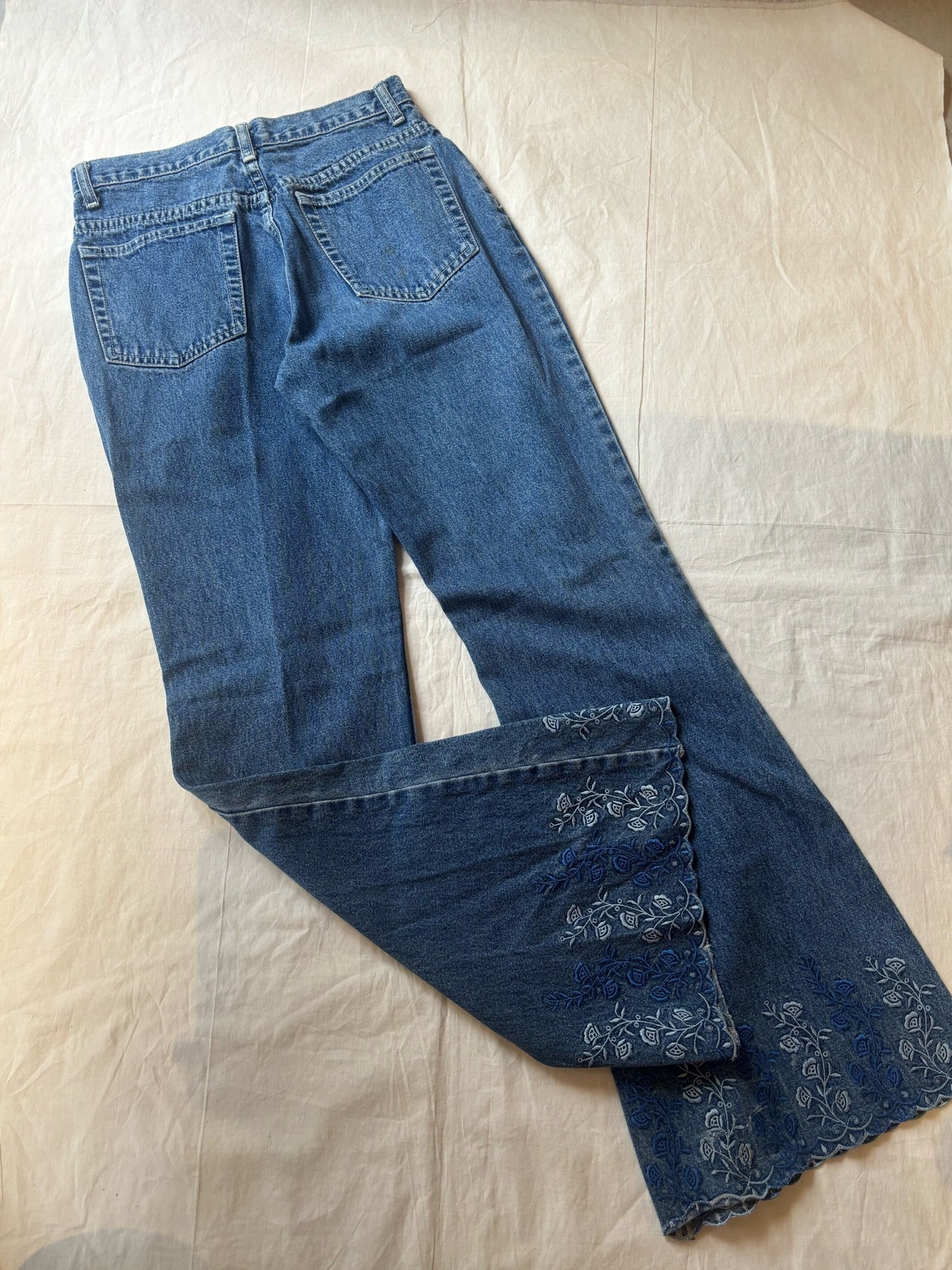 裾に花の刺繍が施されたデニムでとてもシルエットが綺麗です。裾もナミナミになっていてとても可愛いです。