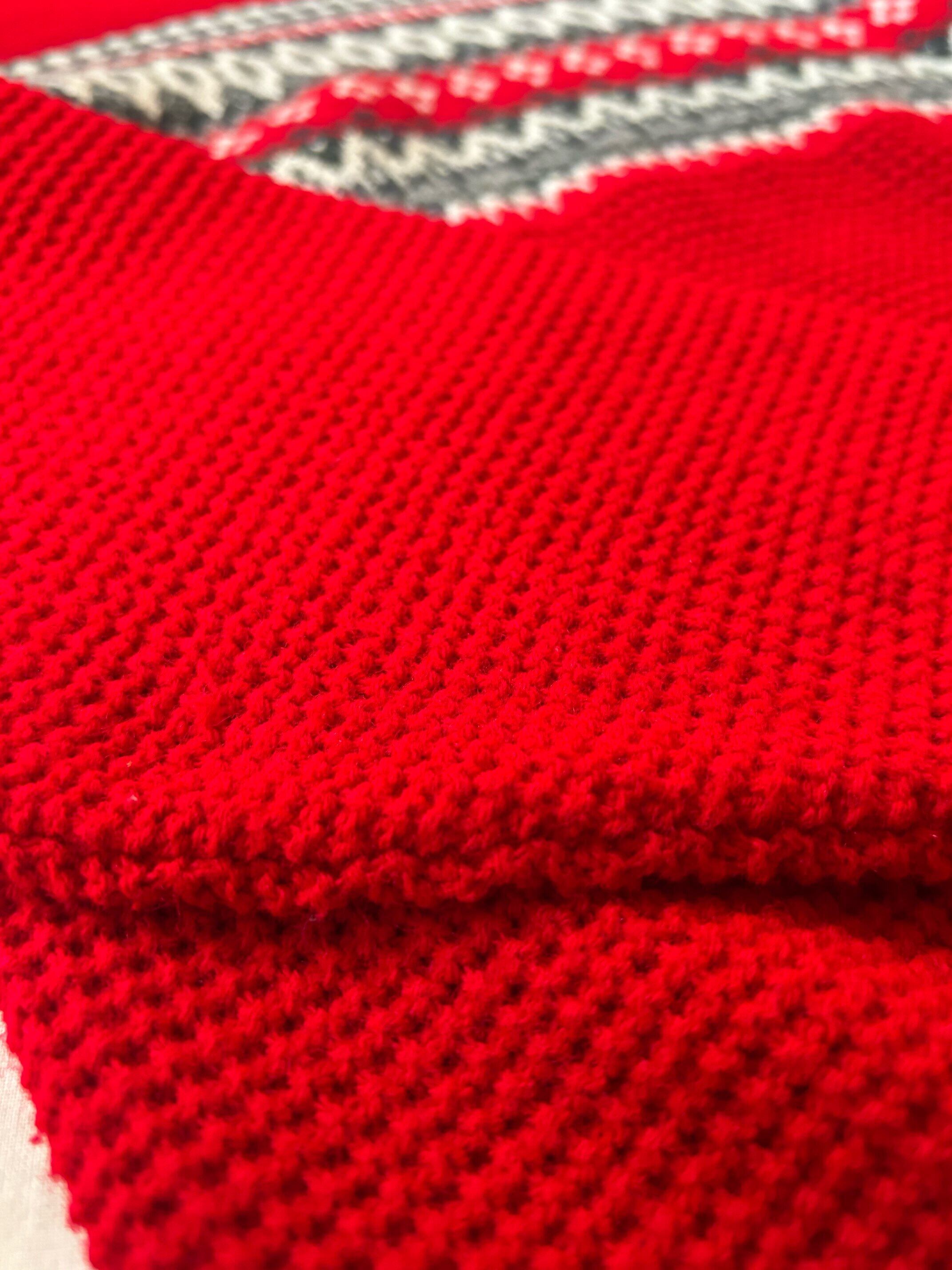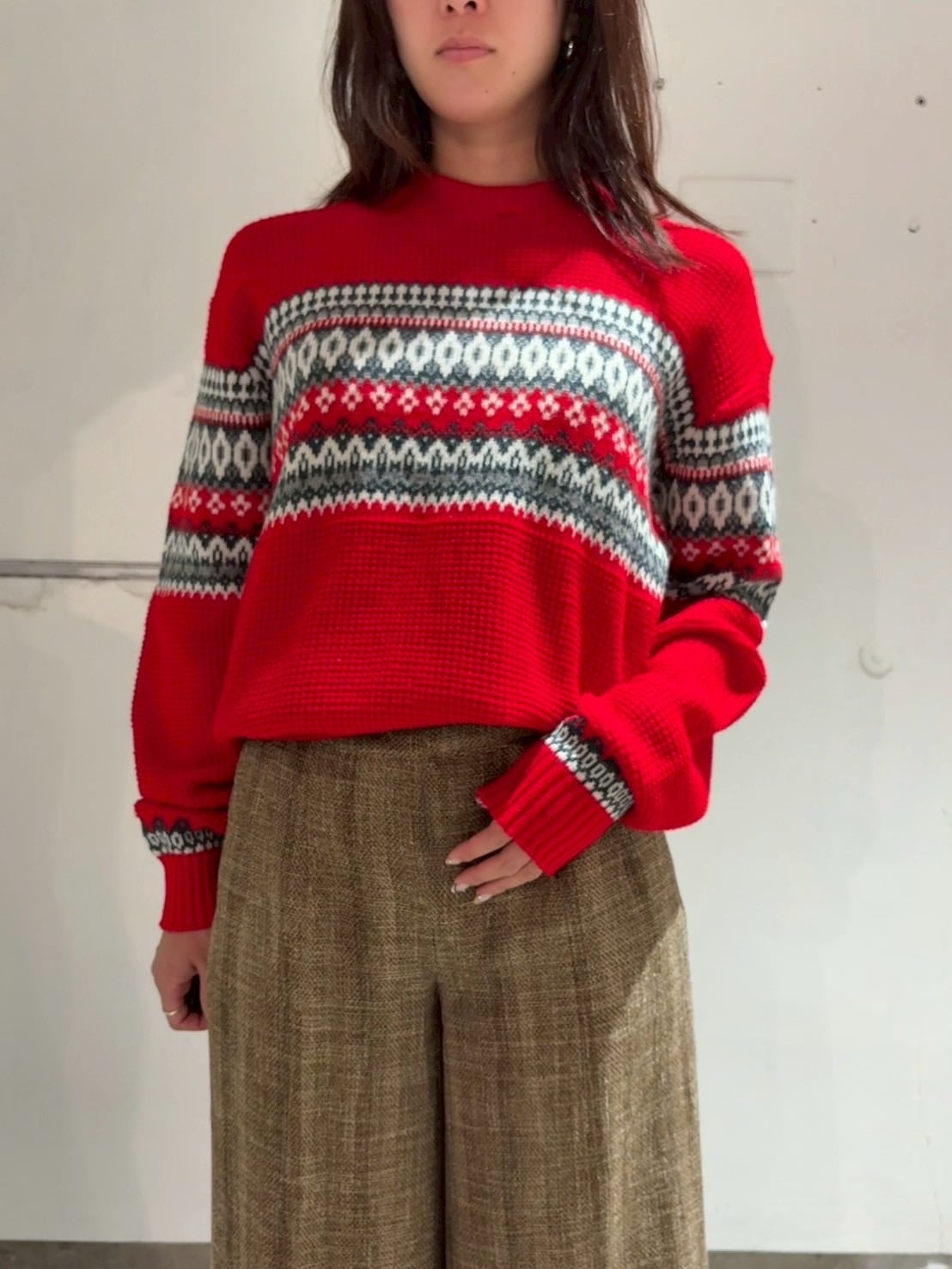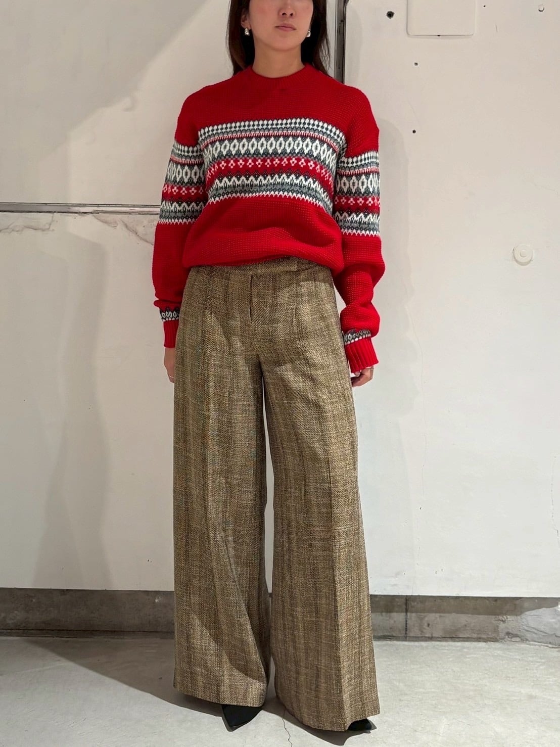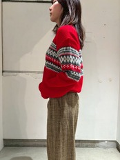 良いカラーリングのノルディックニットですね。今期トレンドカラーのレッドですが、なかなか今の日本人はチャレンジをしない方が多いので赤を着る方が少ないですが、実は赤は色合わせが難しく無いアイテムなのと、赤の服はとてもいい服が多いのでとてもオススメです。
