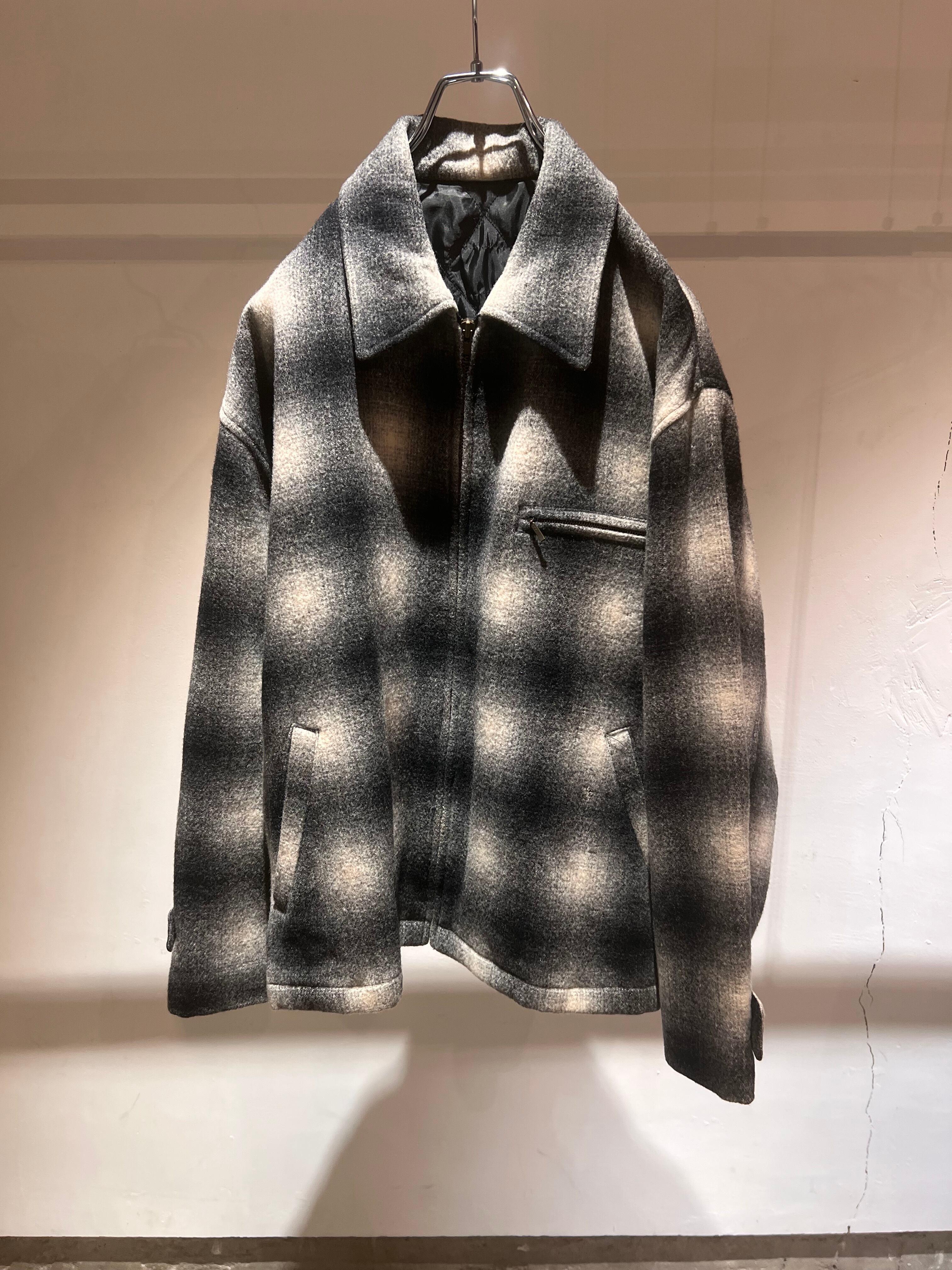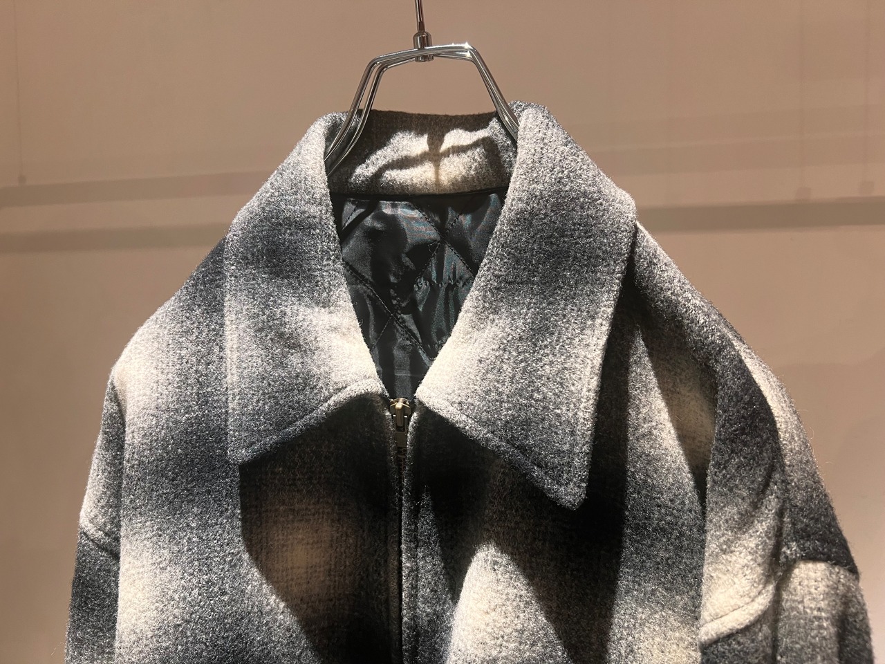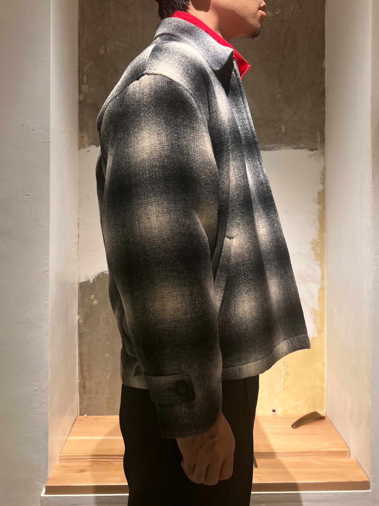 ブラックのオンブレチェックに、ボックスシルエットで、サイドには共生地のアジャスターがついています。