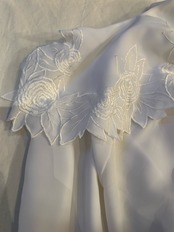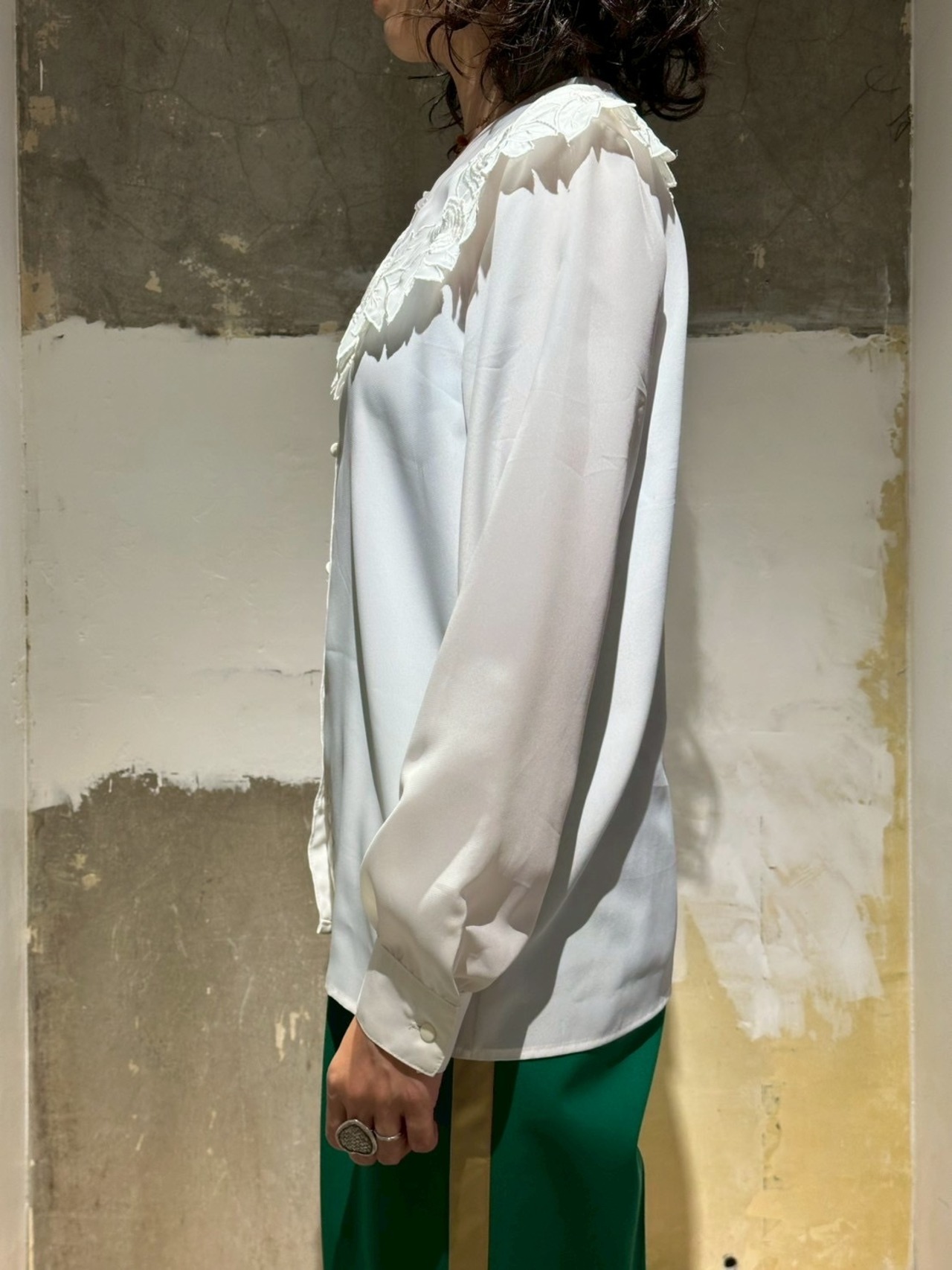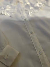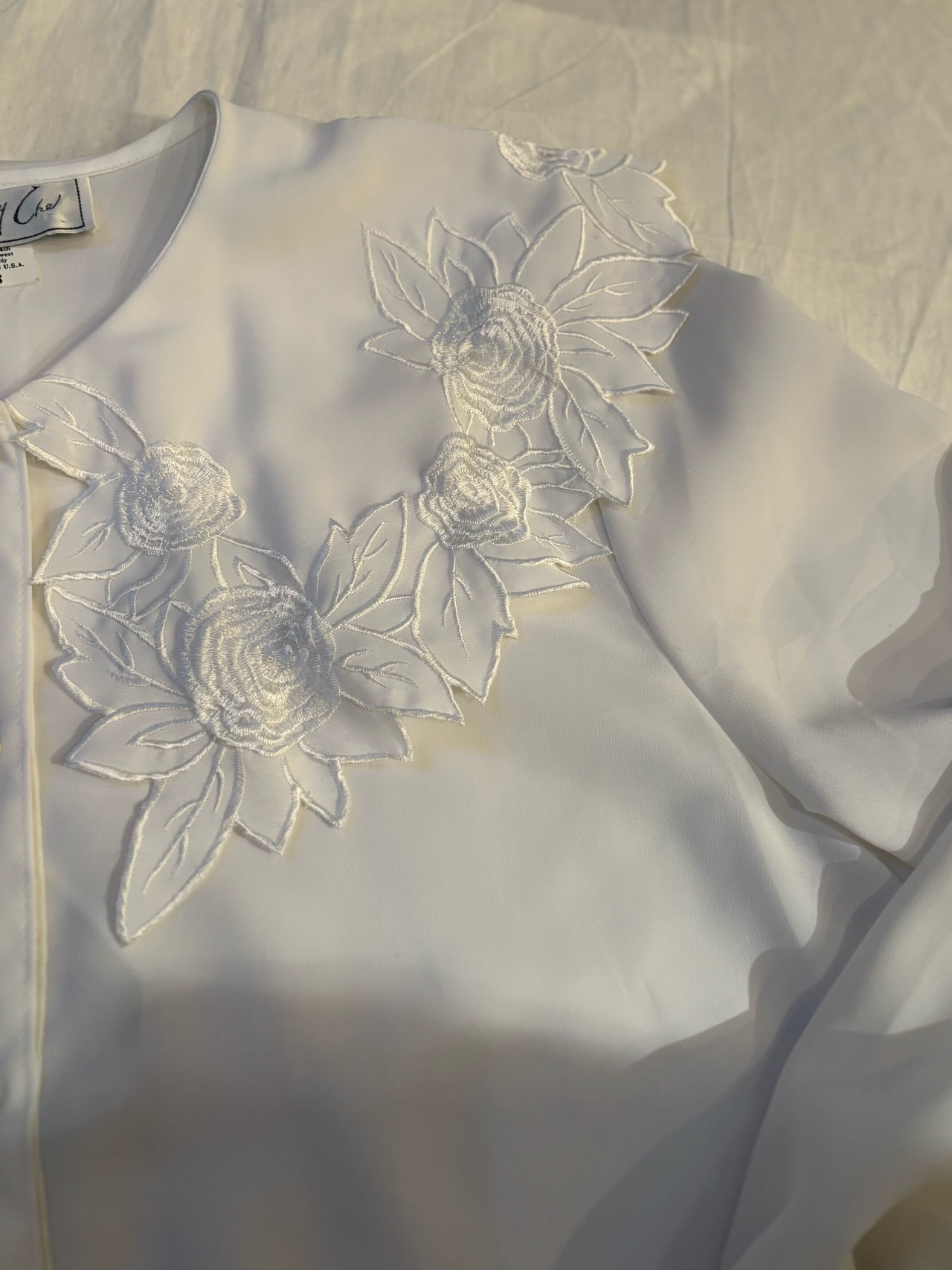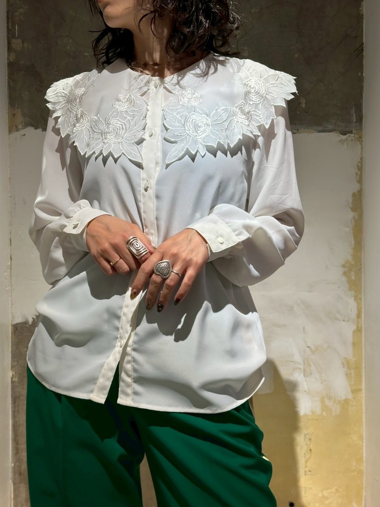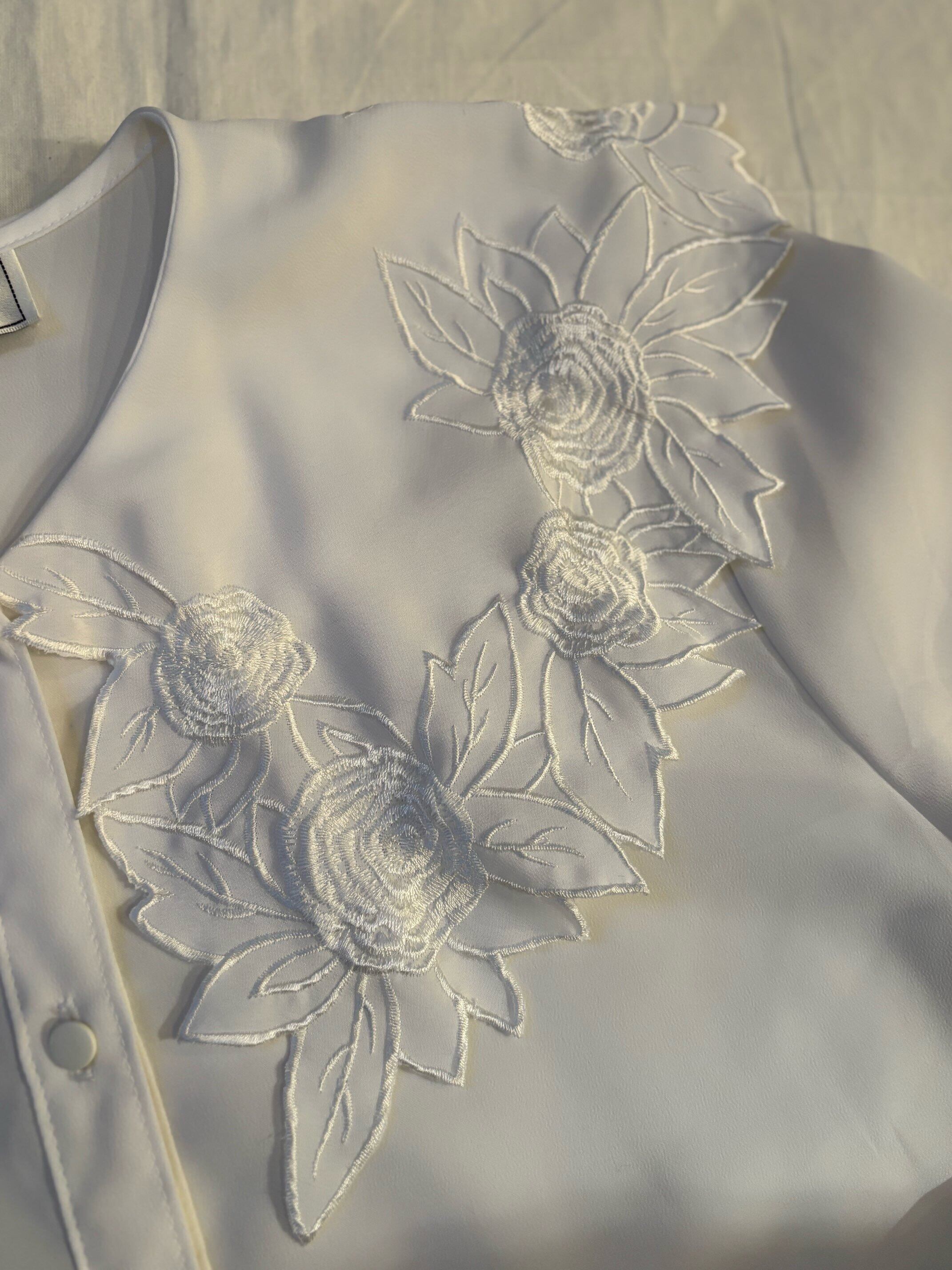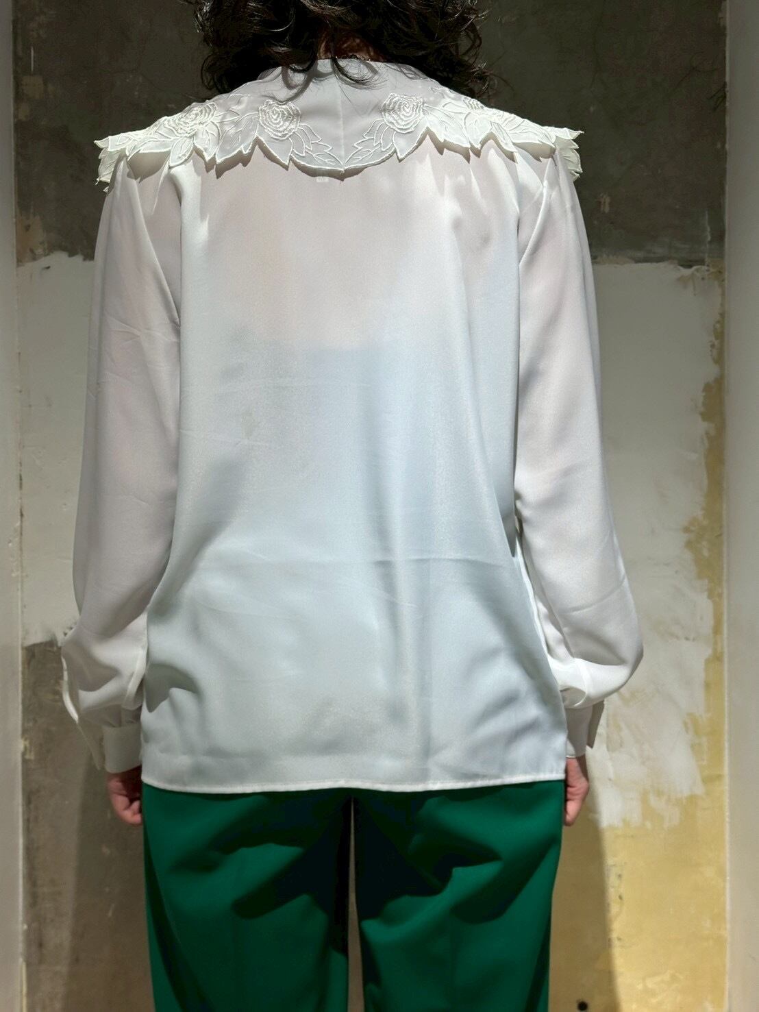 刺繍とカッティングされた大きな襟が可愛いブラウスです。ポリエステル素材なのでテロテロっとした生地感ですが全くシワにならない素材で出来ていてびっくりします笑。