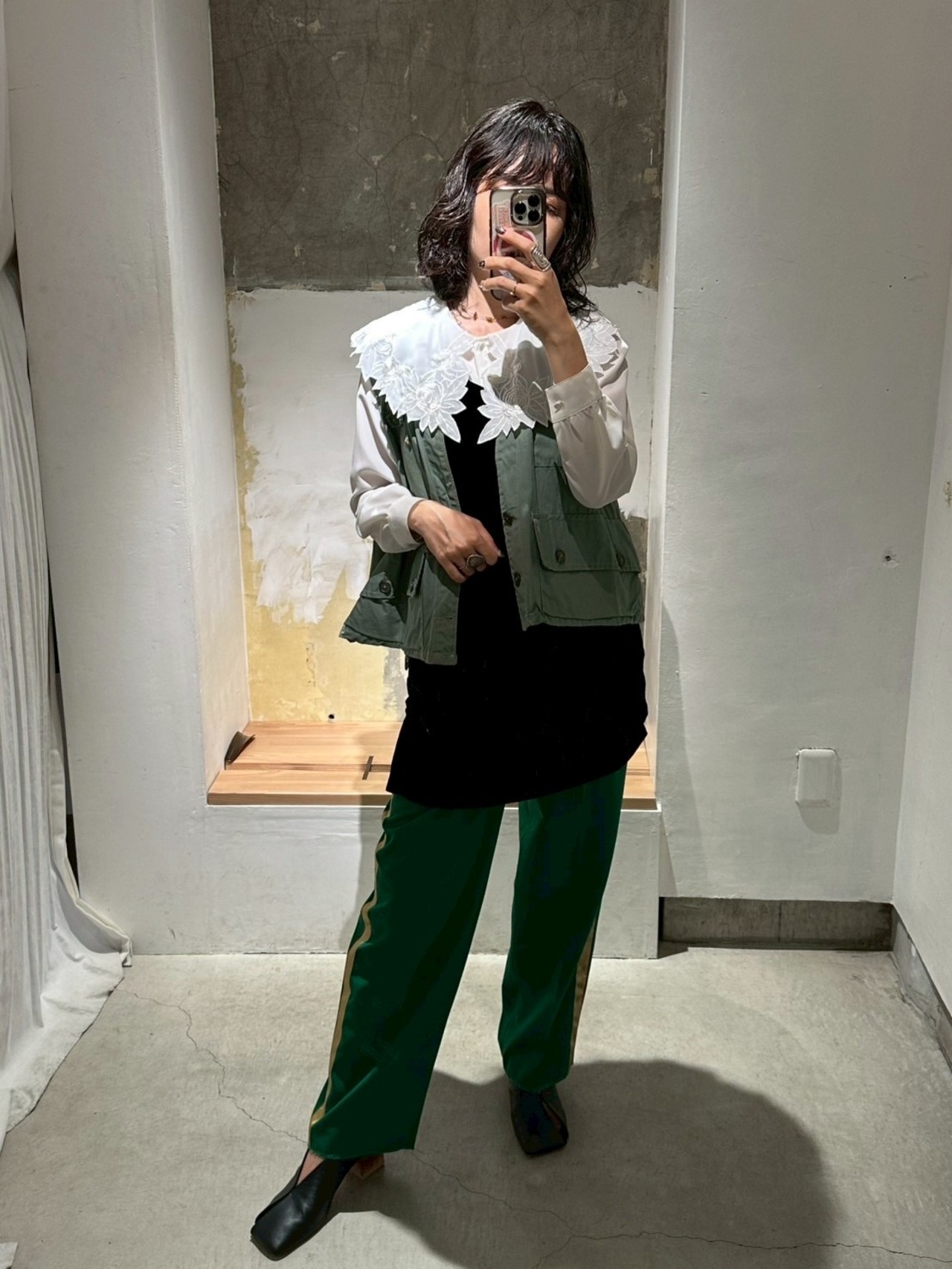 フェミニンなアイテムなので、あまり全身を甘くせず男前なstylingに合わせた方がしっくり来ると思います。スラックスやレザージャケットなどと合わせてもらえると甘い雰囲気が調和されてバランス良く着こなせると思います。