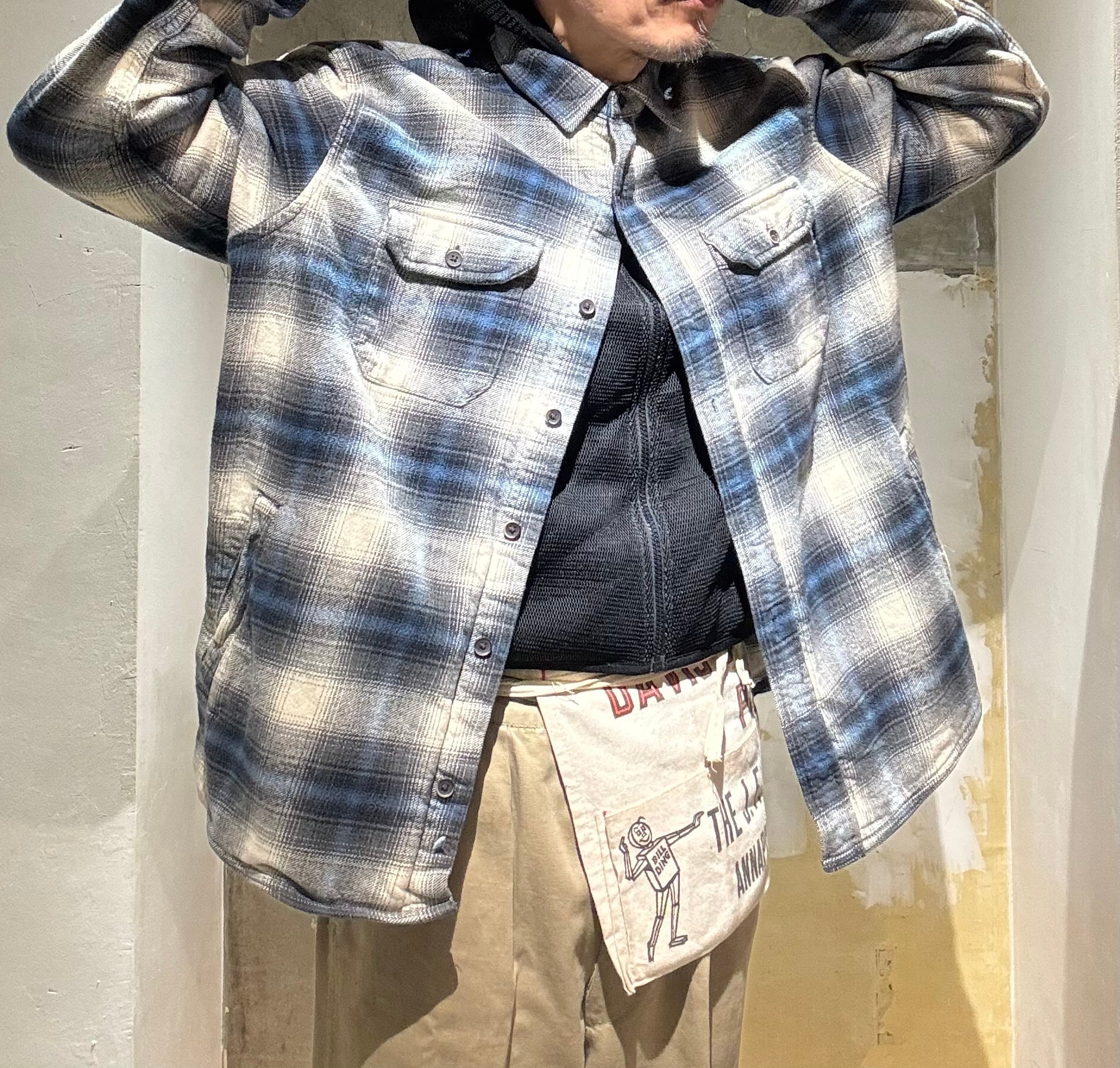 海岸にも程近い場所にあるブランドのようで、こちらのシャドーチェックもその景色に馴染みやすいアイテムですね。使い勝手も良さそうで、ヘビーフランネルでガシガシ着れるアイテムでありつつ、フロントにはポケットも付いていて暖かい東京などにはもってこいのアイテムだと思います。裾もスクエアでまっすぐカットされているので、羽織として使いやすいアイテムになっています。