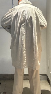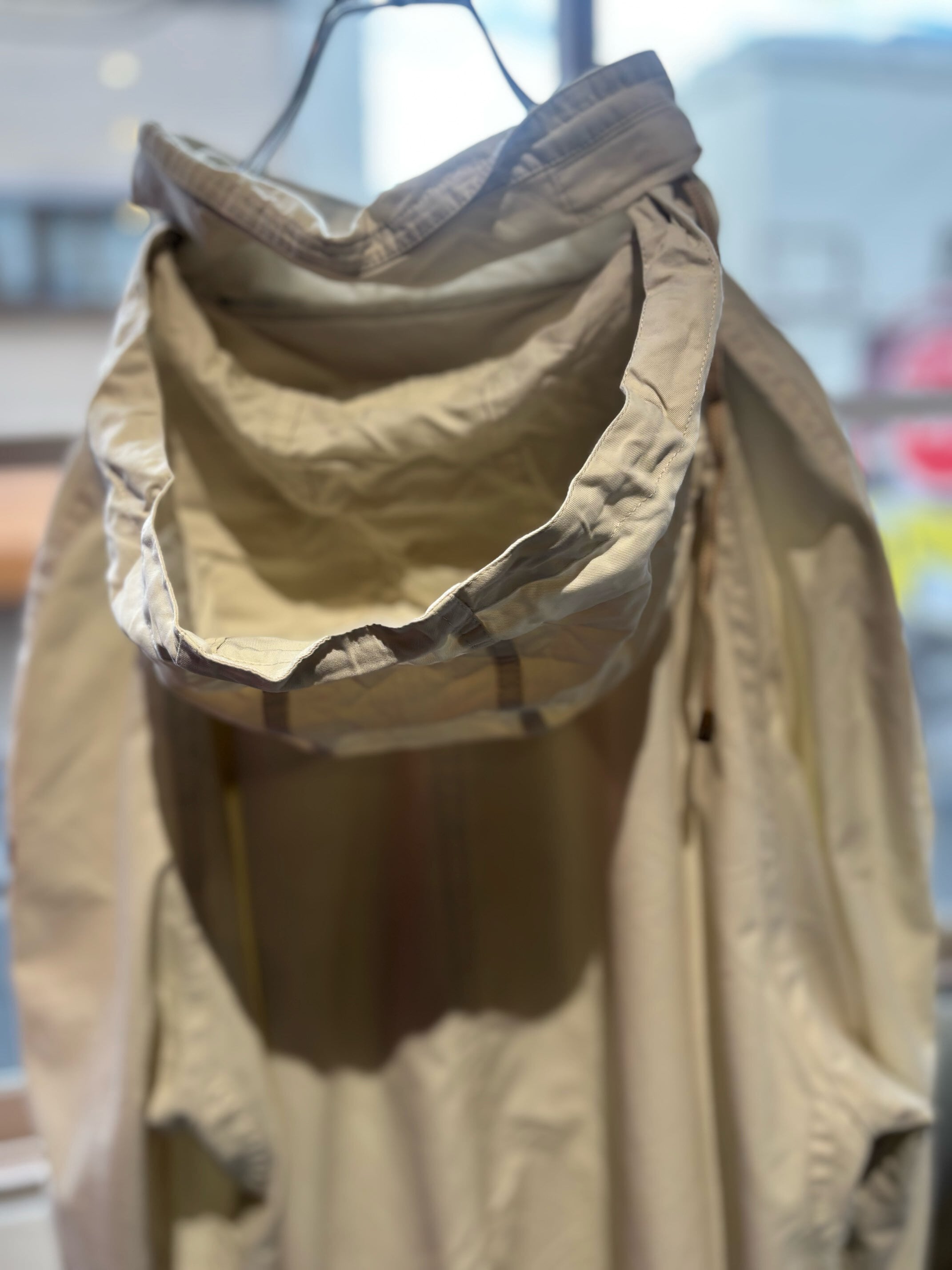 フードは収納されていて、高いネックに長めの着丈、シンプルなデザインですが袖にはブランドロゴのマークが入っています。素材は柔らかい素材なのでとても軽く、ゆったりした作りなのでインナーに厚手のものやインナーダウンなどを着て頂ければ冬も越せると思います。