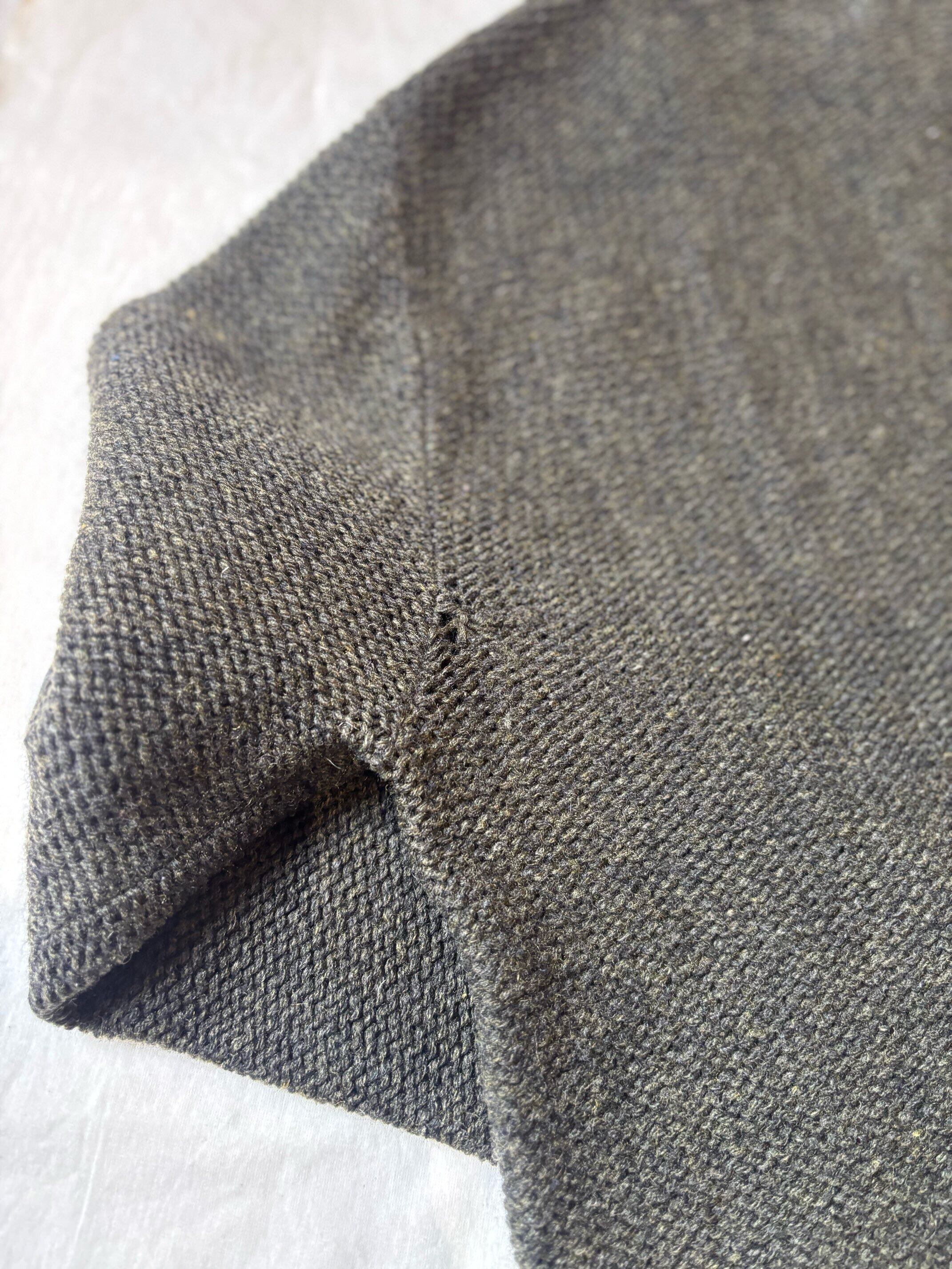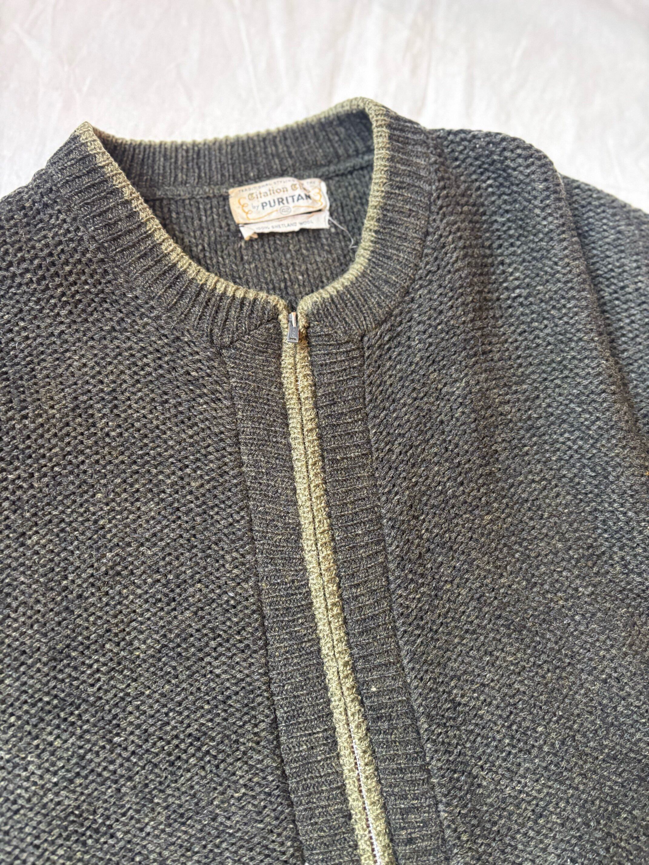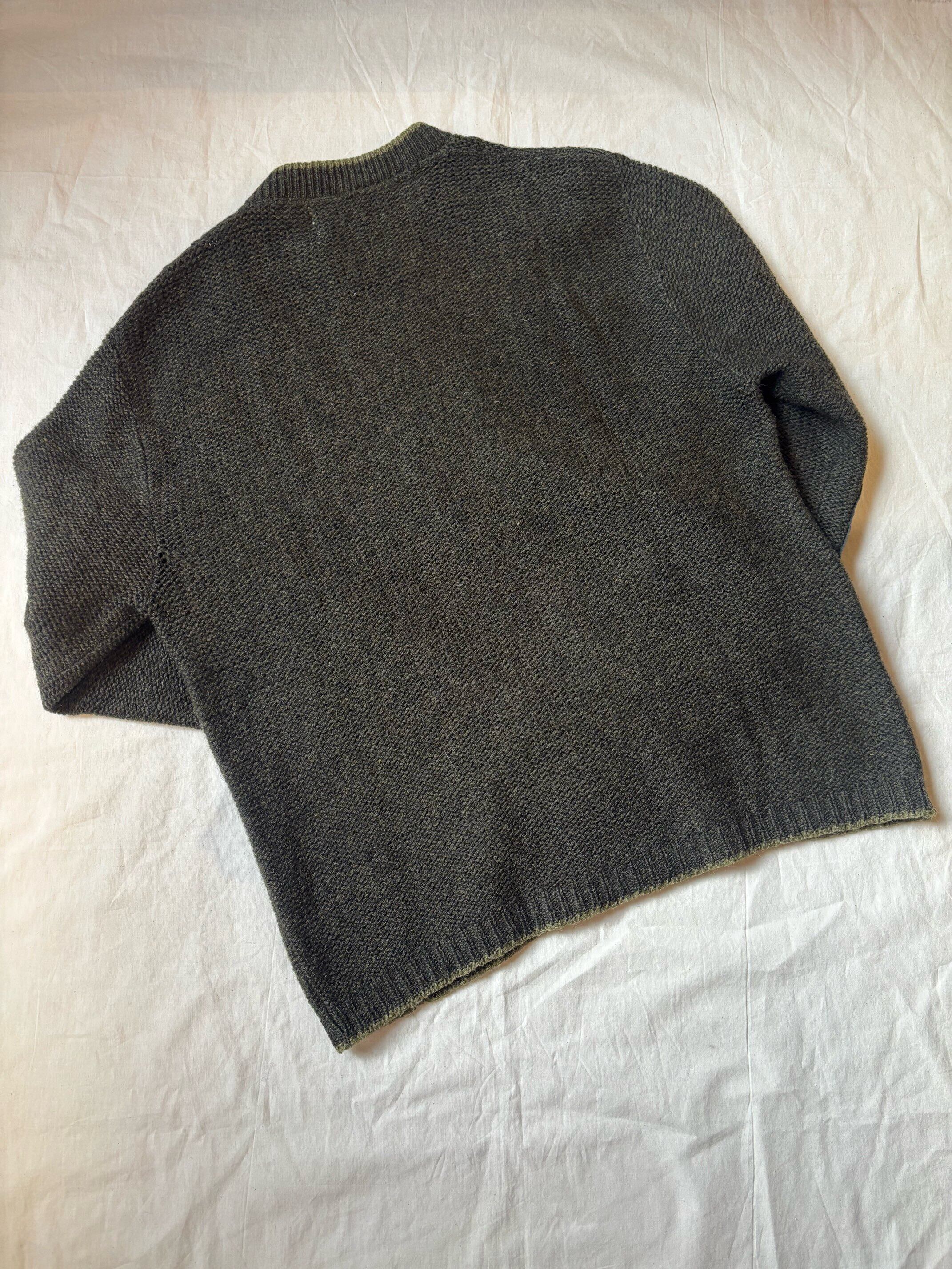 渋いカーキに明るめなグリーンのラインがフロントにかけて入る可愛いニットです。編みが荒めなミドルゲージのニットですが、袖やフロントなどに解れがあり、ビンテージらしいボロの雰囲気が出ていてとてもかっこいいニットだと思います。