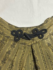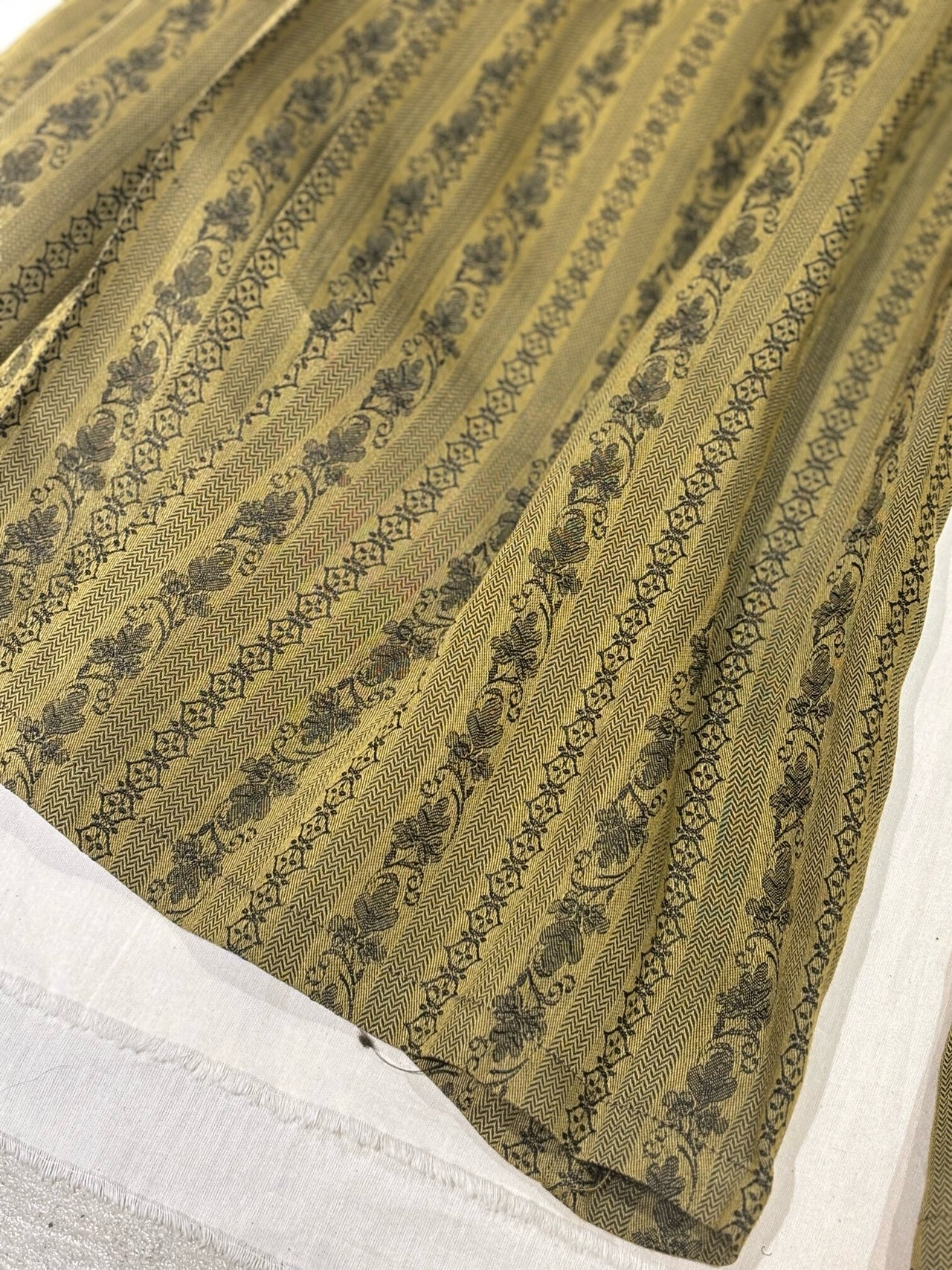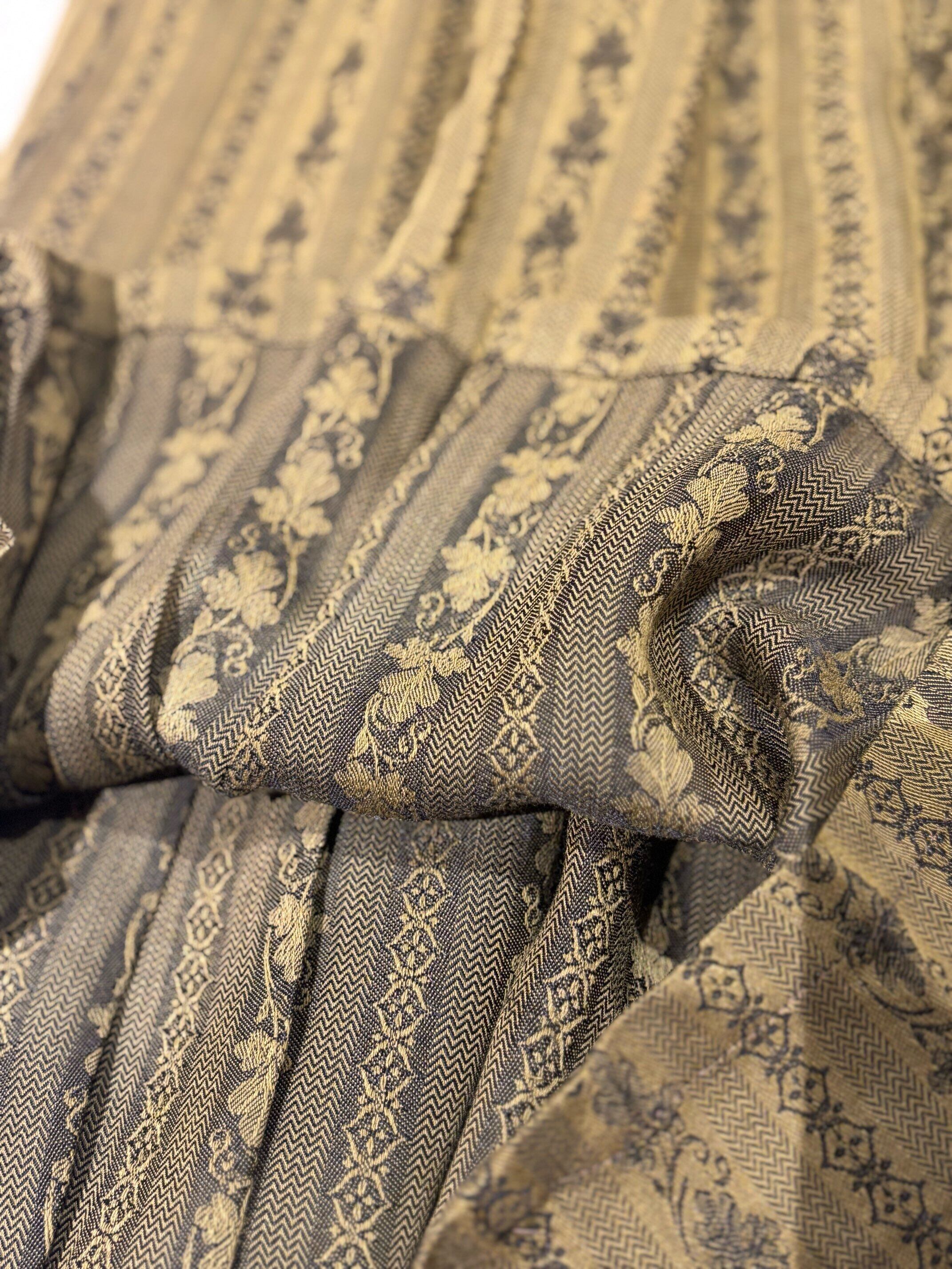 エスニックなテイストの花柄や草花にどの柄にウエストにはトグルボタン、ヘリンボーン織りの柄や独特な黄土色など、どこかオリエンタルな雰囲気のプリーツワイドパンツです。昔はこの丈をガウチョパンツと言っていたかもしれません。