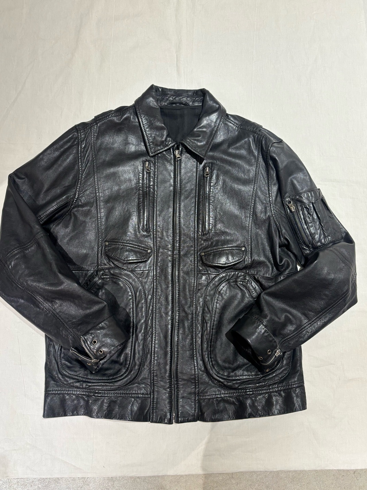 これだけ沢山のポケットやzipなどのギミックが付くレザージャケットはとても珍しくなかなか出てきません。レザーの中ではスペシャルなアイテムに入ると思います。