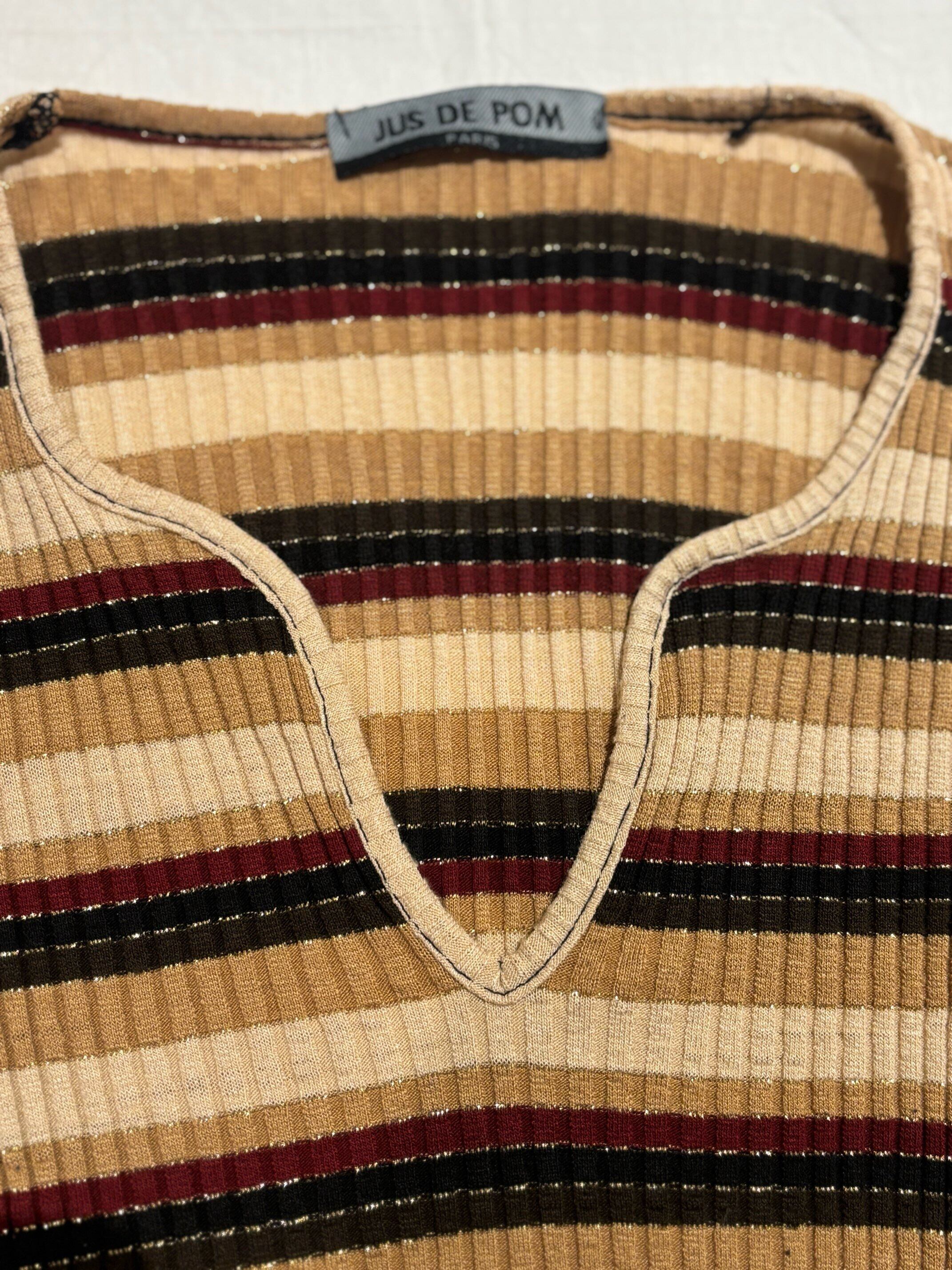 今っぽい柄のワイン×ブラウン×ブラック×ベージュにラメ糸が織られたリブボーダートップスです。ジャストで着るようになっているのでほとんどの方が着れるような伸びる素材で出来ています。