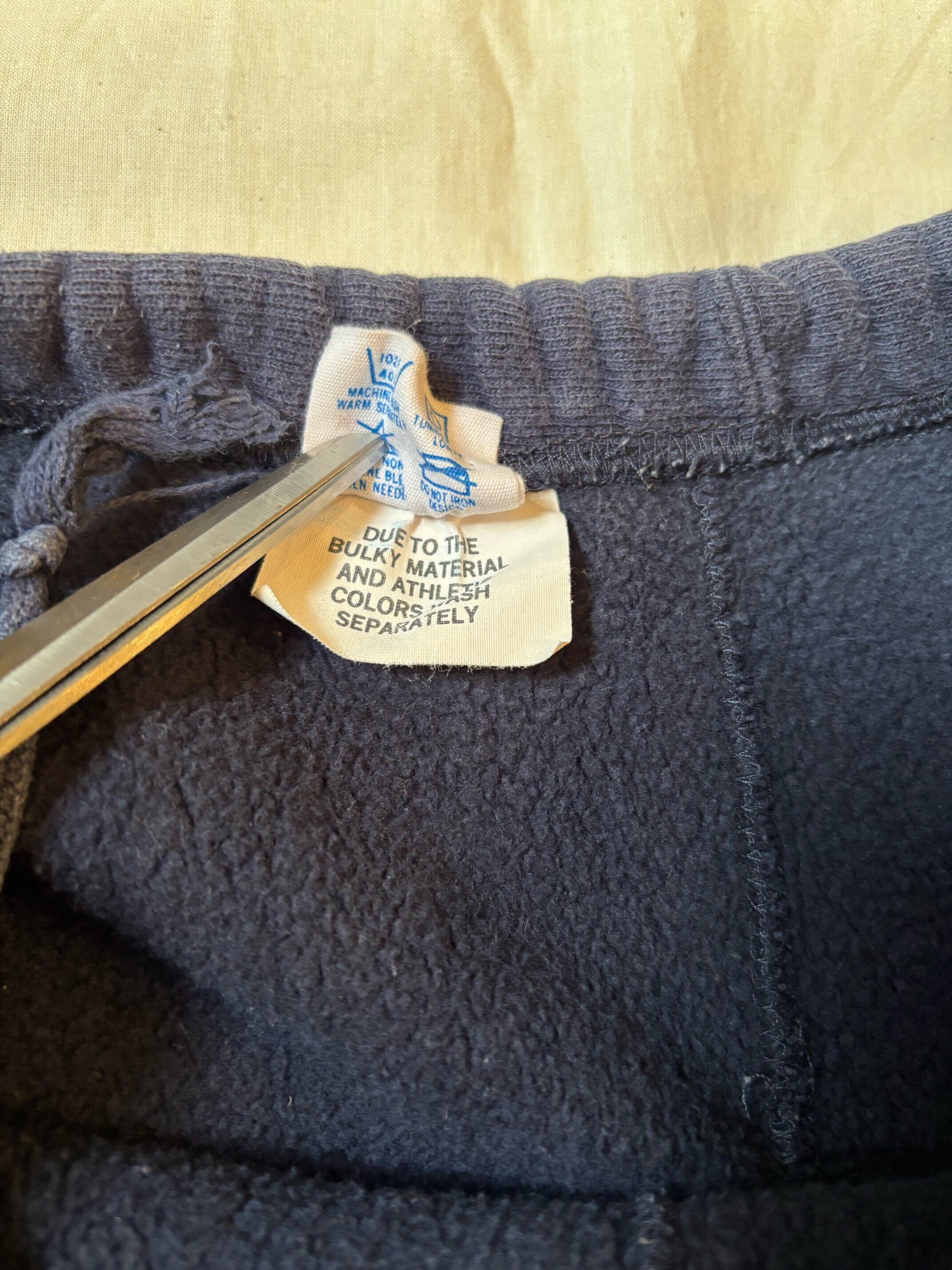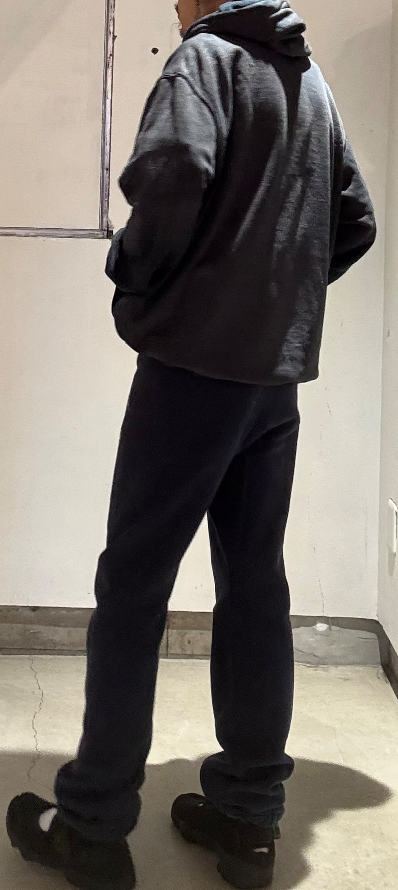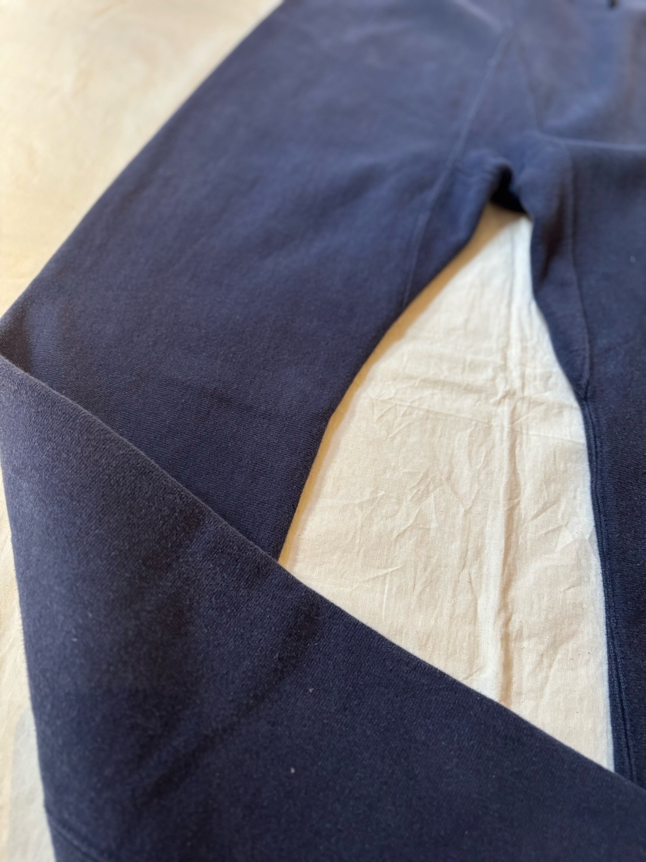紺色の3段プリント、アイビーなスウェットで良いですね。ただやはりビンテージスウェットらしく、洗濯と乾燥機によって縮んでいるのでシルエットは細めですが、それがビンテージの良さだと思うので好きな方にはとても可愛いスウェットパンツだと思います。