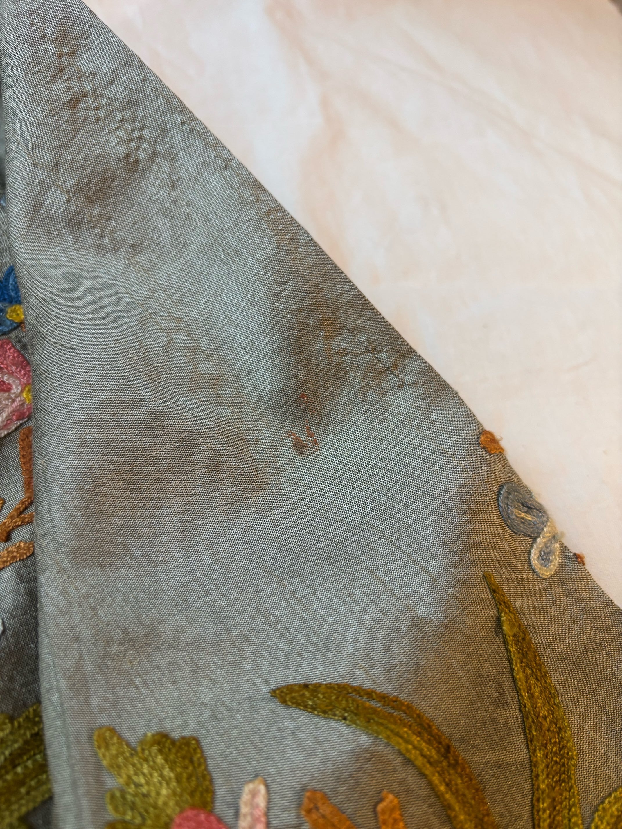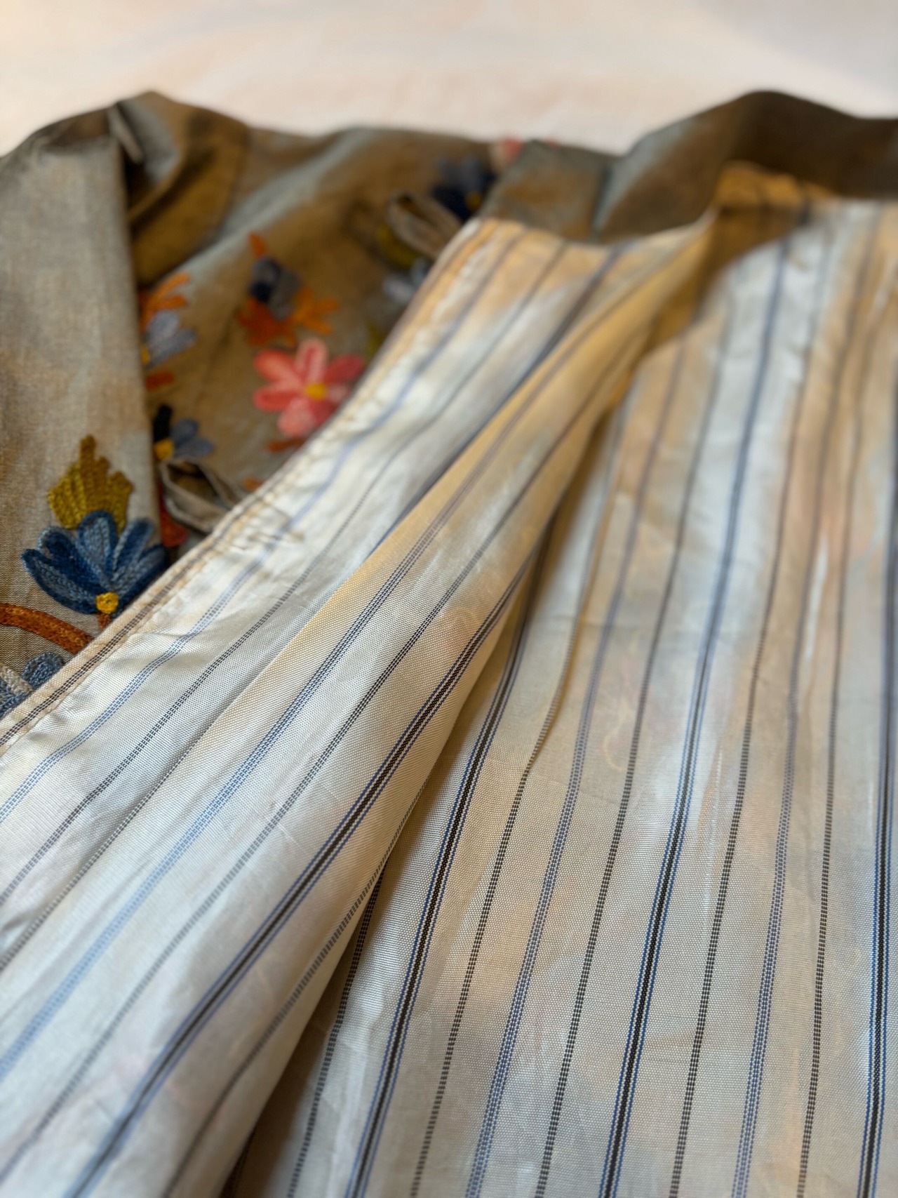 何度か入荷した事のあるカシミール刺繍のジャケットですが、当然のことながら年々見かける機会も少なくなってきました。atsuraeではシルクボディのものは初めての入荷になります。裏地のストライプの生地などから多分50年代頃のものだと思うので、年代を考えると綺麗な状態だと思います。
