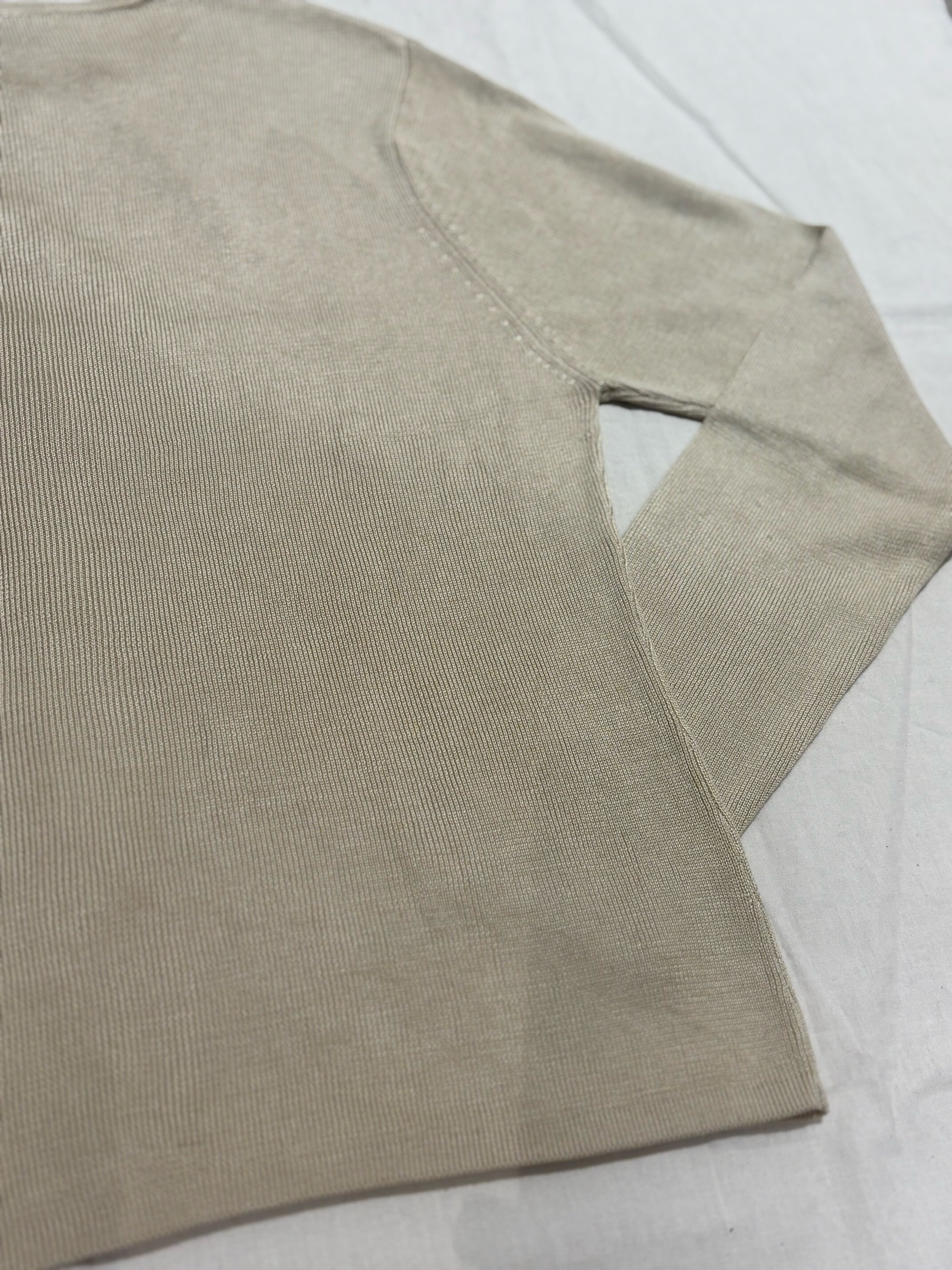 薄いベージュのような濃いめなアイボリーのような絶妙な色のシルクカーディガンで、こちらのシルクは洗えるのが嬉しいポイントです。