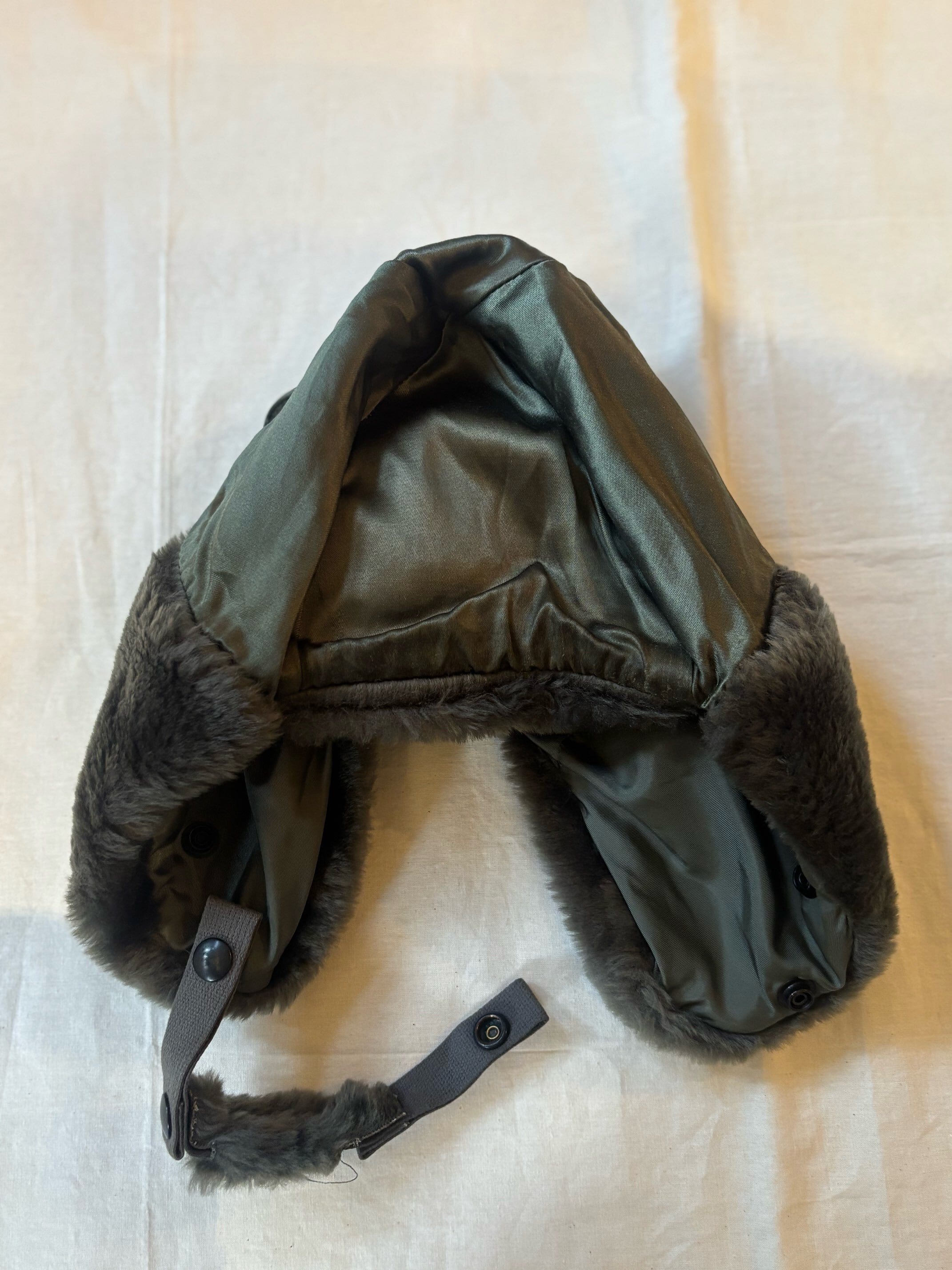 ma-1のような光沢のある質感のナイロン素材にポリエステルのボアが付いたヘルメットキャップ。米空軍で使用される防寒帽です。耳回りやチンストラップなどにボアライナーが付き被り心地が非常に良いです。機能性やデザイン性を兼ね備えたアイテムでアウトドアや釣りの際にも最適です。