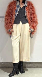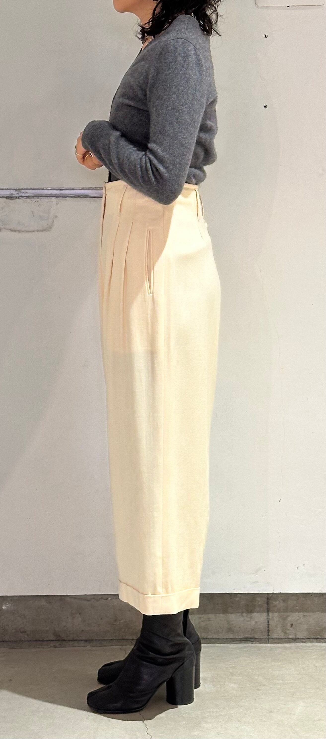 アイボリーのヘリンボーンシルクの贅沢な生地に深めな2プリーツワイドシルエットな半端丈トラウザーズで以外になかなか出てこないアイテムだと思います。どちらかと言うとピタッとしたスパッツのカプリパンツが今はトレンドですが、なかなか着る人が限られるアイテムだと思うのでこの位のゆとり感のあるシルエットでしたら取り入れやすいかなと思います。