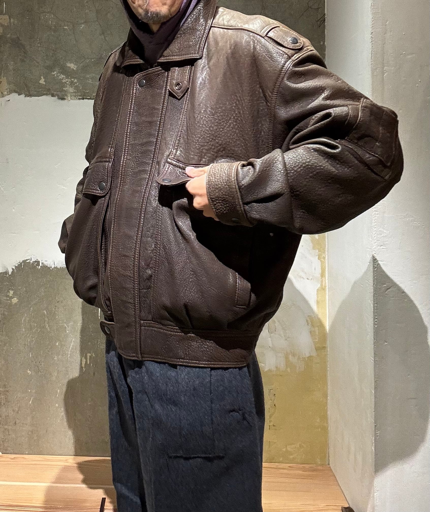 ゆったり目に着てスウェットに合わせたりデニムに合わせたりと何にでも合うレザージャケットだと思います。