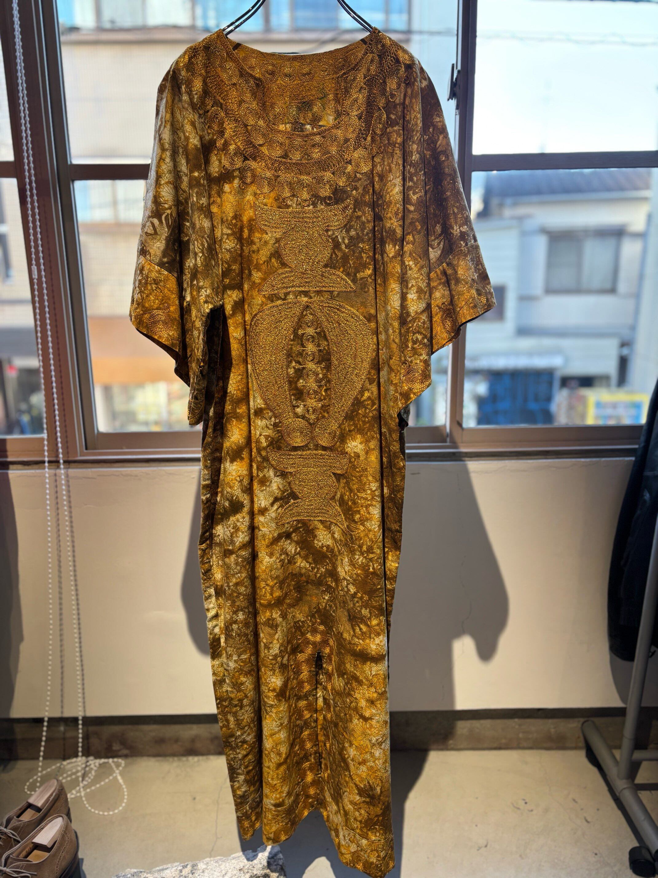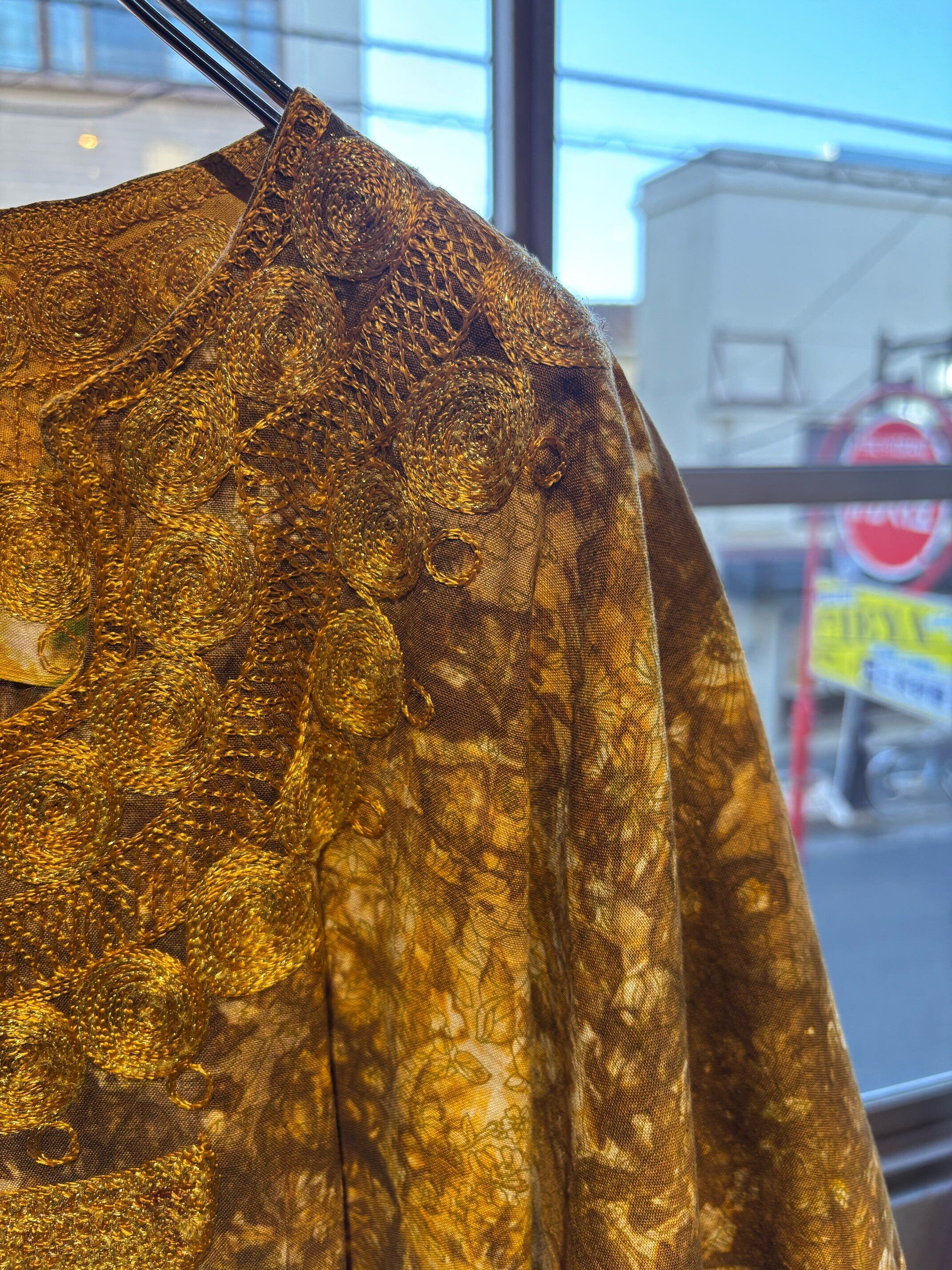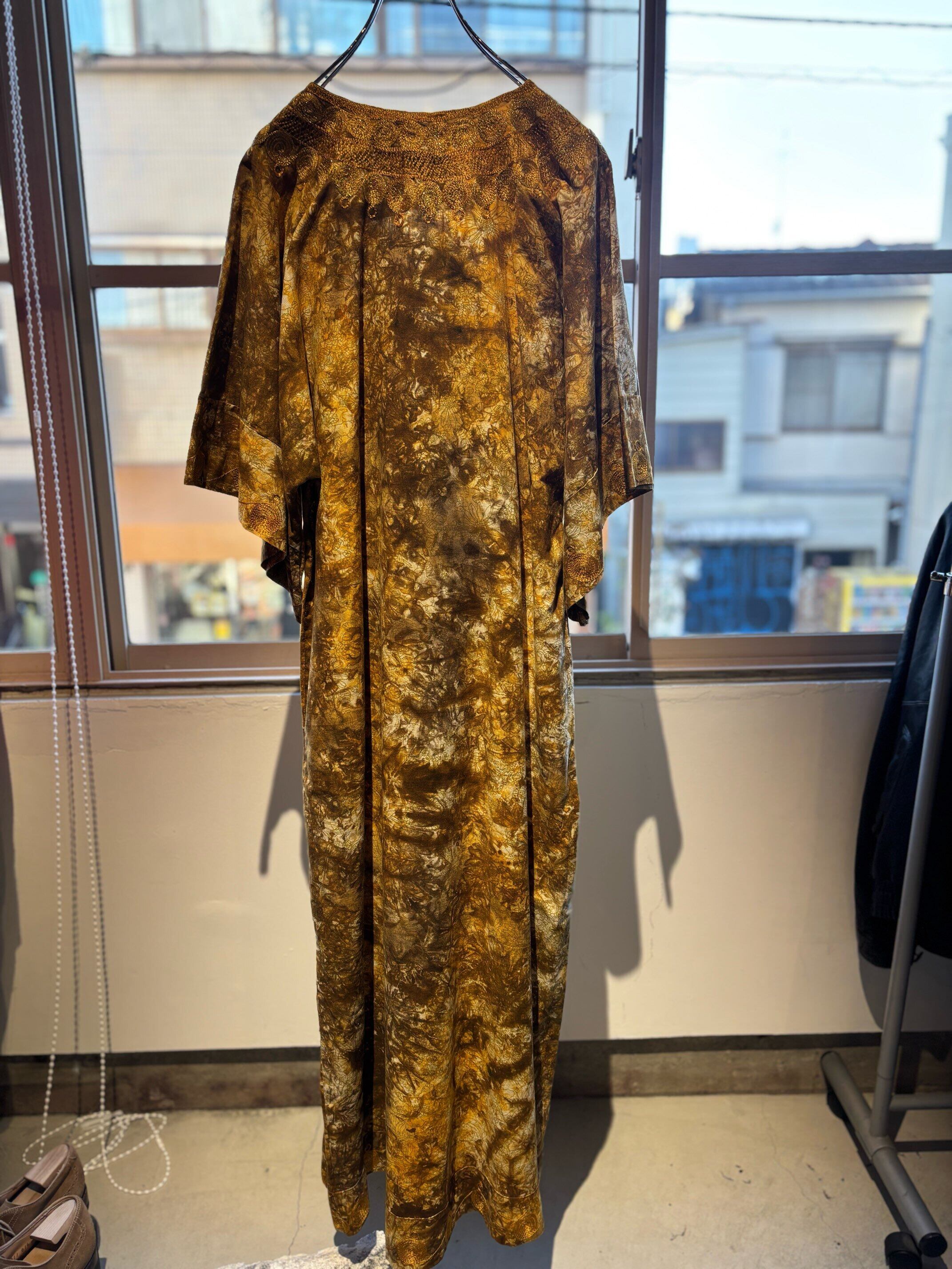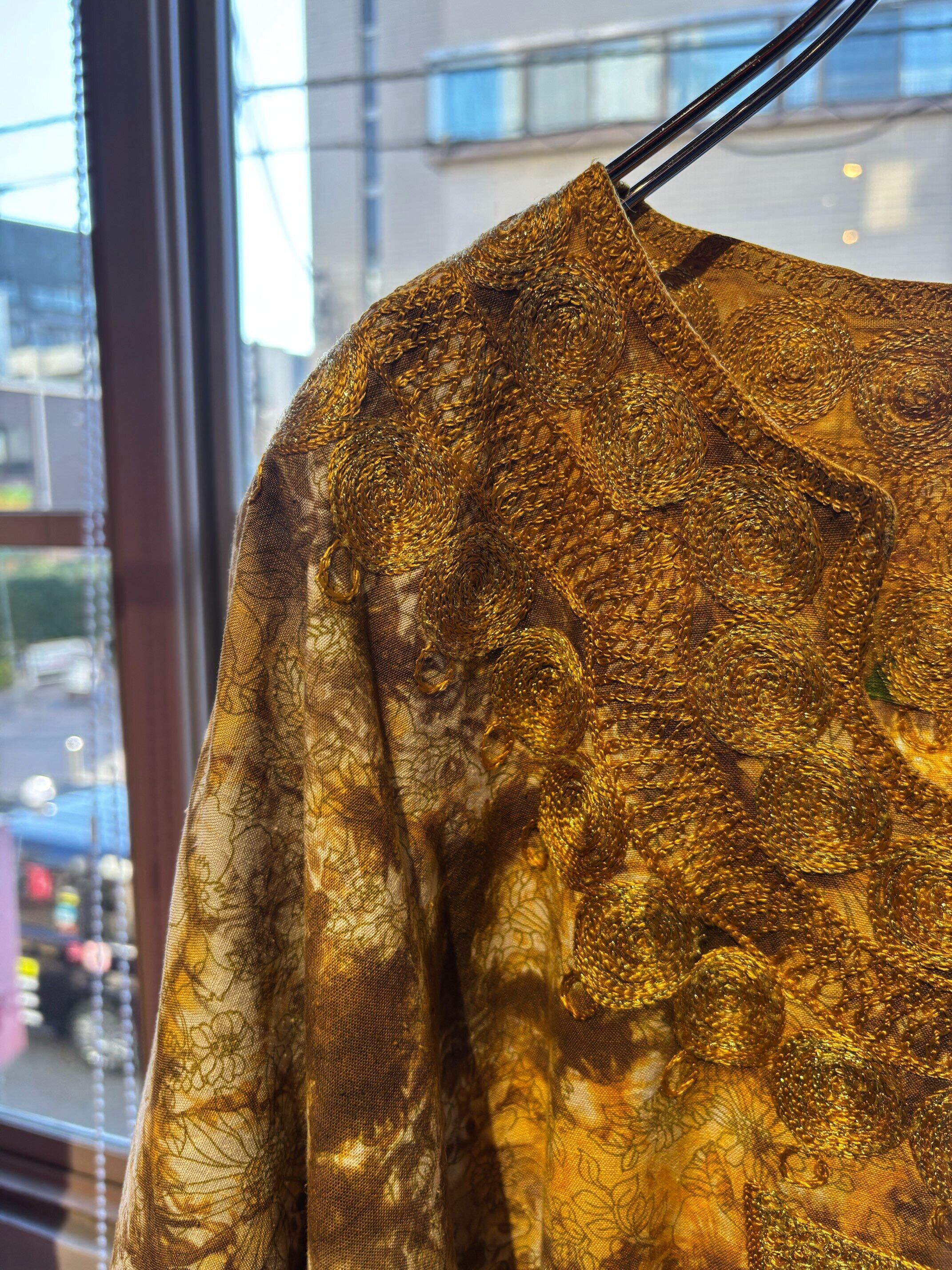 パキスタンのヴィンテージドレス、圧巻の刺繍が胸や袖、裾周り、首元までびっしりと縫われています。とんでもない刺繍です。ボディはコットンだと思いますが、薄い花柄にタイダイのような色がのせられ、全体がイエロー〜ブラウンのカラーリングでとても綺麗です。